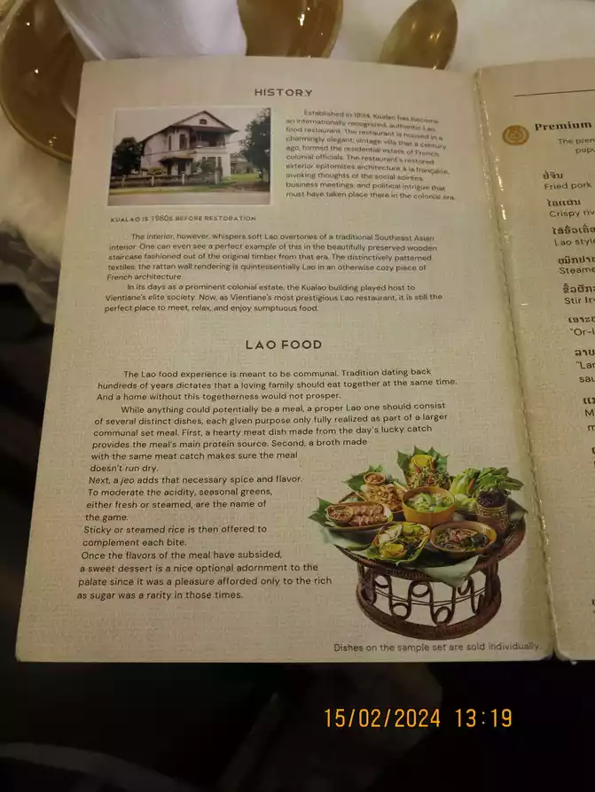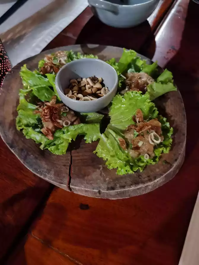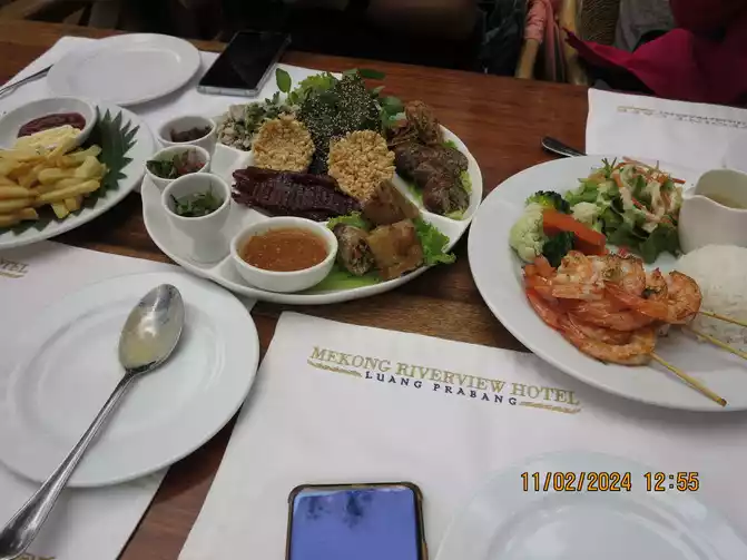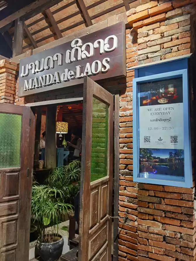 Continuing forward, we arrived at Kua, Laos Lao Restaurant has a low-key entrance. It is said to be a state banquet restaurant. The dishes are authentic Laotian dishes, and the building is a bit unique. The dishes are not too to our taste, and the price is a bit expensive. The most unique Laotian dish is larb, which has various larb, pork, beef, chicken, fish, etc. Eat it wrapped with lettuce, cucumber and various spices. The black glutinous rice served in a small bamboo basket tastes good. I heard that there will be performances starting at 7pm, including traditional percussion and traditional dances. While eating and watching the performances, you can feel the atmosphere of the Luang Prabang Dynasty. The price is probably a little expensive, and there are almost no local diners in the restaurant, so we are considered a state banquet restaurant.