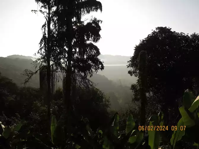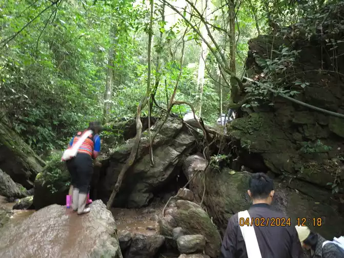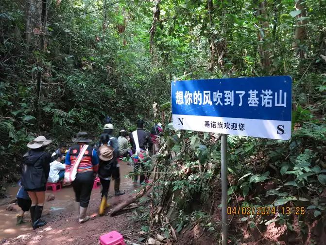 The next day: We drove to the Jino Mountain Rainforest for hiking early in the morning. We made an appointment with a Jino guide in advance. It took us more than half an hour to reach the small town on the roadside at the entrance of the village. The guide was actually waiting for us on the roadside. We first bought overshoes and then went to their village - Baduo Village. It was almost Chinese New Year and the whole village had just slaughtered two cows and was dividing the cows in the square. It was a primitive atmosphere. The villagers are all Jinuo people, and they say they still have a system of shared distribution. Our guide's name is Youzhou. They don't have surnames. The Jinuo were officially recognized as a single ethnic group in 1979, the last ethnic group to be recognized in China. The Jinuo population in China is over 20,000. They appear to have a language but no written language. Our guide explained that they were previously considered a single tribe. We followed our guide up the mountain to an intersection, where we parked and began our rainforest hike. There are two hiking routes here, 4km and 8km. We took the 4km route with my mom and baby. Our guide, a knife strapped to his waist, led us downhill, through the rubber forests on the hillside, and finally to the valley floor where we began our tropical rainforest adventure. We basically went downhill, waded through the water, played, ate, and climbed, all while walking through the rainforest. This is the territory of the Jinuo people. The valley also had some village-built activities, such as swings, tree climbing, and bamboo rafting, all included in the guide fee. My baby had a blast.