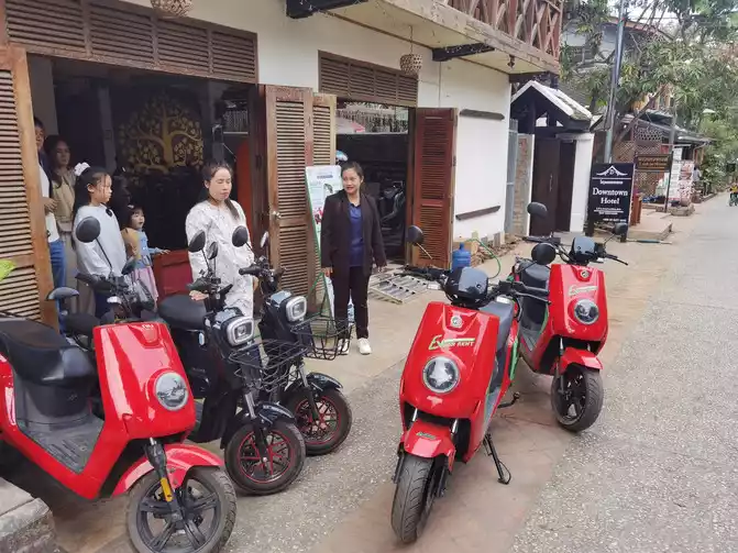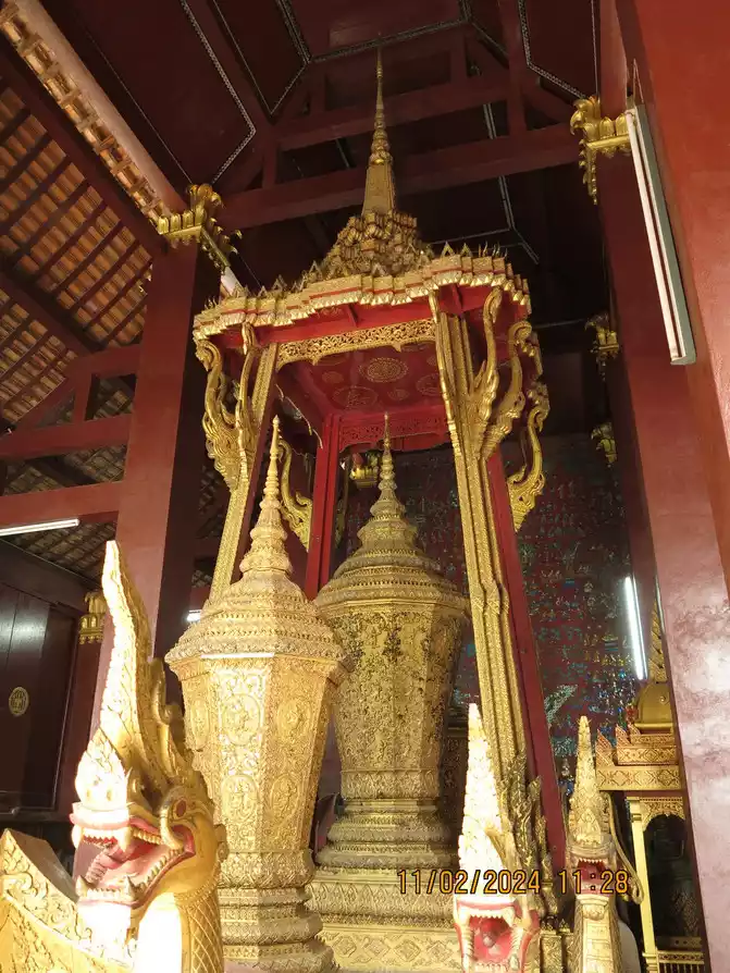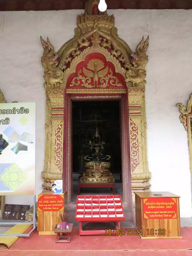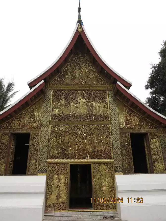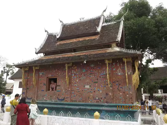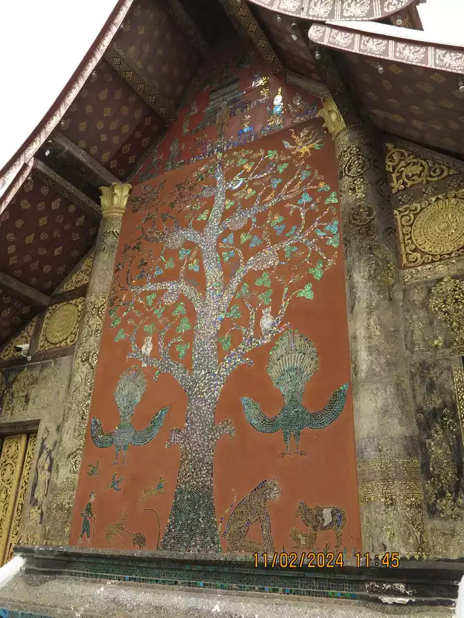 I found a Chinese clothing store owner and exchanged 3,000 yuan for him. The owner asked us to transfer the money directly to his domestic account via WeChat and did not accept cash. The exchange rate was good, 1:3100. I guess he laundered the money back to China directly. His business is good. We rode our motorbike back to the hotel to check out, and then began our motorbike tour with my mother and baby. The electric scooter was indeed convenient, and we arrived at Wat Xieng Thong, just a few kilometers away, in no time. This is considered the busiest and most magnificent temple in Luang Prabang's ancient city, and is often visited by tourists. Built by King Setthathirat in 1560, it remained the royal family's private property until 1975. Wat Xieng Thong is located near the Mekong River. The coronation, wedding, and funeral ceremonies of successive kings were held here. The first building upon entering houses the king's funeral utensils, and you can also see the magnificent hearse. The temple is not very large, but it houses several buildings and pagodas. The interior of the main hall is magnificent, and the back wall is inlaid with a magnificent Tree of Life pattern.
