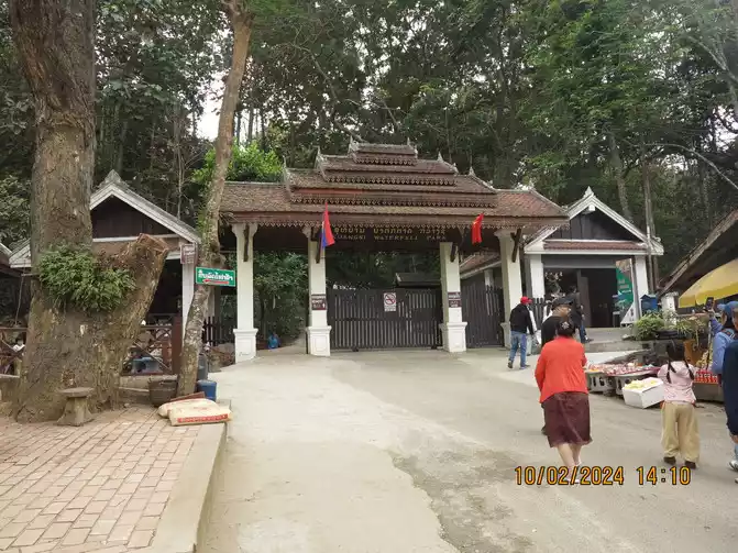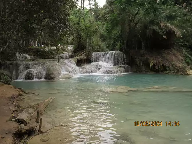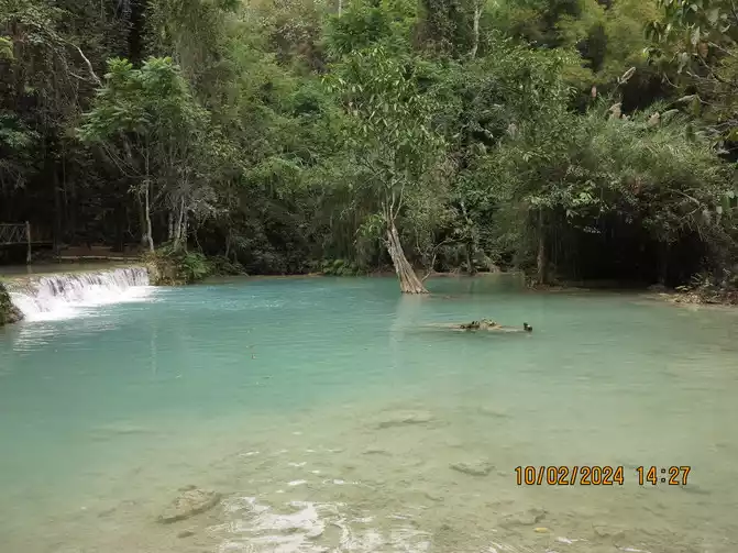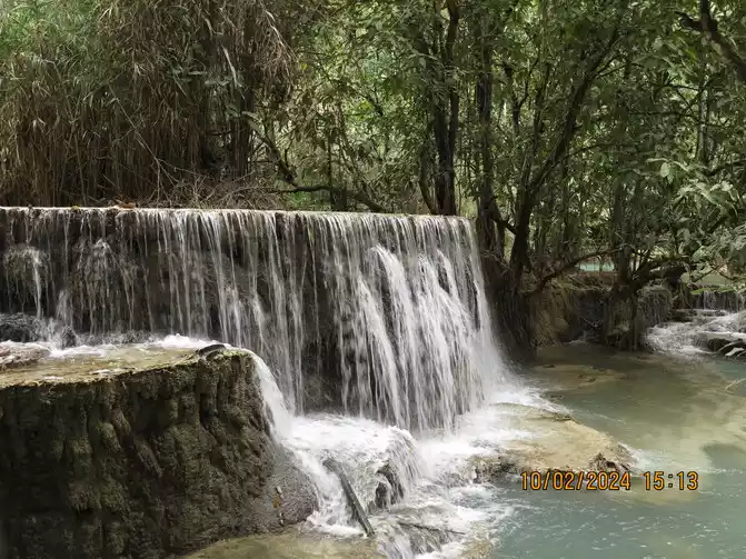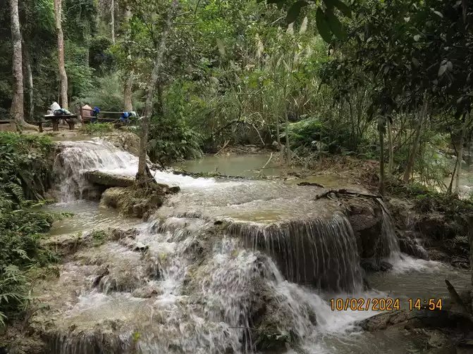 The driver arrived on time. Luang Prabang is primarily a tourist destination, but he was very polite. The road was a dusty one, a dirt road, and we sped along along the Mekong River. The road was packed with tourists heading to Kuang Si Falls, using tuk-tuks, vans, motorcycles, and bicycles. The tourists were all very cheerful and greeted each other. We arrived smoothly in about 40 minutes. The entrance fee was 20,000 kip, and a shuttle bus was included.