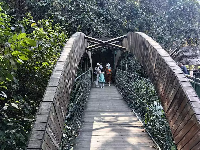 In the tropical valley rainforest, the pristine forest blocks out the sun, and visitors can climb onto the elevated trestle bridge to explore.