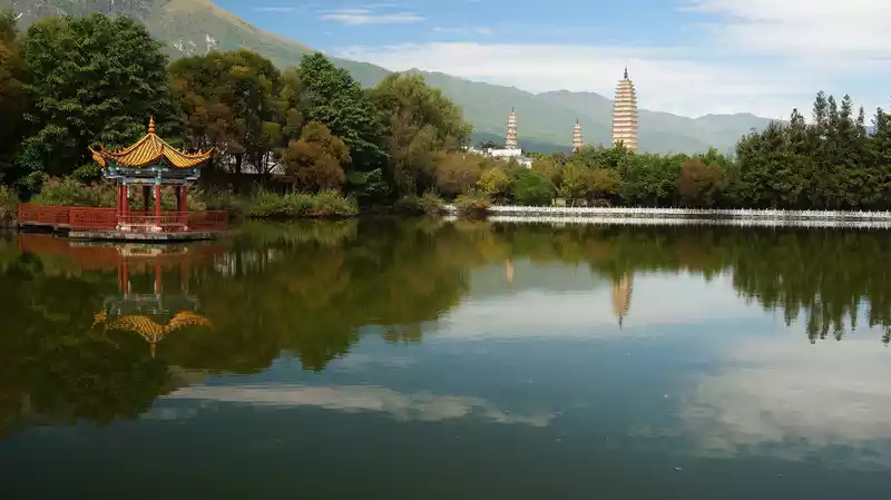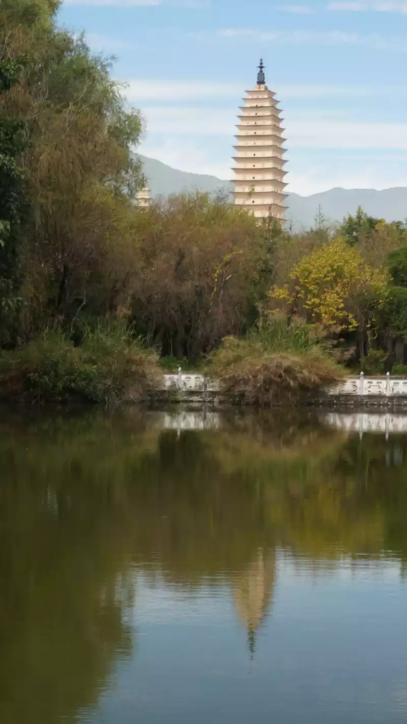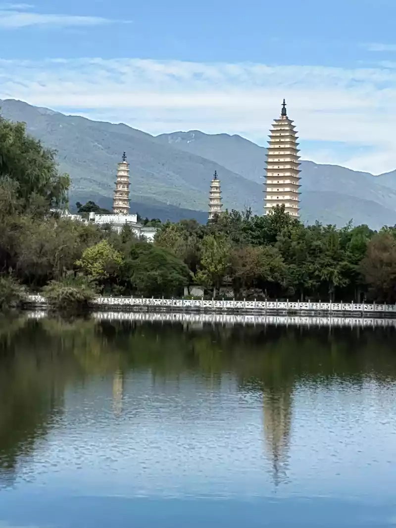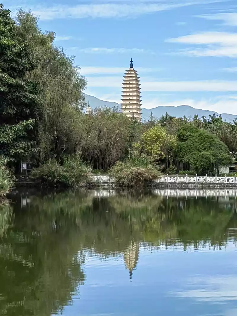 Three Pagodas of Chongsheng Temple src="/travelogue/China/Yunnan/4137542/56.webp">In the Chongsheng Temple scenic area, the three pagodas are so tall and spaced apart that capturing them as a backdrop is difficult. However, in the Reflection Park, visitors can capture not only the three pagodas but also their reflections, as well as the Yangbo Pavilion, the small island, and their reflections. src="/travelogue/China/Yunnan/4137542/56.webp">Today's weather was beautiful, though a slight breeze kept the water from reaching mirror-like level, resulting in blurry reflections.