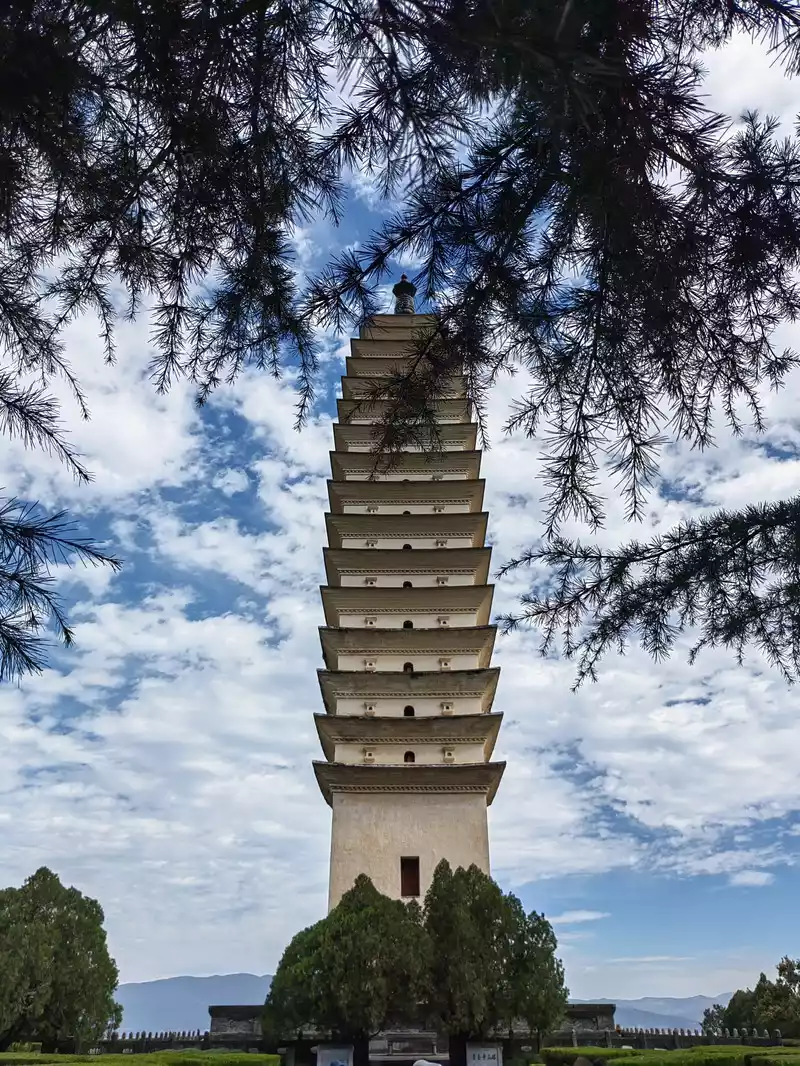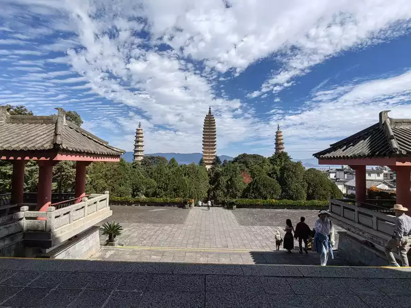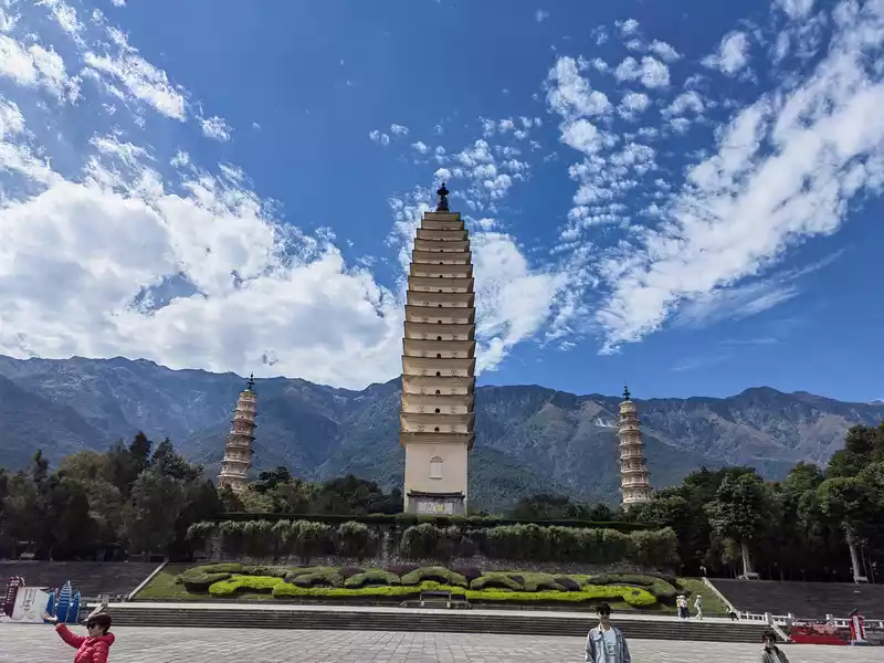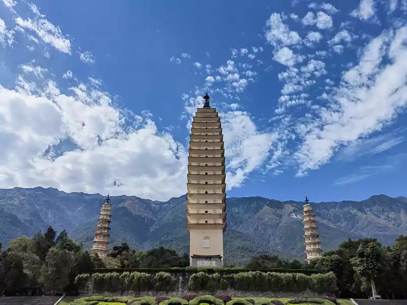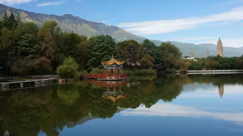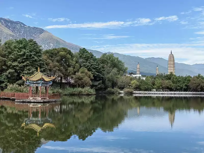 Three Pagodas of Chongsheng Temple src="/travelogue/China/Yunnan/4137542/56.webp">In the Chongsheng Temple scenic area, the three pagodas are so tall and spaced apart that capturing them as a backdrop is difficult. However, in the Reflection Park, visitors can capture not only the three pagodas but also their reflections, as well as the Yangbo Pavilion, the small island, and their reflections. src="/travelogue/China/Yunnan/4137542/56.webp">Today's weather was beautiful, though a slight breeze kept the water from reaching mirror-like level, resulting in blurry reflections.