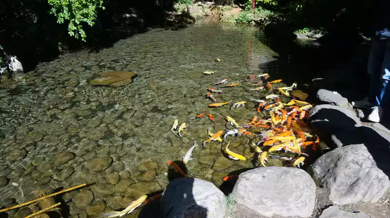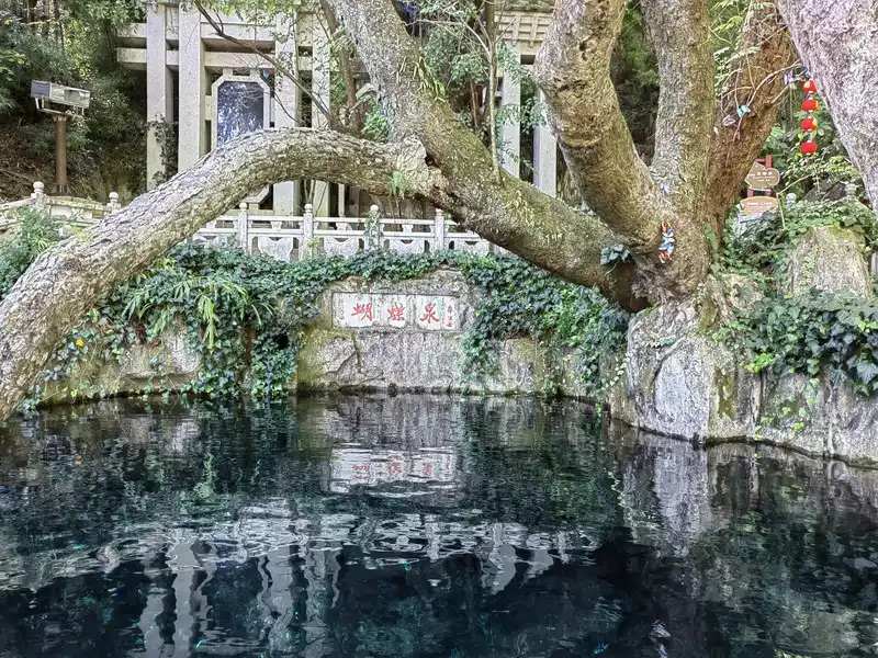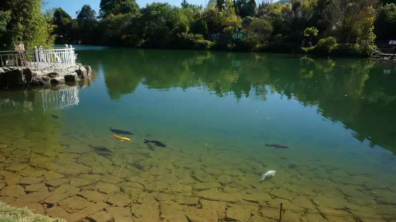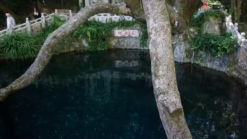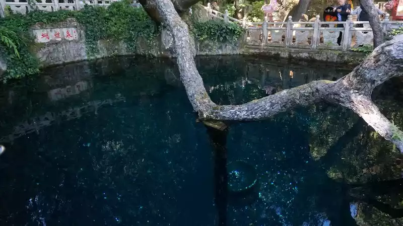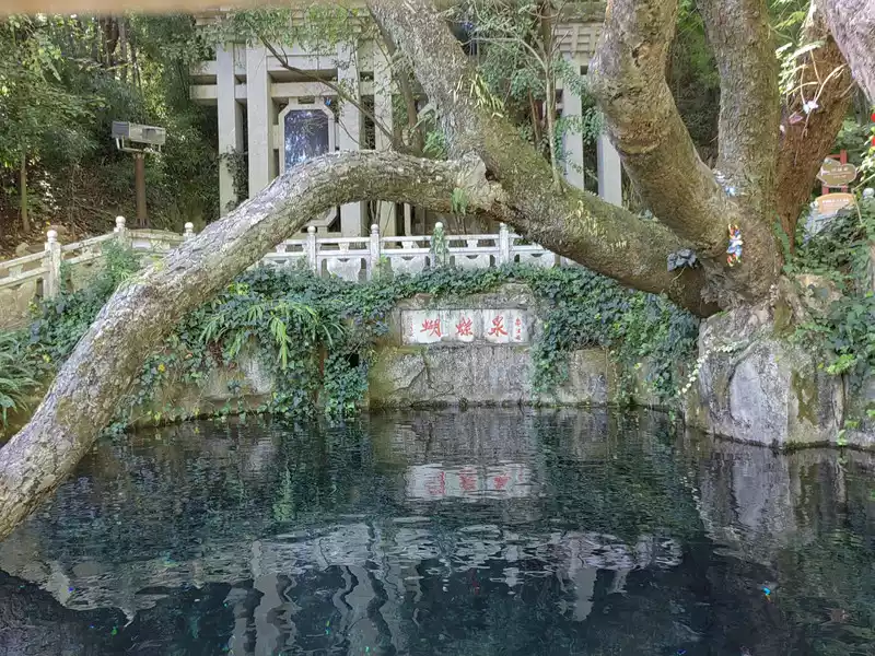 The entrance to the scenic area is a little distance away from the spring, about ten minutes' walk. There are also electric cars that can reach the spring, but the wait time is longer during the off-season. This is a stone archway with strong Dali Bai architectural features and a typical example of Dali Bai architecture. The entire stone archway is built with local Dali bluestone strips. The three characters "Butterfly Spring" in the middle are inscribed by the great writer Guo Moruo. It is a square spring pool with an area of more than 50 square meters and a water depth of six meters. The spring water is crystal clear, with strings of silver bubbles bubbling out from time to time. The rich ions give the water a fantastical blue-green color, making it quite beautiful.