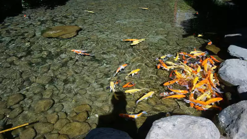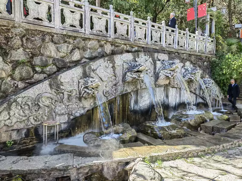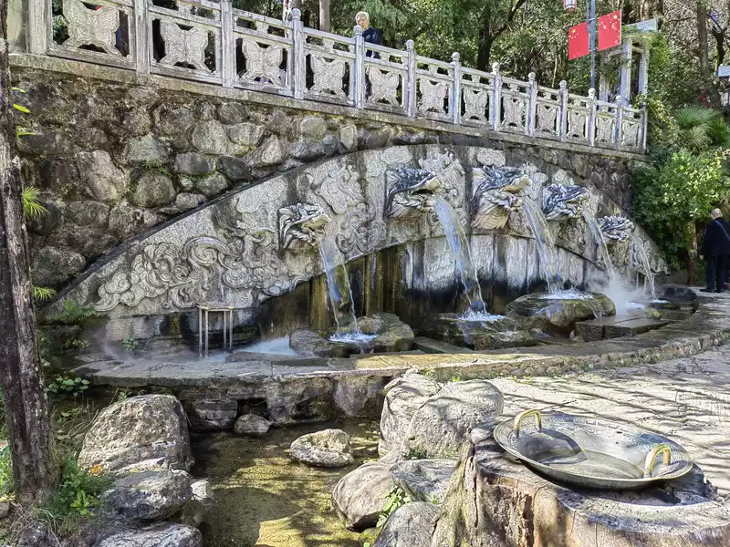 Five Dragon Pond: Water from the Butterfly Spring overflows through five stone dragon heads, gushing down from their mouths in a scene reminiscent of five dragons spitting water and splashing waves. Five small pools below, with water splashing in all directions, create the illusion of "clear springs flowing over rocks."