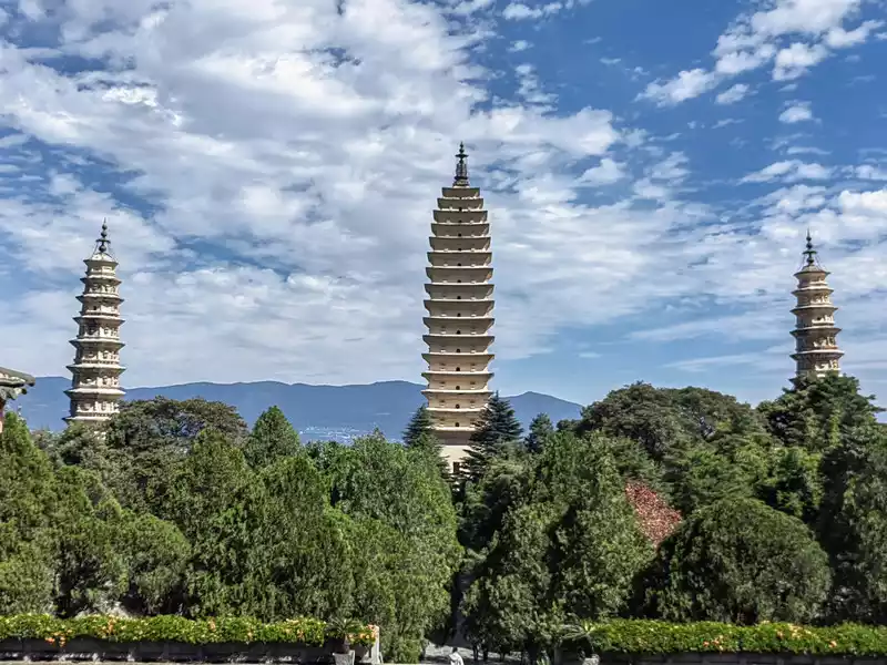 The Three Pagodas of Chongsheng Temple are located 1.5 kilometers northwest of Dali Ancient Town, backed by Cangshan Mountain to the west, facing Erhai Lake to the east, flanked by Taoxi River to the south, and Meixi River to the north. The three towers consist of one large and two smaller ones, standing in a tripod-like formation. The large tower stands in the center, protruding forward, while the two smaller towers flanked it to the north and south. The large tower, named "Qianxun Tower," has different records of its construction date, but experts have determined that it most likely dates to the Quanfengyou period of the Nanzhao dynasty (823-859 AD). The Qianxun Tower is a 16-story, square, dense-eaves, hollow brick tower, a typical Tang Dynasty architectural style, standing 69.13 meters tall. The two smaller towers to the north and south, with their tapered outlines, are typical Song Dynasty architectural styles. Constructed during the reigns of Duan Zhengyan and Duan Zhengxing of the Dali Kingdom (1108-1172 AD), the two smaller towers are 97 meters apart and each stands 42.19 meters tall. They form a pair of 10-story, octagonal, dense-eaves brick towers.