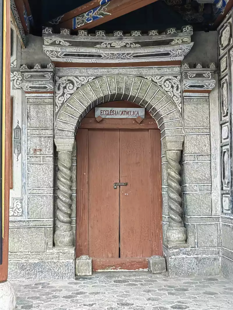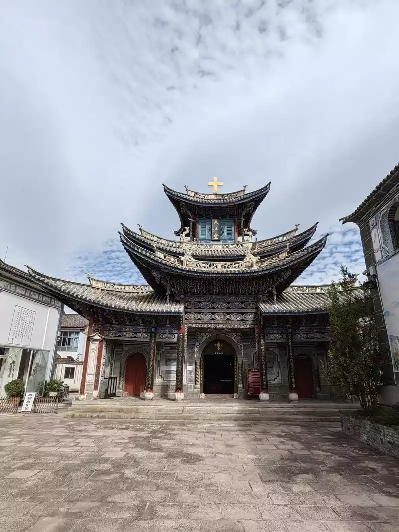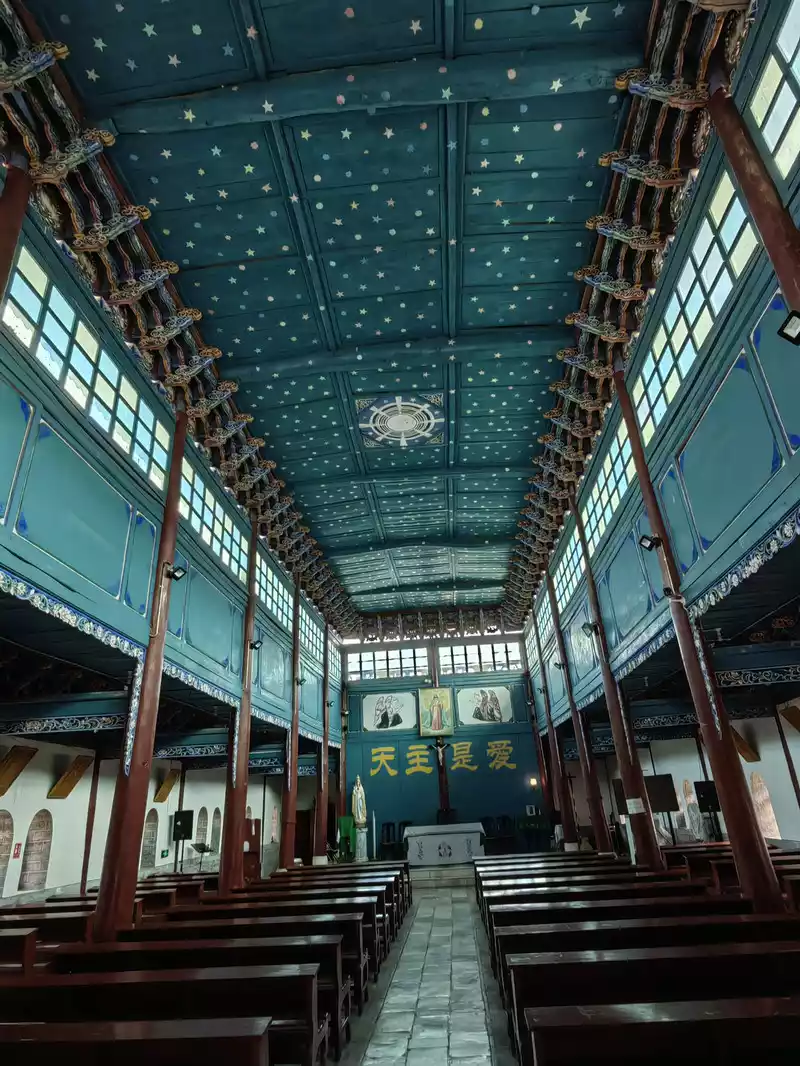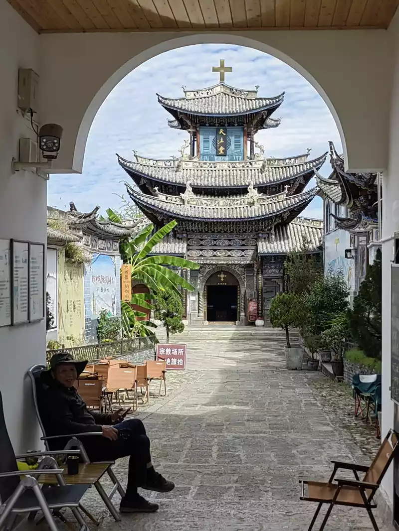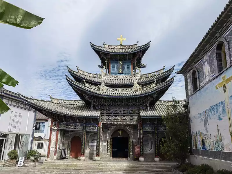 src="/travelogue/China/Yunnan/4137542/56.webp">The church faces east and west. Unlike the Gothic Catholic churches commonly seen in the West, the main building's wooden structure is a combination of raised beams and through-beams, which is very similar to the Bai people's houses with corridors on both sides.