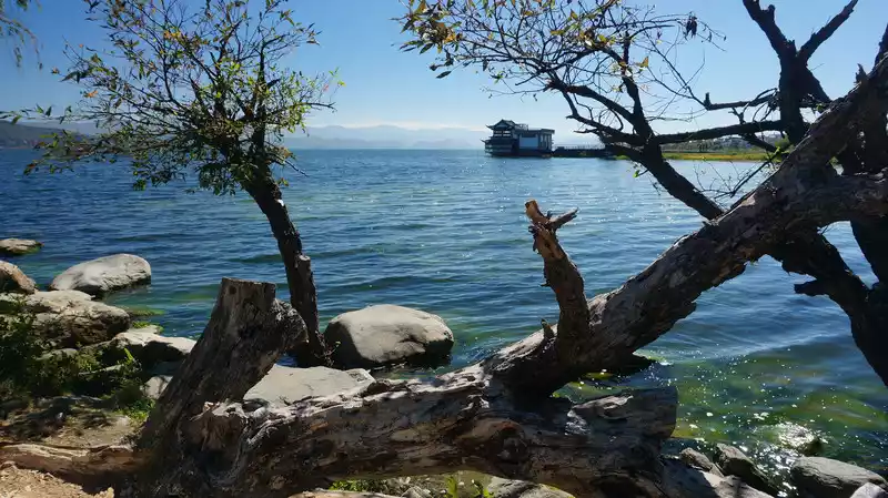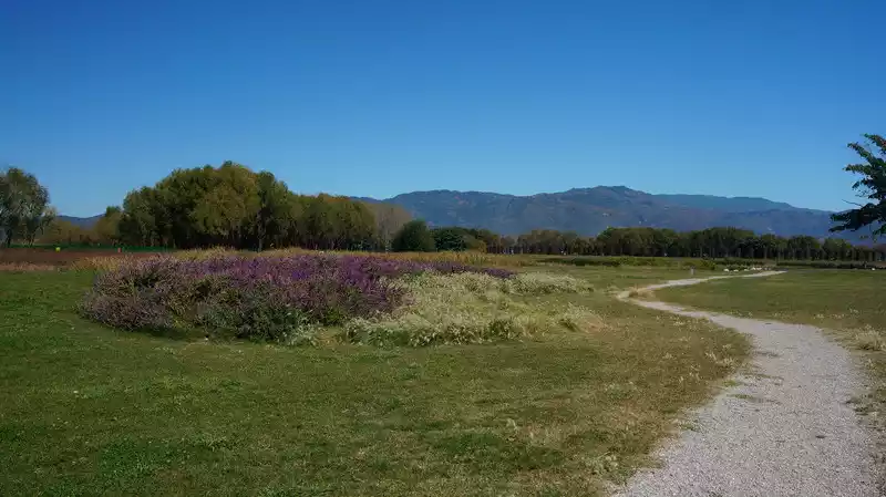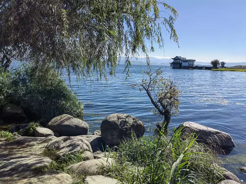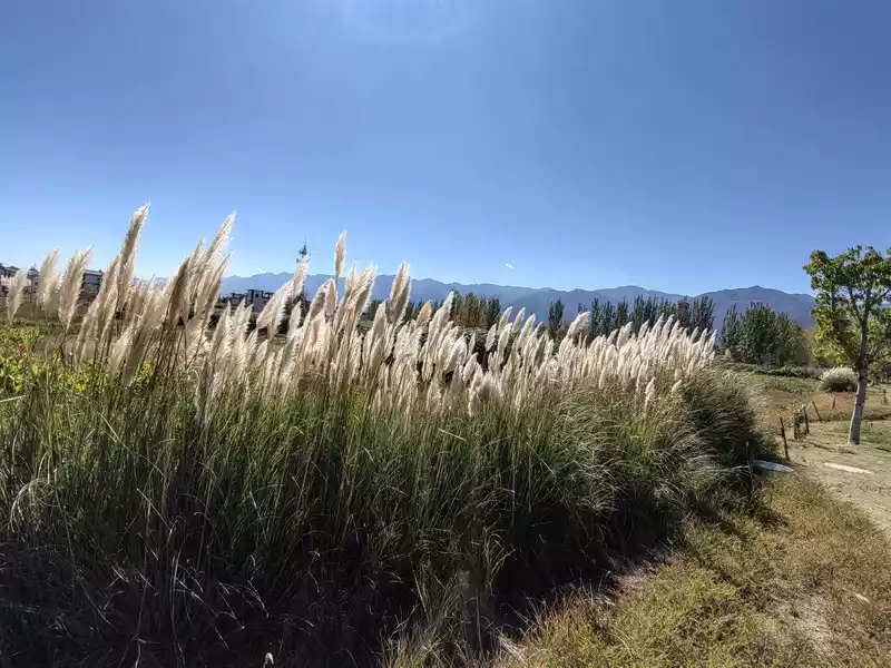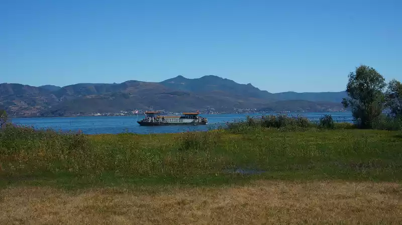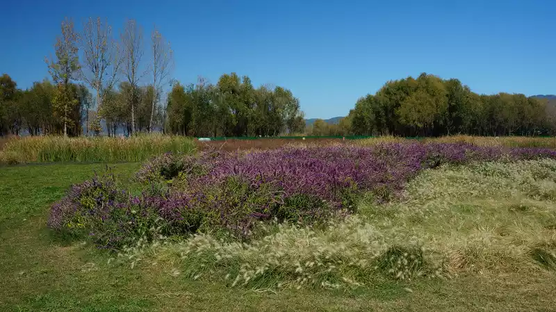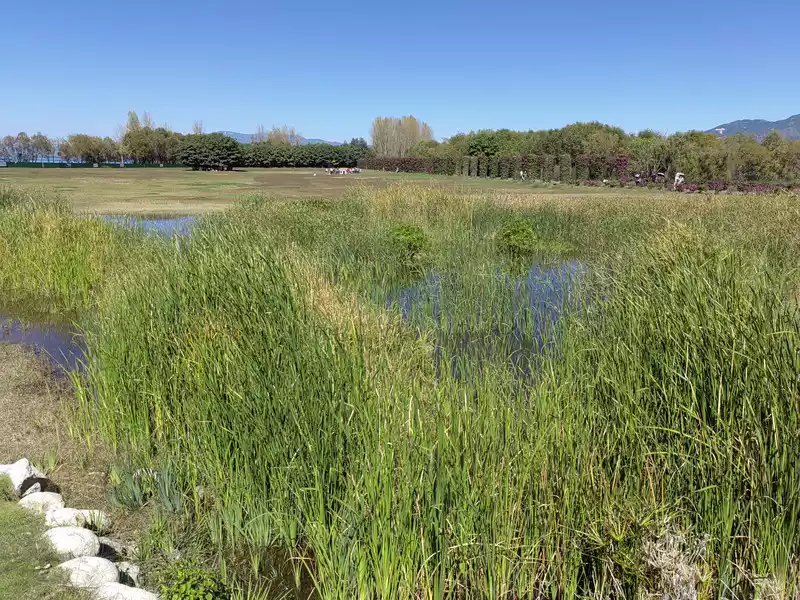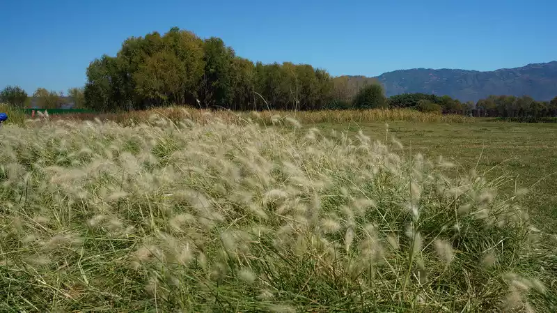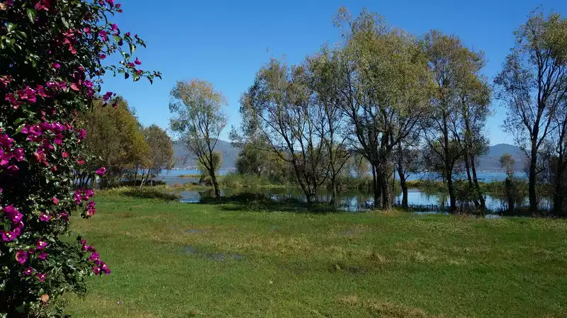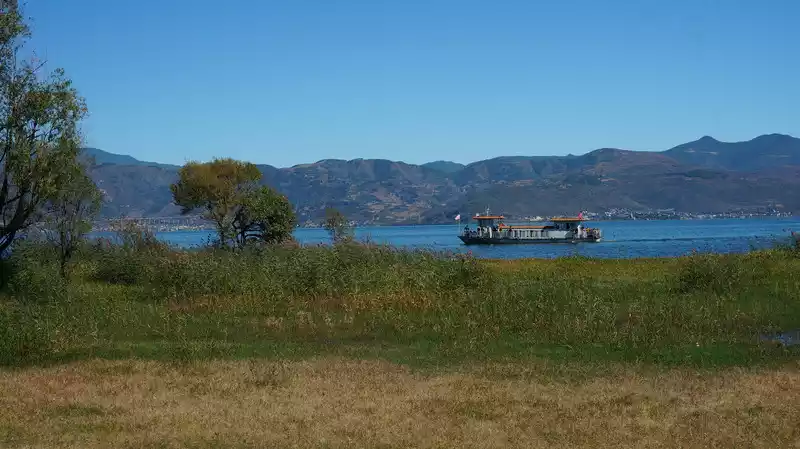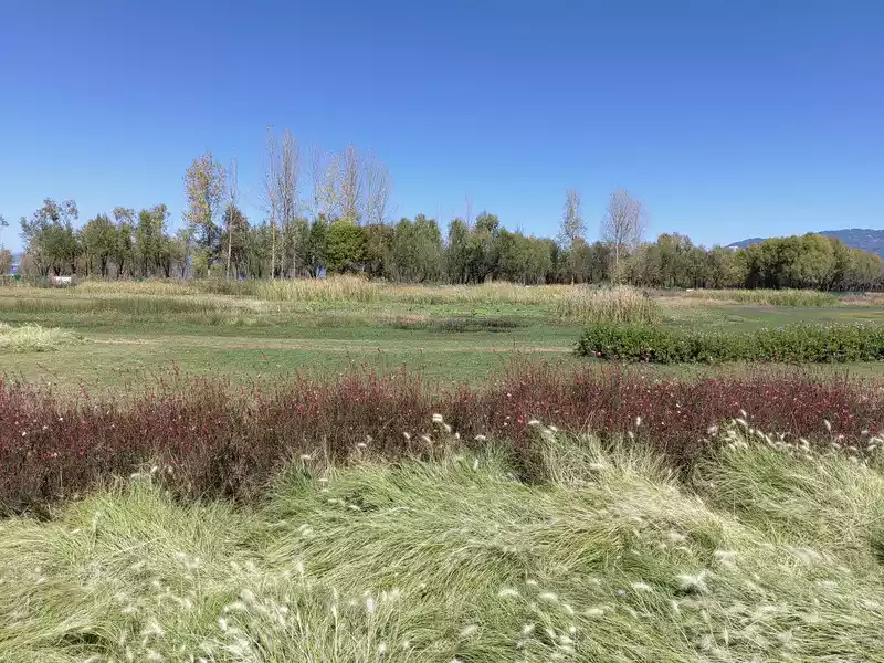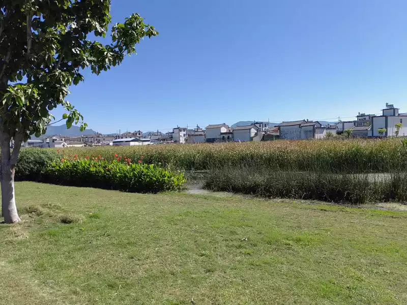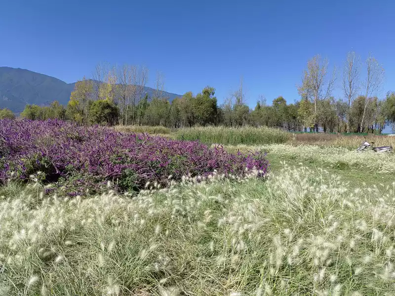 src="/travelogue/China/Yunnan/4137542/56.webp">We walked along the lake for a while and left without entering the village. src="/travelogue/China/Yunnan/4137542/56.webp">Second stop: Haishe Ecological Park src="/travelogue/China/Yunnan/4137542/56.webp">Haishe Ecological Park is located on the west shore of Erhai Lake. It is a narrow peninsula extending into the lake, approximately 3-4 kilometers from Xizhou Ancient Town. The island's scenery is pristine, with large tracts of trees and long wormwood grass. The Erhai Lake here is also exceptionally clear and azure, creating a refreshing and beautiful scene, perfect for photographing. src="/travelogue/China/Yunnan/4137542/56.webp">To reach Haishe Ecological Park, you'll need to pass through Xizhou Ancient Town. Most tourists typically visit both Xizhou Ancient Town and Haishe Ecological Park together, but we'd seen so many ancient villages, towns, and cities in recent days that we were a bit tired, so we skipped Xizhou Ancient Town and went straight to Haishe Park. The public parking lot at Haishe Park is quite far from the park entrance. During peak season, you can take a shuttle bus, but off-season, you'll have to walk. Fortunately, there are large expanses of grass, reeds, and woods along the way, making for a nice view.