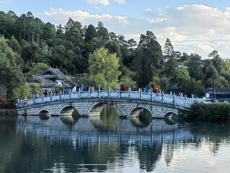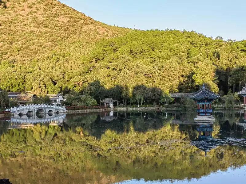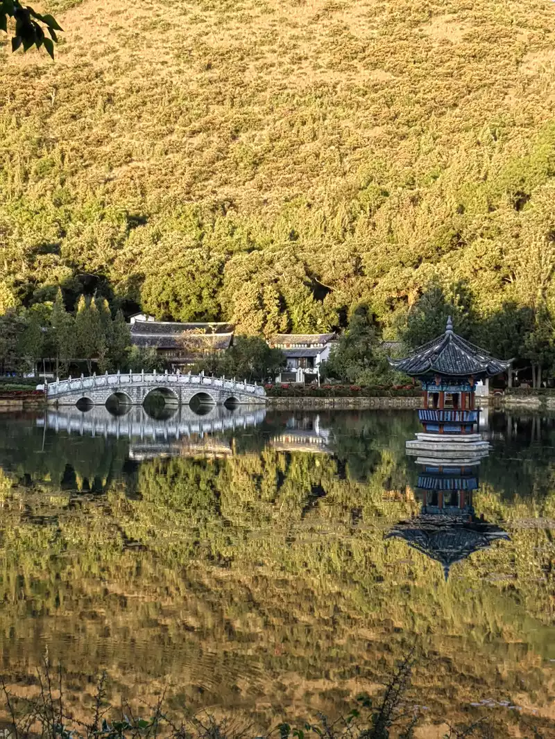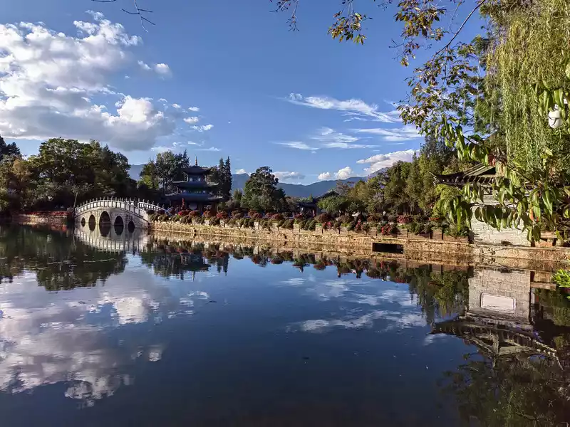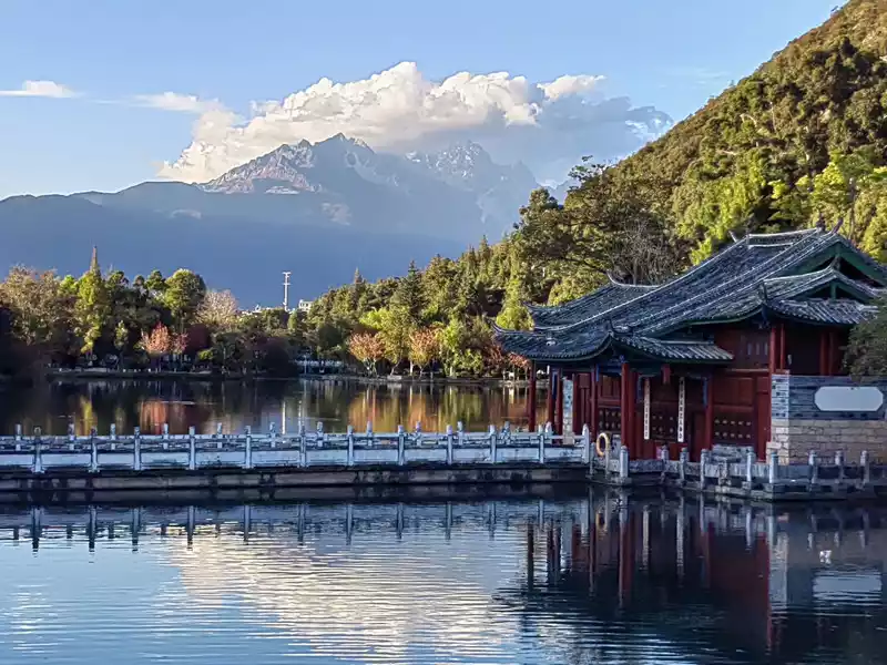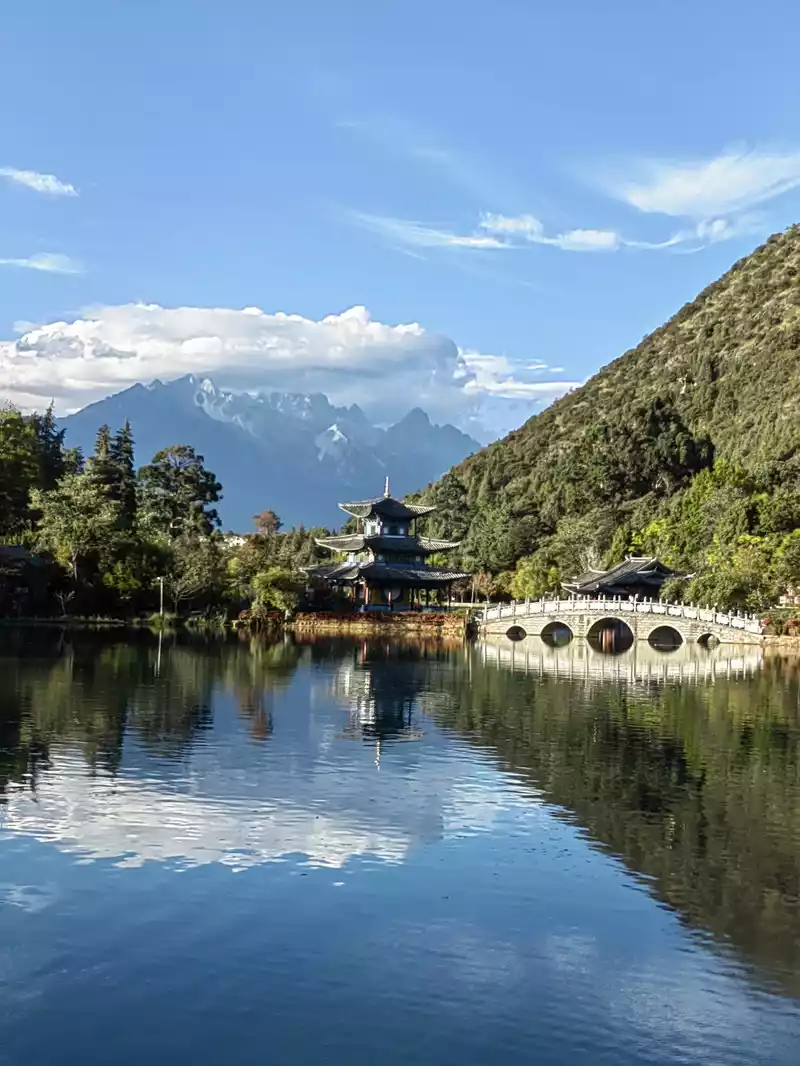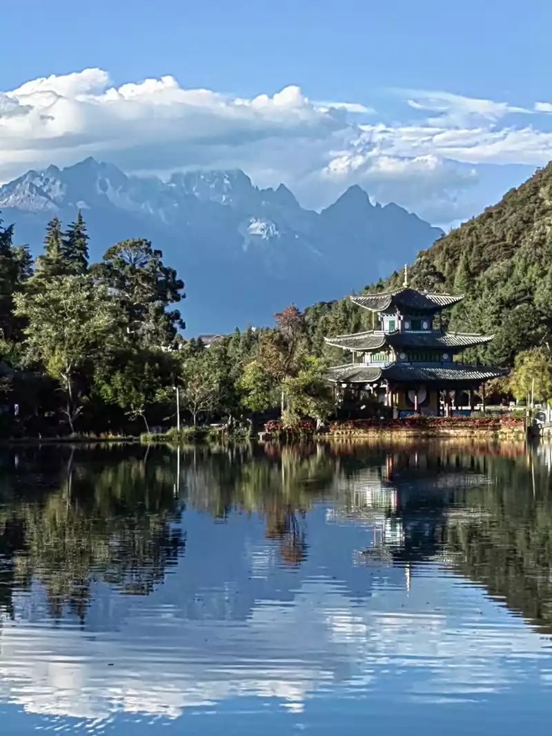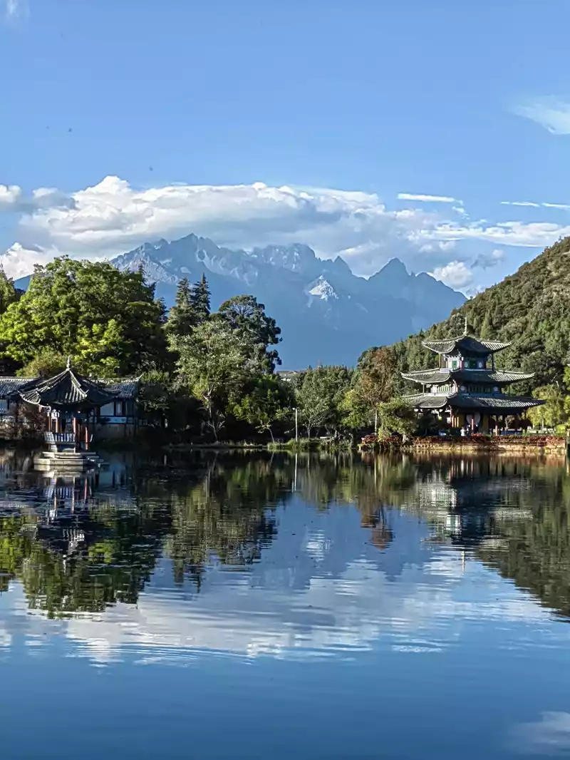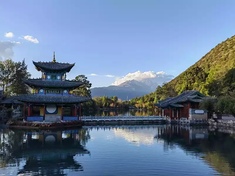 Black Dragon Pool was originally a Dragon King Temple in Lijiang. Numerous springs formed the pond near the temple. Because the jade-like springs reflect Jade Dragon Snow Mountain, it is also known as "Jade Spring Park." This area serves as the water source for Lijiang Old Town and houses the largest concentration of nationally protected cultural relics in the city. The Five-Arch Bridge, Deyue Tower, Snow Mountain, and their reflections in Black Dragon Pool create a classic Lijiang postcard. Black Dragon Pool is the best place to photograph Jade Dragon Snow Mountain, preferably in the morning or evening when the light is at its best.