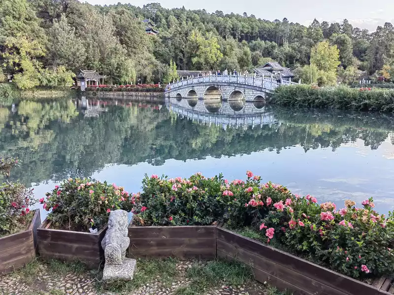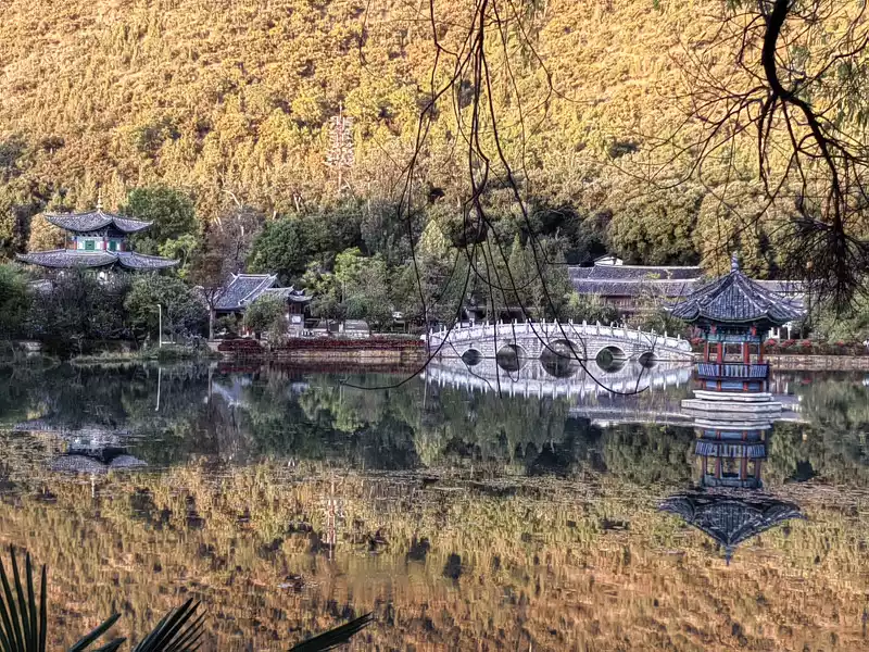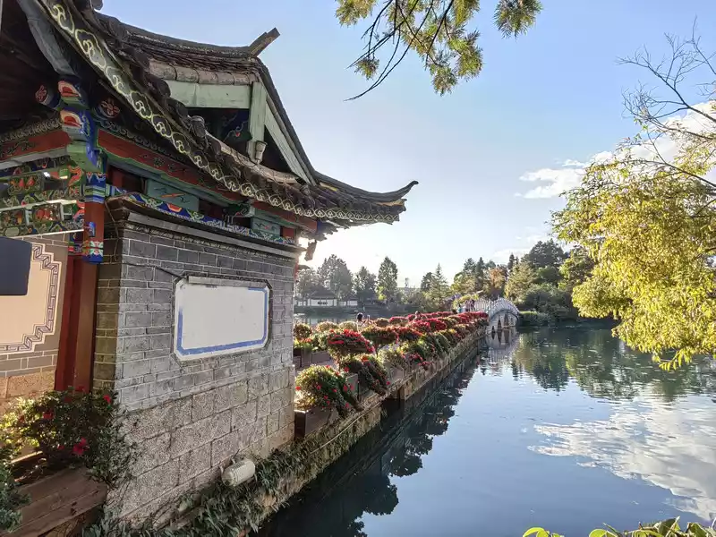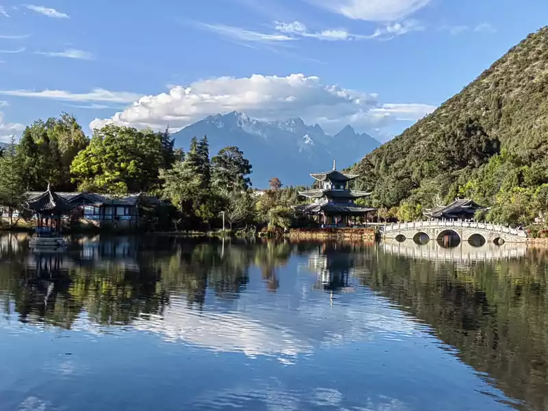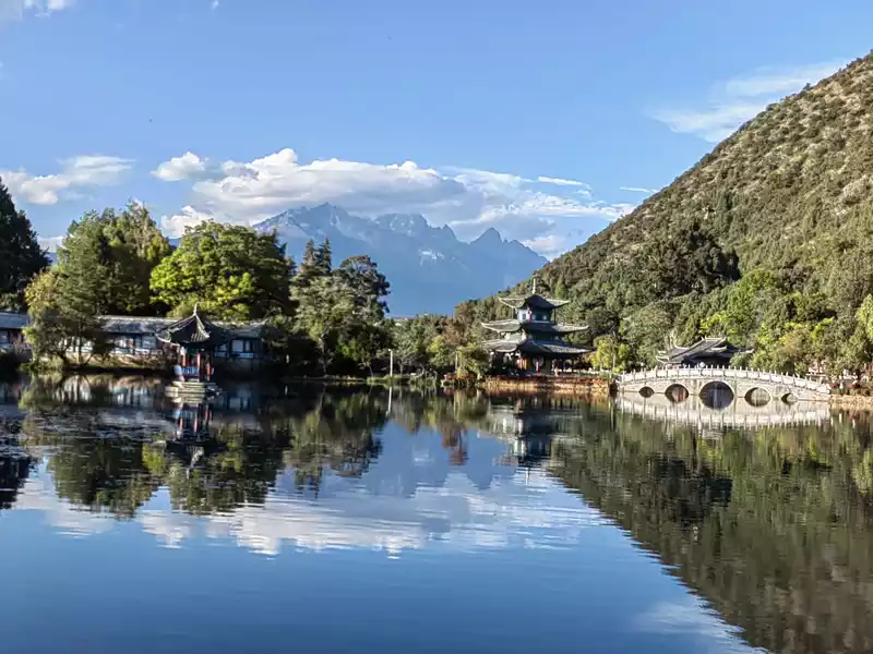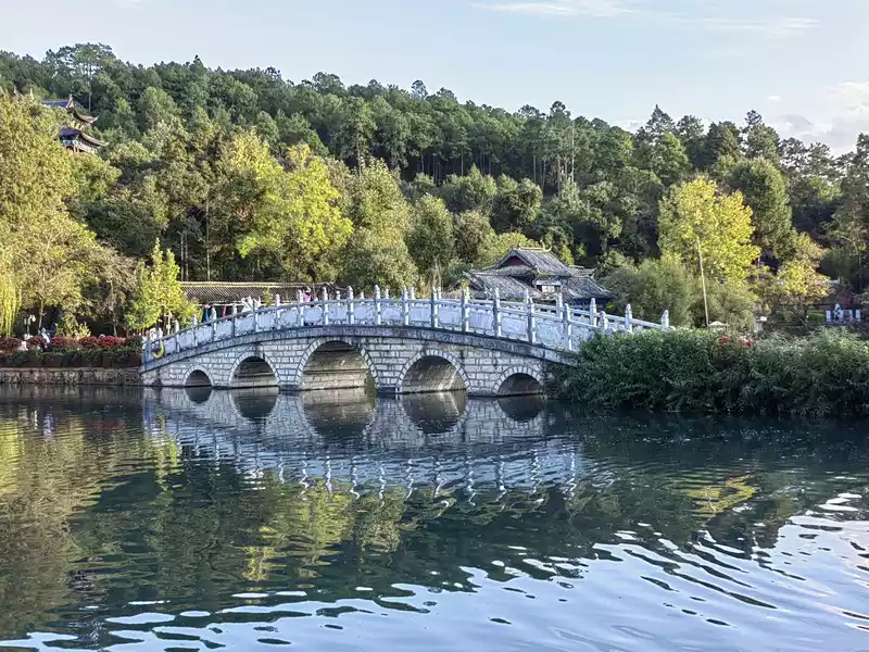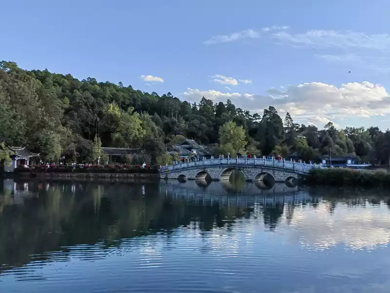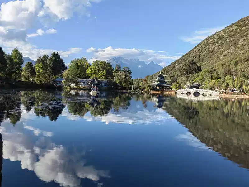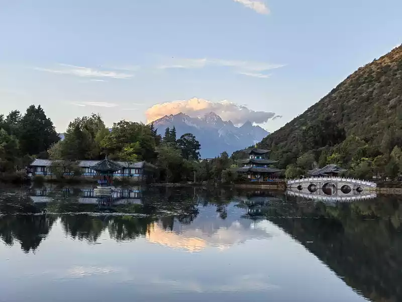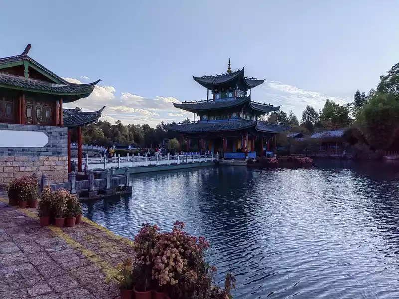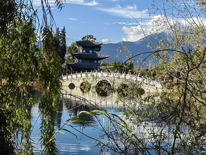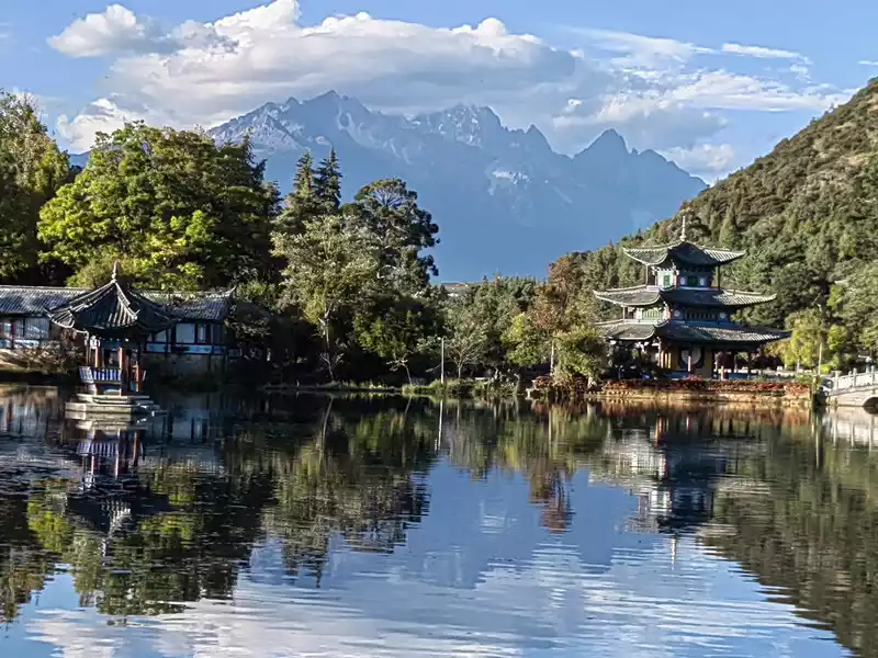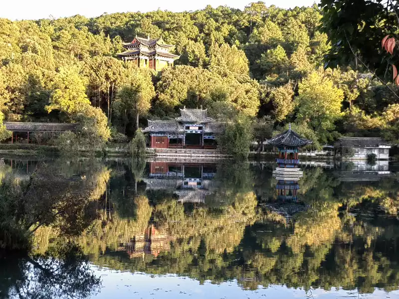 Black Dragon Pool was originally a Dragon King Temple in Lijiang. Numerous springs formed the pond near the temple. Because the jade-like springs reflect Jade Dragon Snow Mountain, it is also known as "Jade Spring Park." This area serves as the water source for Lijiang Old Town and houses the largest concentration of nationally protected cultural relics in the city. The Five-Arch Bridge, Deyue Tower, Snow Mountain, and their reflections in Black Dragon Pool create a classic Lijiang postcard. Black Dragon Pool is the best place to photograph Jade Dragon Snow Mountain, preferably in the morning or evening when the light is at its best.