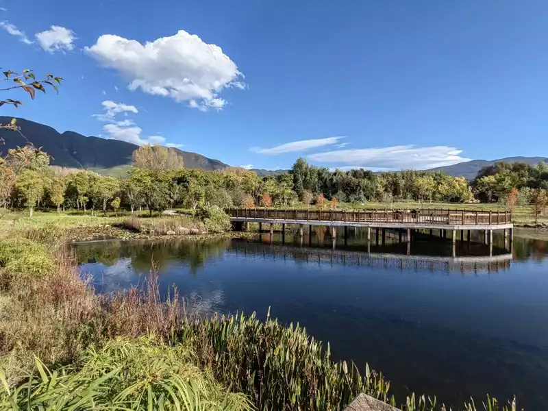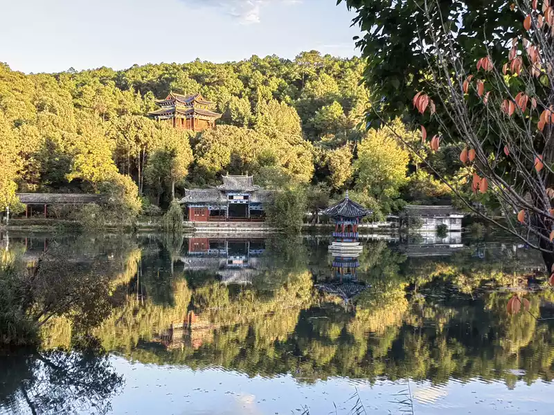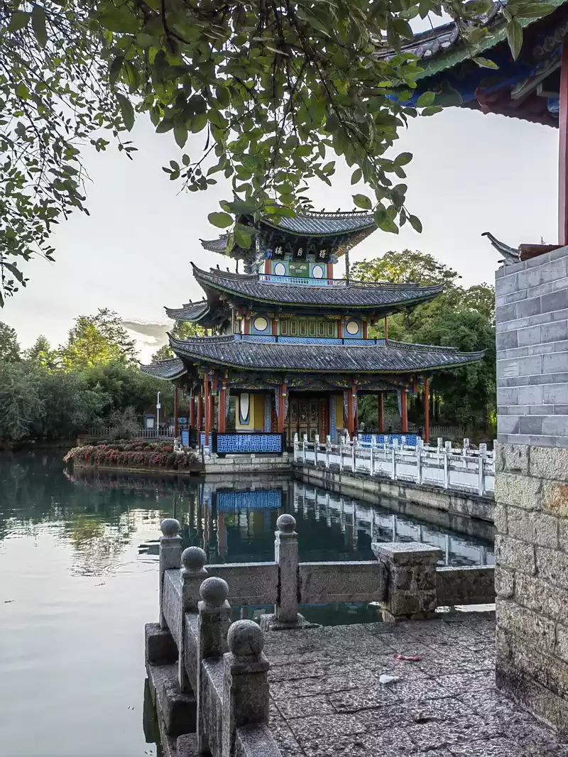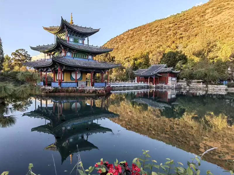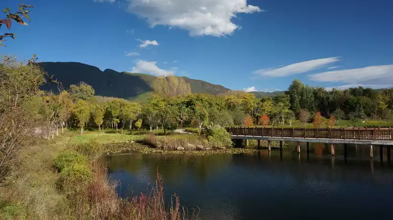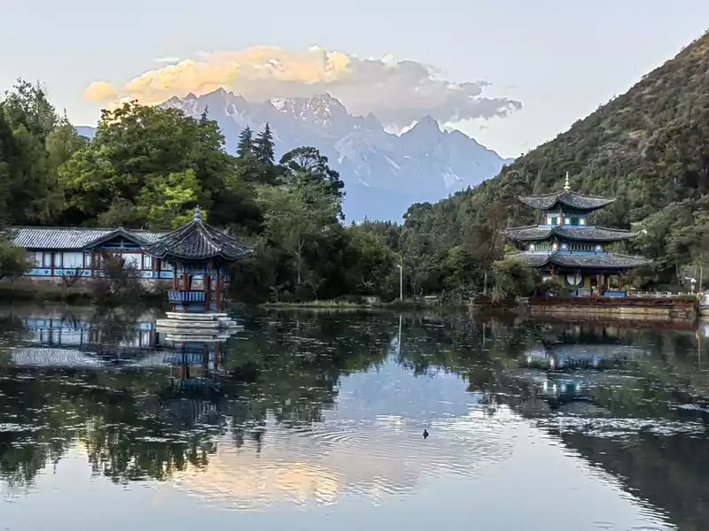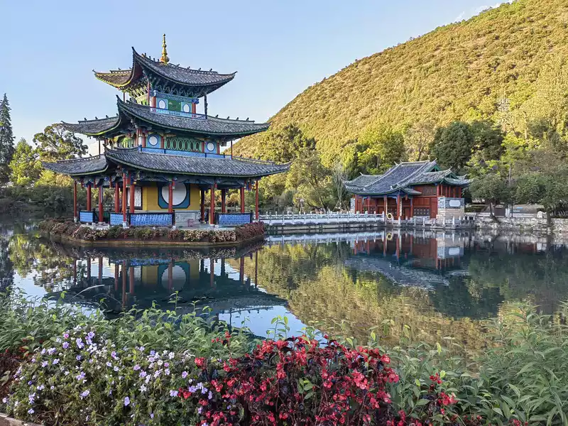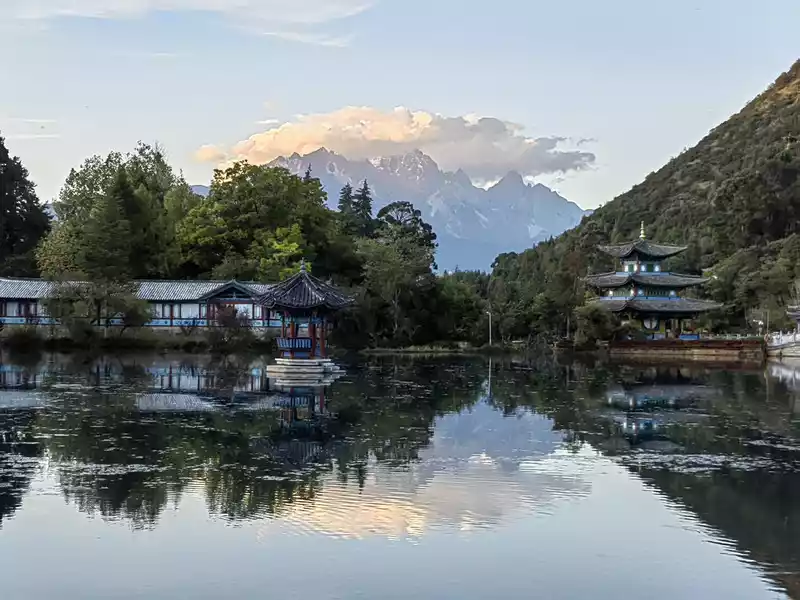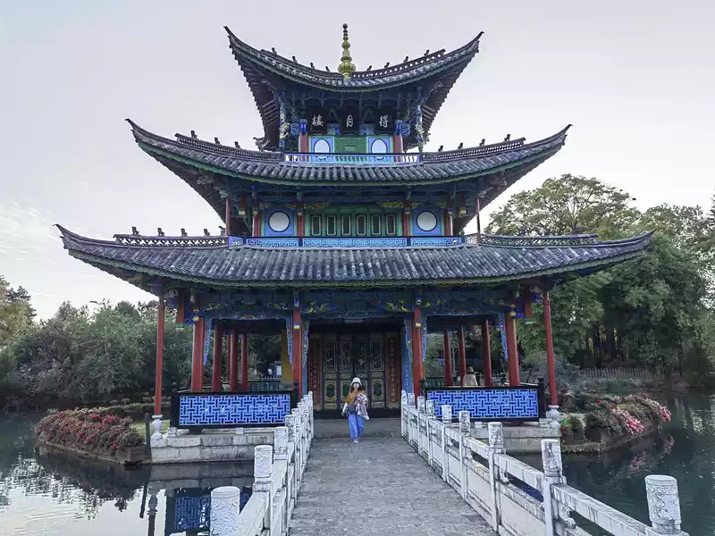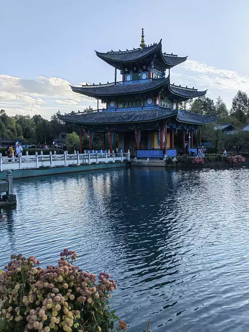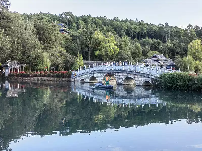 Black Dragon Pool was originally a Dragon King Temple in Lijiang. Numerous springs formed the pond near the temple. Because the jade-like springs reflect Jade Dragon Snow Mountain, it is also known as "Jade Spring Park." This area serves as the water source for Lijiang Old Town and houses the largest concentration of nationally protected cultural relics in the city. The Five-Arch Bridge, Deyue Tower, Snow Mountain, and their reflections in Black Dragon Pool create a classic Lijiang postcard. Black Dragon Pool is the best place to photograph Jade Dragon Snow Mountain, preferably in the morning or evening when the light is at its best.