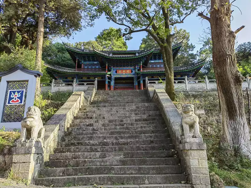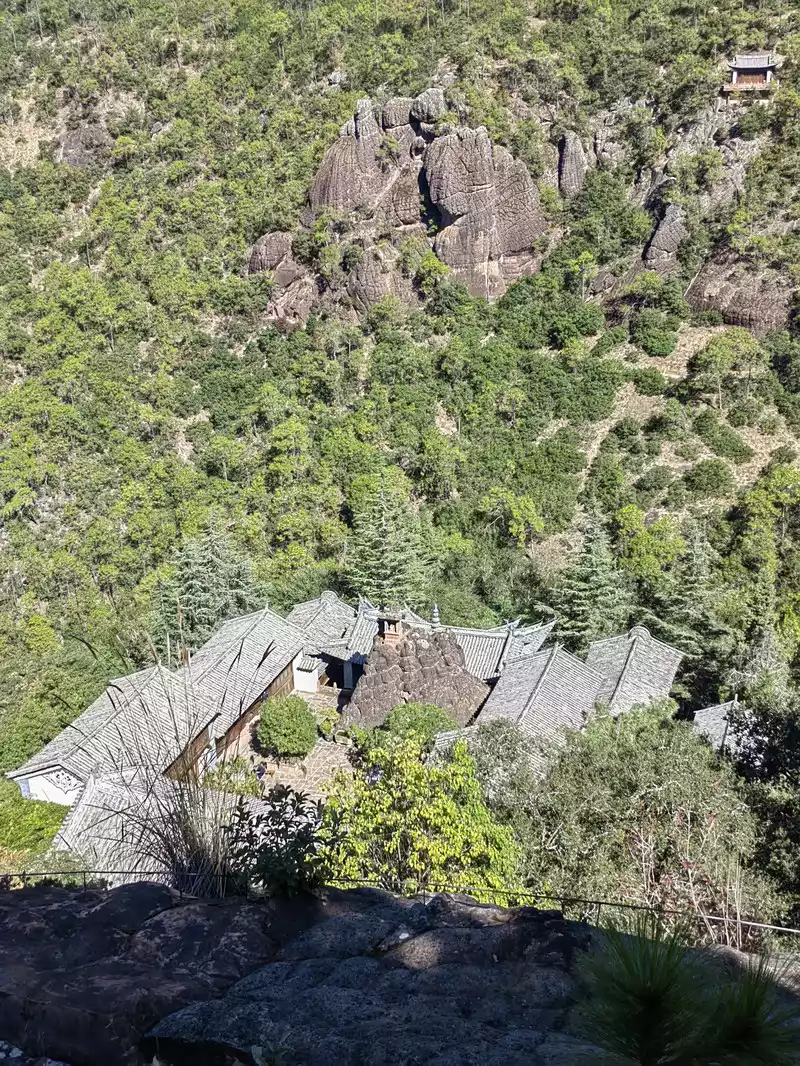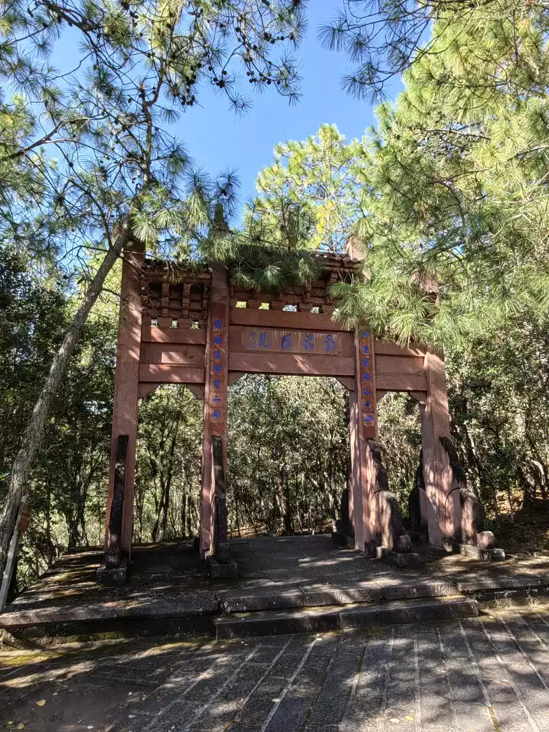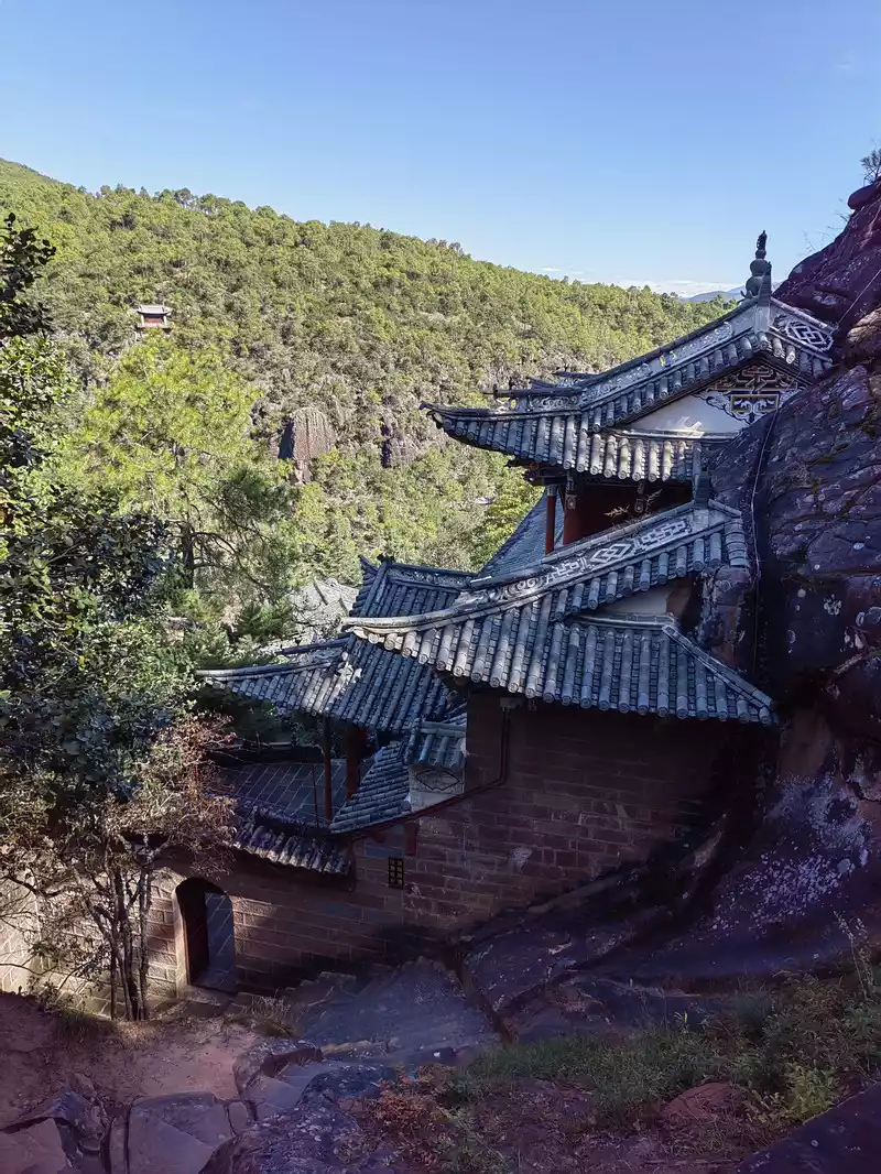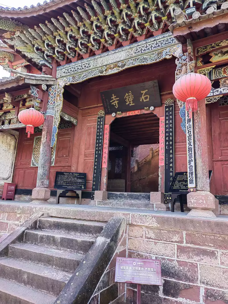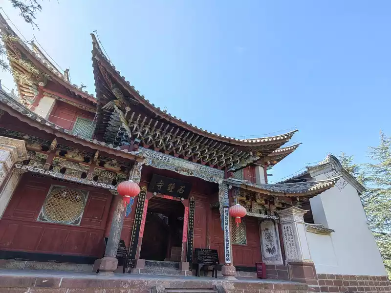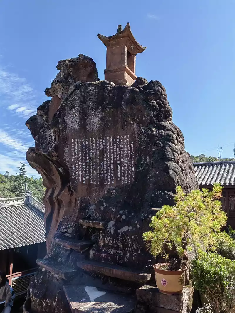 The couplet at the Stone Bell Temple gate reads: "The land connects the three thousand tribes of the Mongols and the Zhao people; the ridges hold the two great men of Dian and Chuibai. The horizontal banner reads: "The Holy Land of Nanzhao." However, this gate is several kilometers away from the Stone Bell Temple. First, you have to descend into the valley, follow a winding path through the forest, and then climb a small hill. Fortunately, the scenery along the way is beautiful, with exotic flowers and plants, and flowing mountain springs. Looking up, you can see the unique turtle-back boulders of Shibao Mountain jutting out from the mountaintops and across the valley, so it doesn't feel tiring at all.