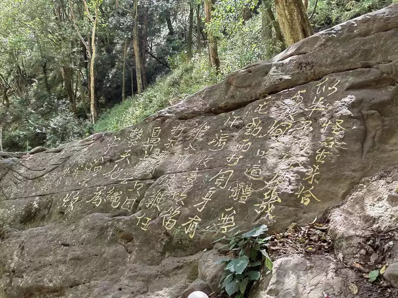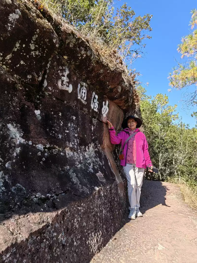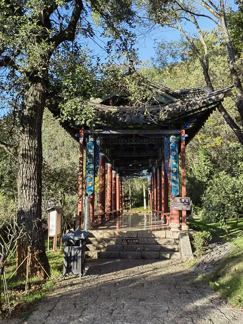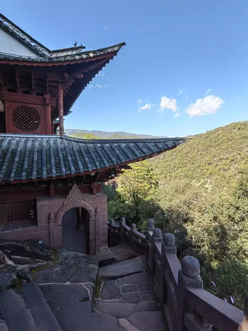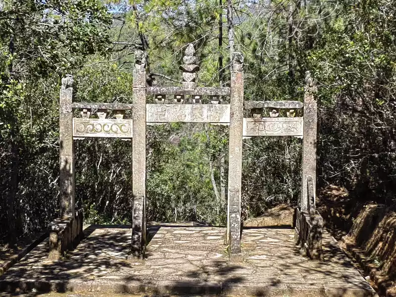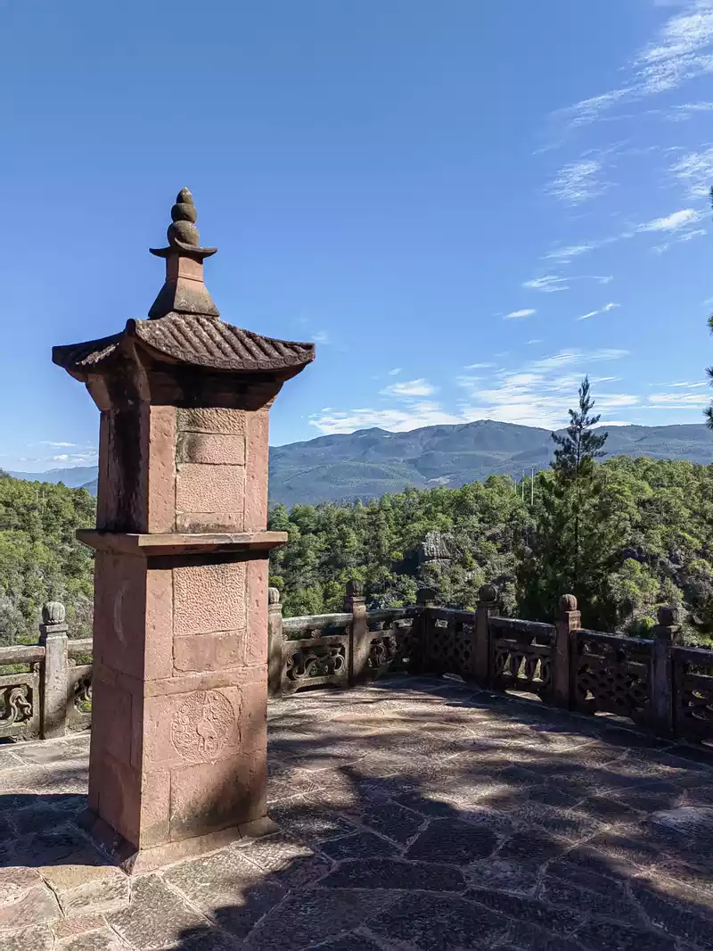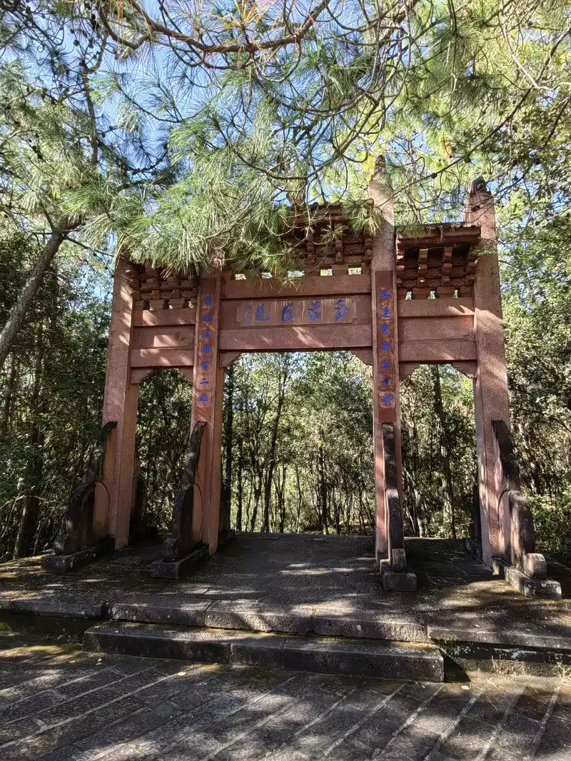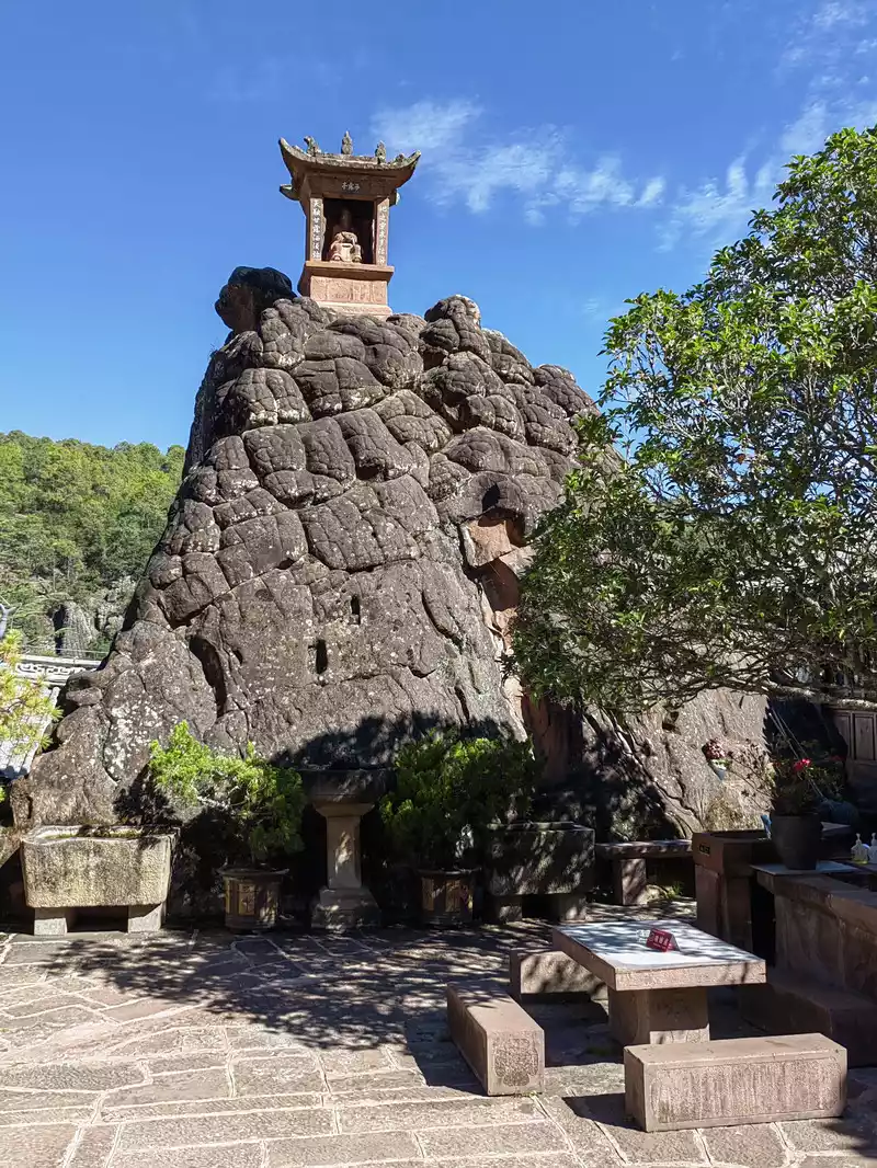 The couplet at the Stone Bell Temple gate reads: "The land connects the three thousand tribes of the Mongols and the Zhao people; the ridges hold the two great men of Dian and Chuibai. The horizontal banner reads: "The Holy Land of Nanzhao." However, this gate is several kilometers away from the Stone Bell Temple. First, you have to descend into the valley, follow a winding path through the forest, and then climb a small hill. Fortunately, the scenery along the way is beautiful, with exotic flowers and plants, and flowing mountain springs. Looking up, you can see the unique turtle-back boulders of Shibao Mountain jutting out from the mountaintops and across the valley, so it doesn't feel tiring at all.