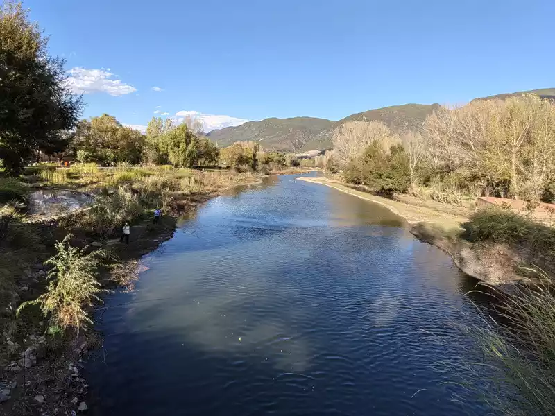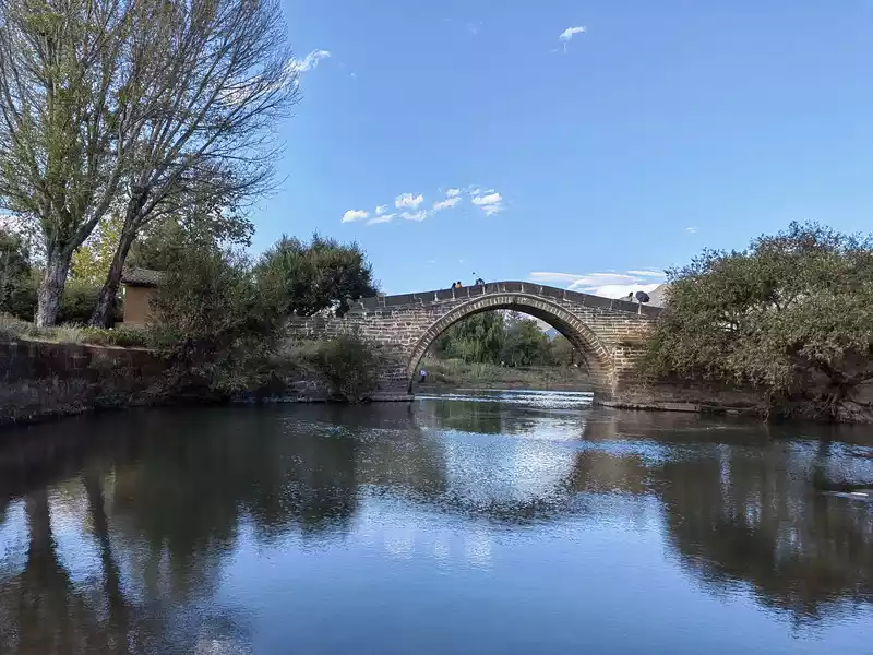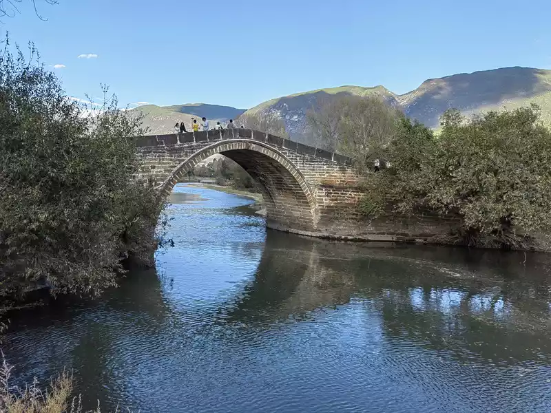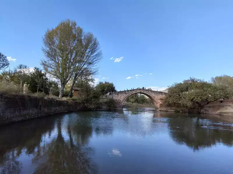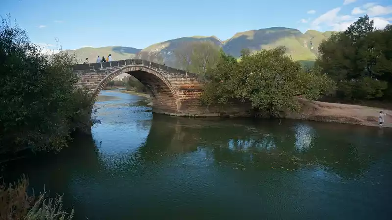 The Heihui River, one of the Four Rivers during the Nanzhao period, flows around the east side of Shaxi Ancient Town. The Yujin Bridge, spanning the Heihui River outside the East Village Gate of Shaxi Temple Deng Street, is a key bridge on the Ancient Tea Horse Road heading south to Dali and north to Lijiang. It is also one of the region's famous historical and cultural landscapes and ancient buildings. The bridge, originally built during the reign of Emperor Kangxi of the Qing Dynasty, was originally an iron chain bridge. However, it was destroyed during the Xianfeng reign of Emperor Xianfeng due to wars and the use of iron to make weapons. In 1921, local gentry in Shaxi initiated donations to build a new Yujin Bridge. Construction did not begin until 1931, and after four years of construction, it was finally completed in 1935. The new Yujin Bridge is a single-arch stone bridge, 35.4 meters long, 5 meters wide, with a clear span of 12 meters and an arch height of 6 meters. The bridge deck is paved with stone slabs and guardrails.