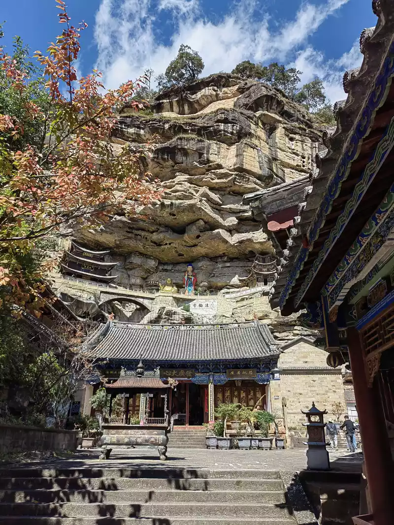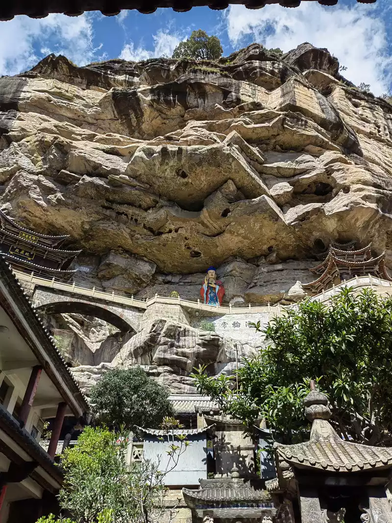 The Stone Bell Temple is built along the cliff, with layers stacked up to the top.