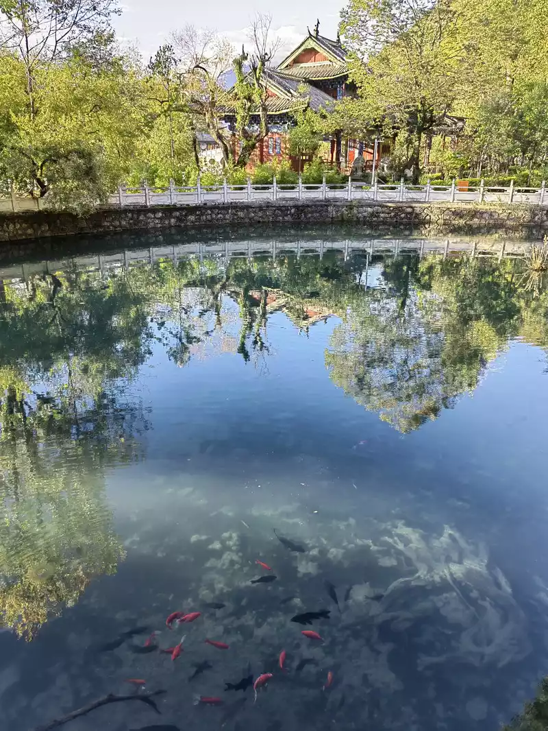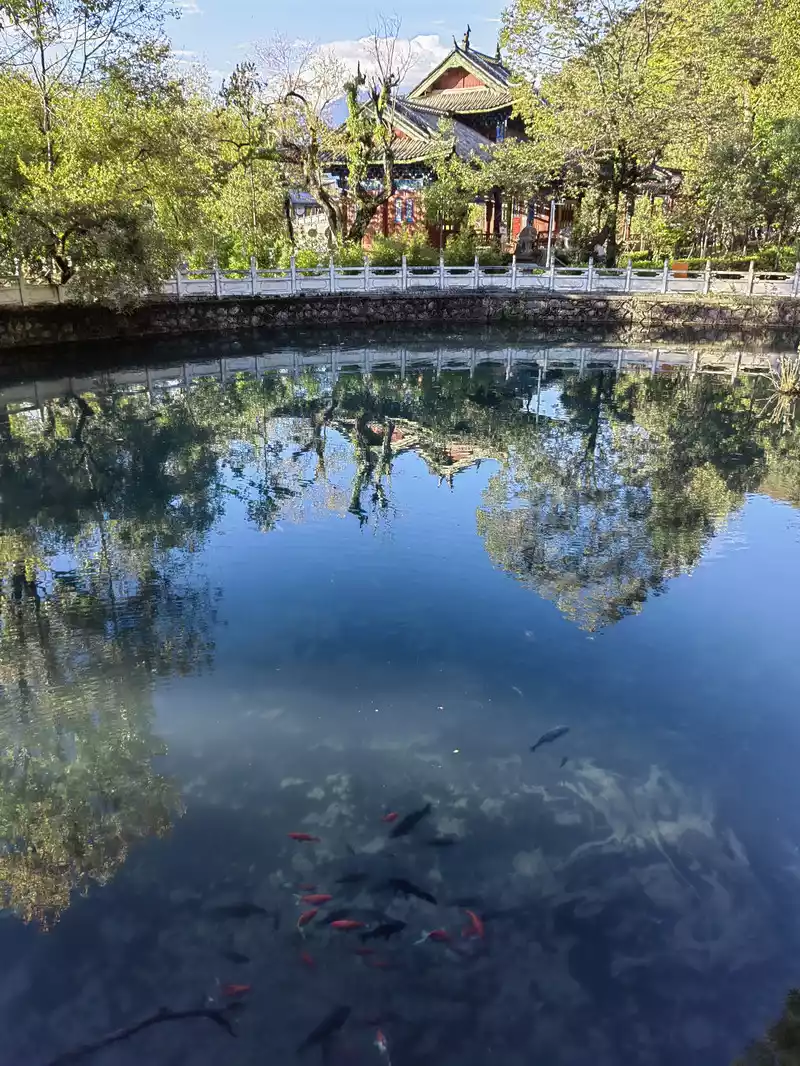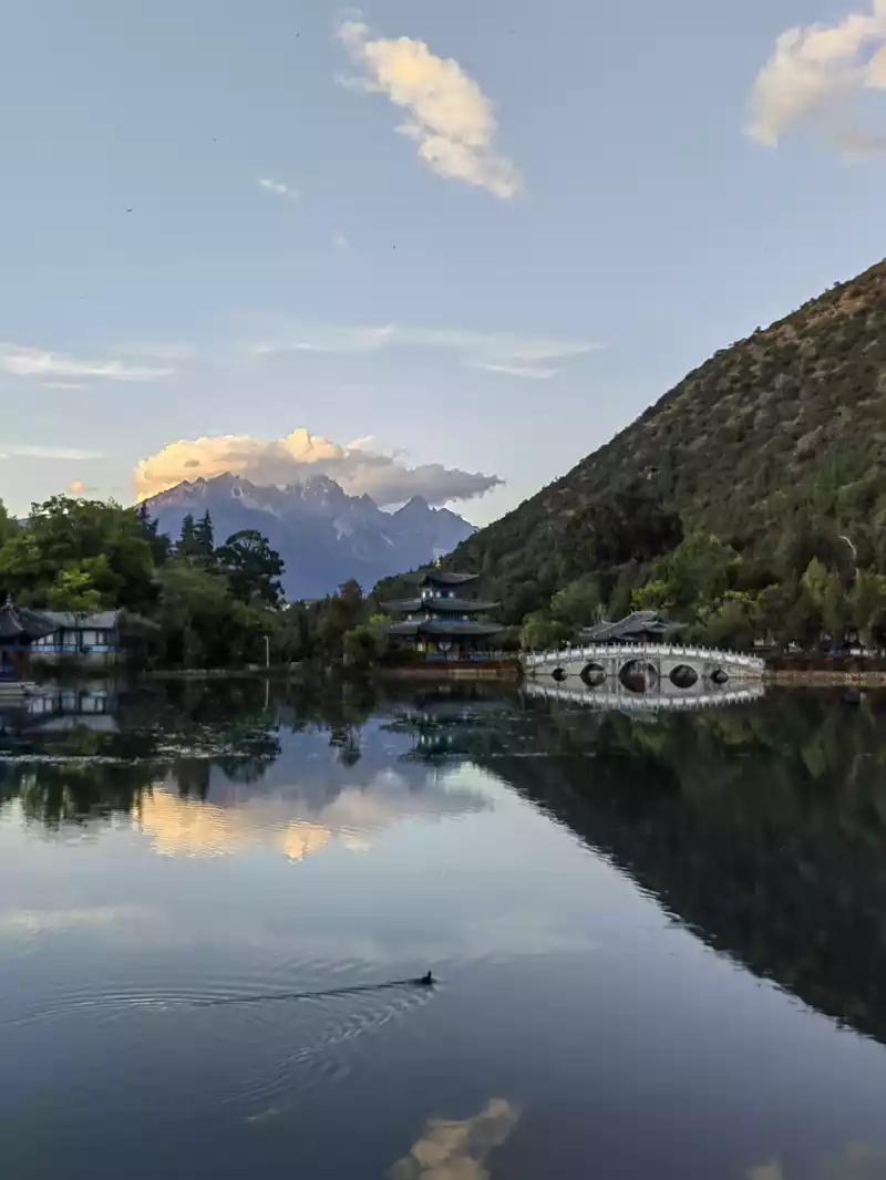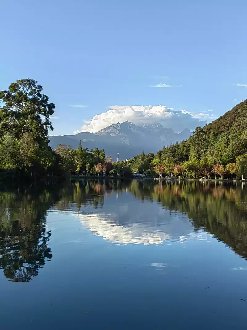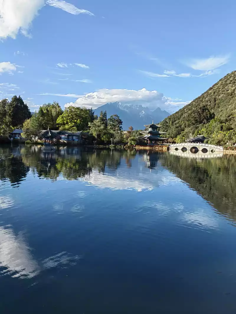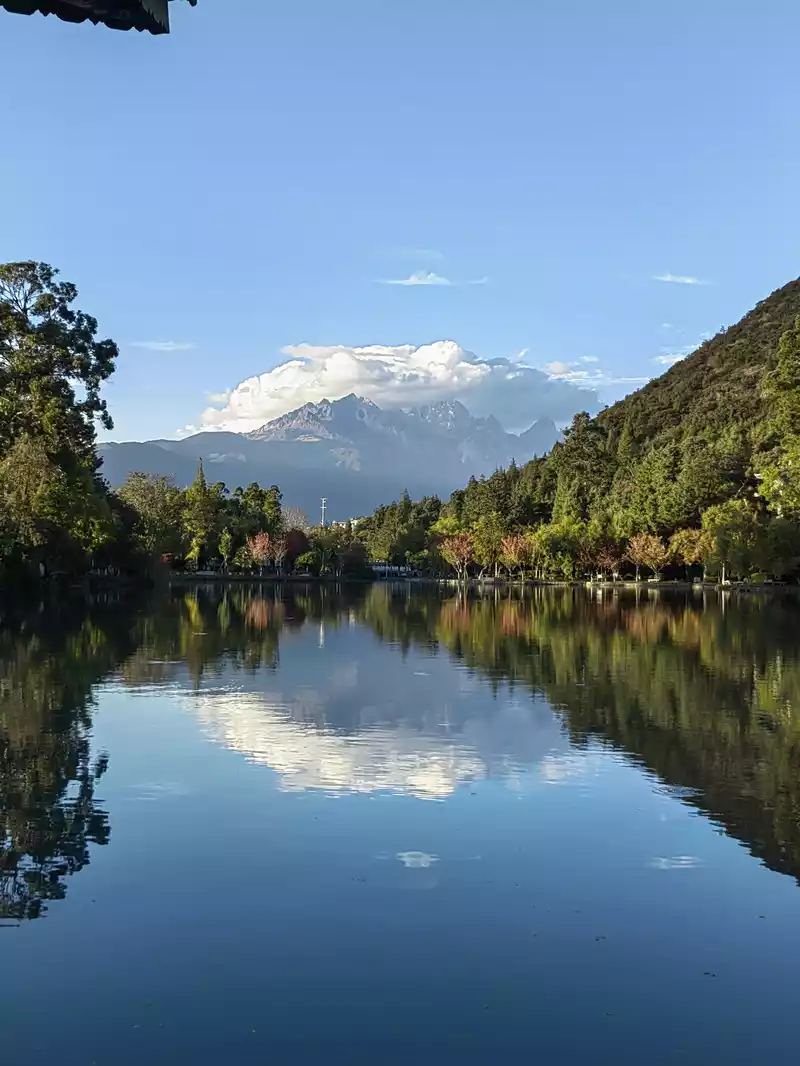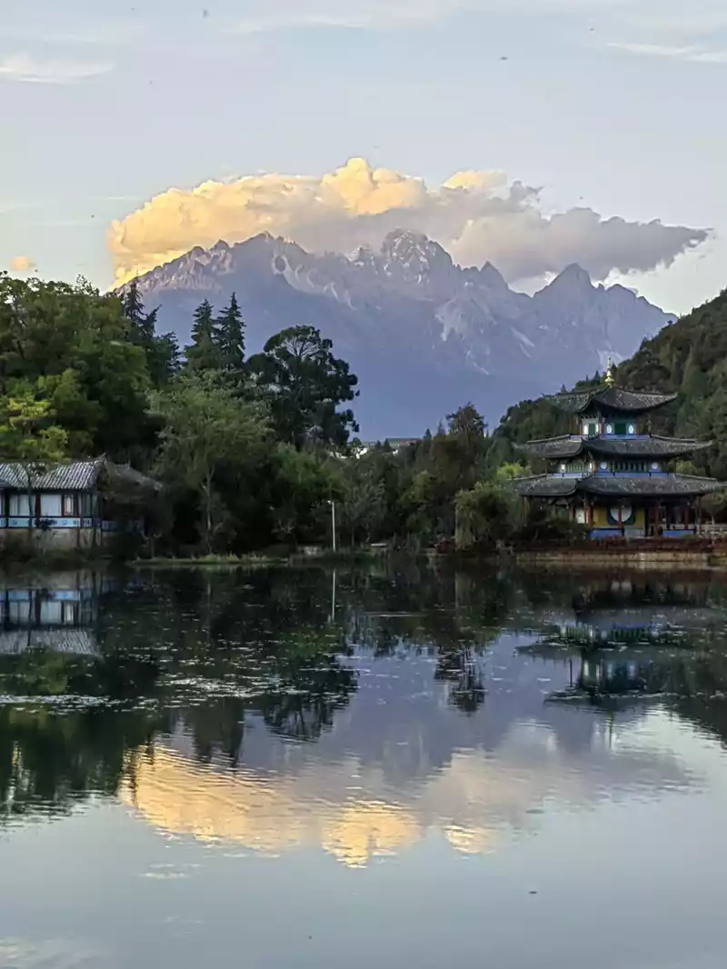The towering snow-capped mountains, lush forests, blue sky and white clouds, and pavilions are reflected in the clear blue waters of Black Dragon Pond. The scenery is beautiful, like a fairyland. The only drawback is that there is not much snow on the mountain at this time of year. Last year's snow has almost melted, and this year's snow has not yet fallen.