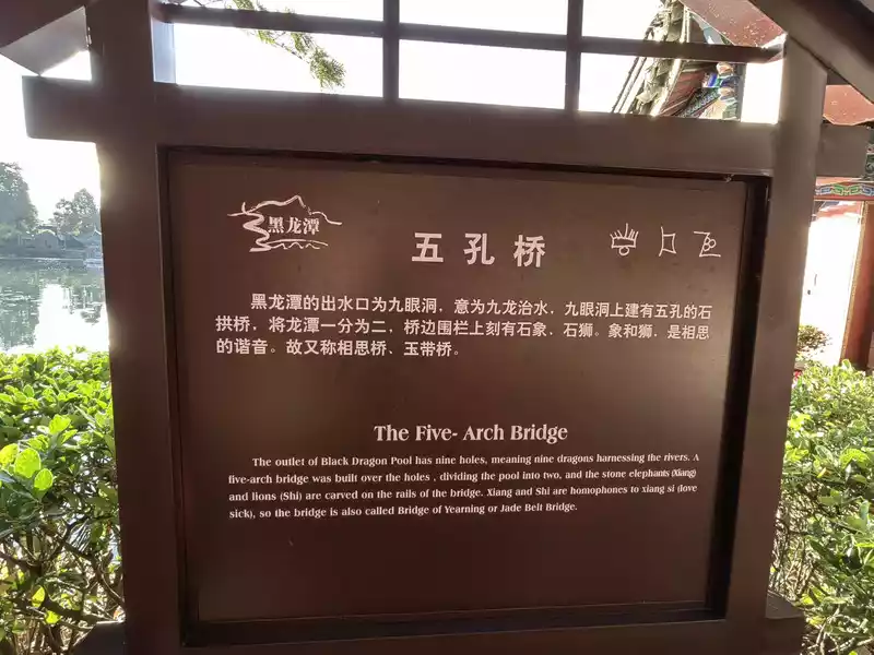 There is a five-hole white marble bridge south of Deyue Tower. The design of the bridge is simple and simple, with a large arch in the middle and independent small arches on both sides, which contrasts with Deyue Tower. The Five-hole Bridge, also known as the Yudai Bridge and the Acacia Bridge, lies across the Black Dragon Pond. Split the pond into two. There are stone elephants and stone lions carved on the stone railings of the bridge. "Elephant and Lion" is a homophone of "Acacia", so it is named Acacia Bridge .