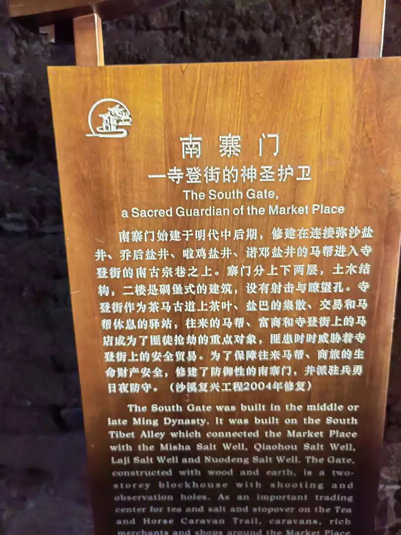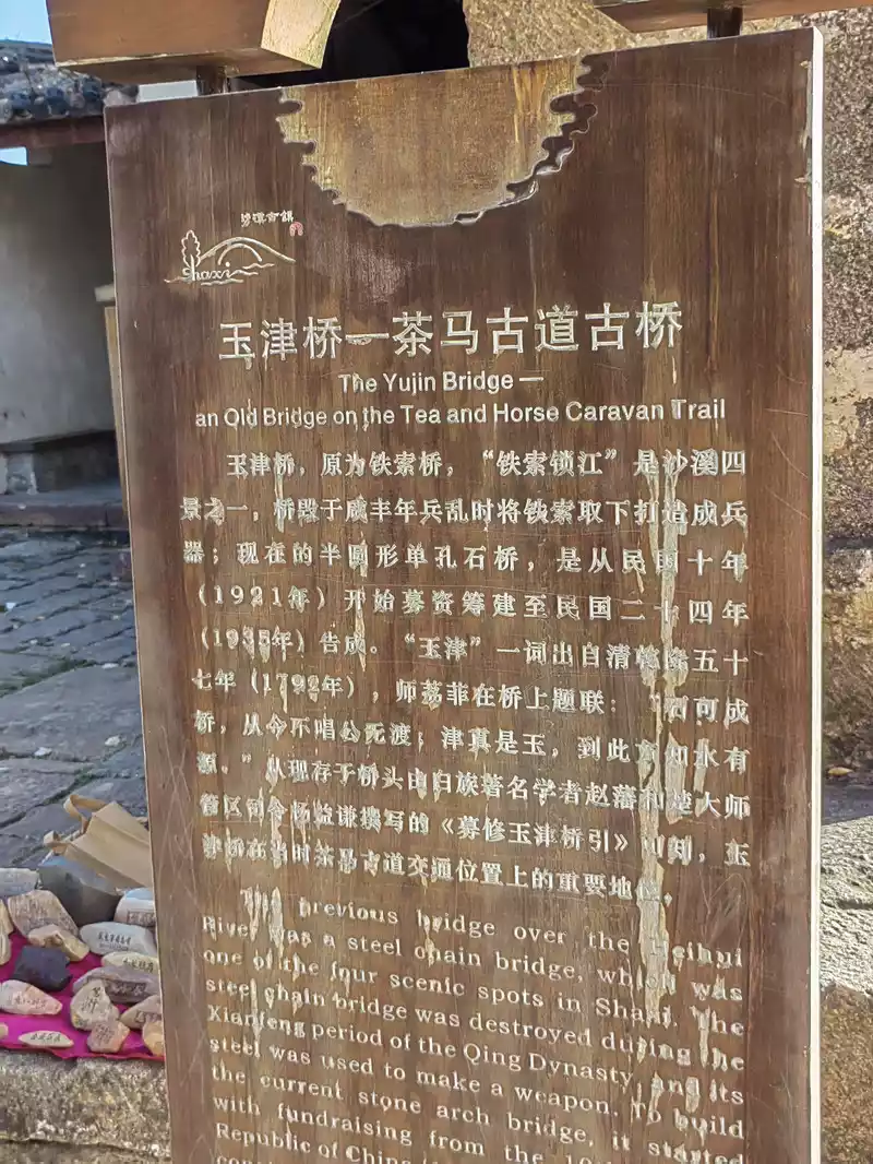 Not far east of Yujin Bridge is Shaxi Ancient Town. The World Heritage in Danger list states: "The Shaxi (Siden Street) area in China is the only surviving market town on the ancient Tea Horse Road, with intact theaters, hotels, temples, and gates, making this market town connecting Tibet and South Asia quite complete."