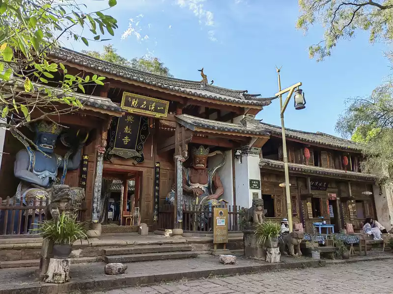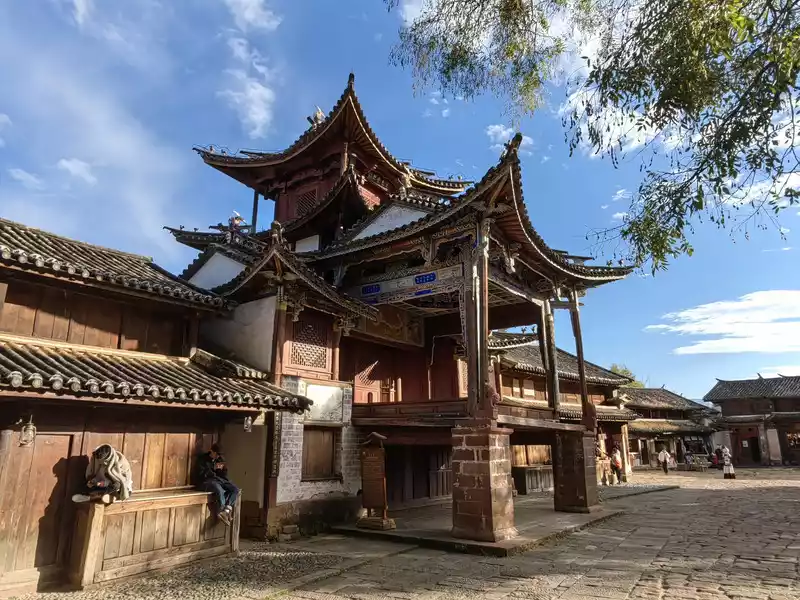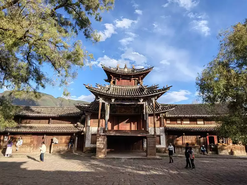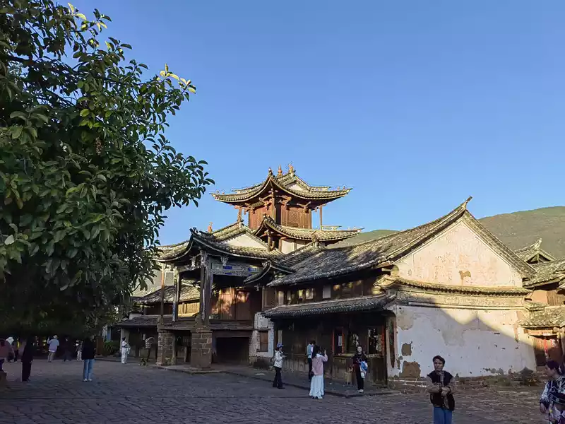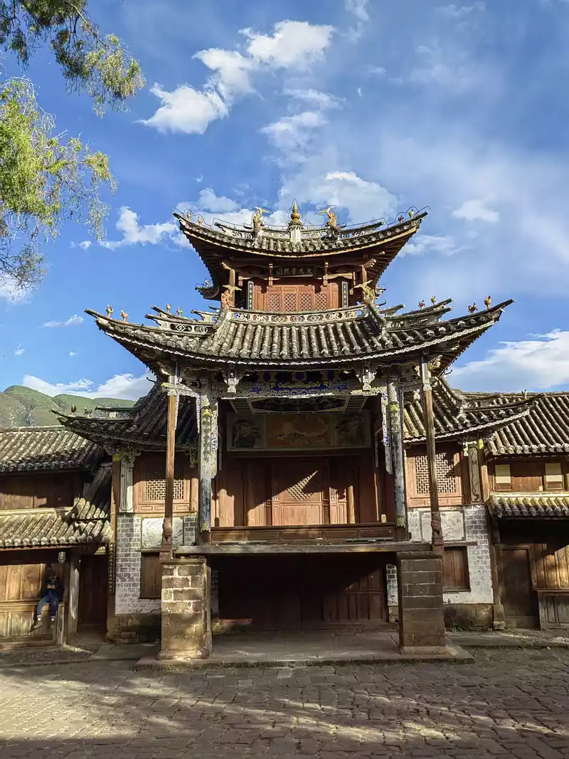 The Ancient Theater in Shaxi Ancient Town, located on Sifang Street, was built during the Jiaqing period of the Qing Dynasty. It is one of the town's most distinctive ancient buildings and a prime example of Bai ethnic group architecture. The main structure of the theater is the Kuixing Pavilion, a place where the local Bai people worship the star Kuixing. The theater serves as a secondary function. The main building is three stories high, with the theater in front and the pavilion in the back. The structure is exquisite, with twelve corners, resembling wings. Despite centuries of renovations, it has largely retained its original style. The intricate carvings and exquisite murals convey a rich history. It is not only a cultural symbol of Shaxi Ancient Town but also a vital place for visitors to experience local culture and history.