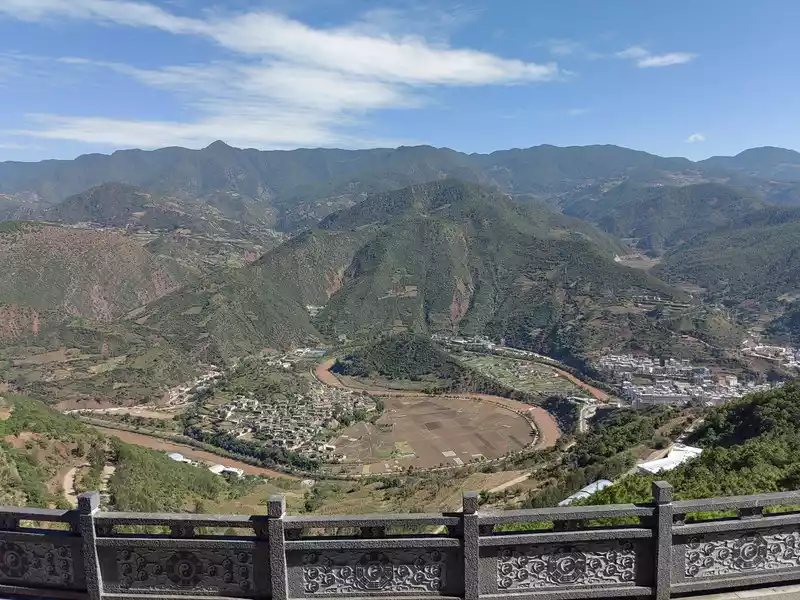 The Yunlong Tai Chi Observation Deck is located on the west side of the Bian River, on the winding mountain road from Yunlong County to Yunlong Tianchi Lake (the Tianchi Tourist Route), at an altitude of 1,980 meters. Free parking is conveniently located along the road. Directly in front of the entrance, a large stone is engraved with the eight characters "World Wonder - Yunlong Tai Chi."