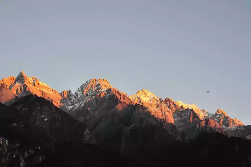 On the bus, my seatmate was a very talkative man. He talked about his revised travel plans, sharing many beautiful sights, and how the bus had met passengers who wanted to visit Siguniang Mountain and Hemu but had failed. As we chatted, I, who hadn't been feeling sleepy at all, fell asleep again. When I woke up, the van was just turning a corner. Looking out the window, I saw Jade Dragon Snow Mountain.