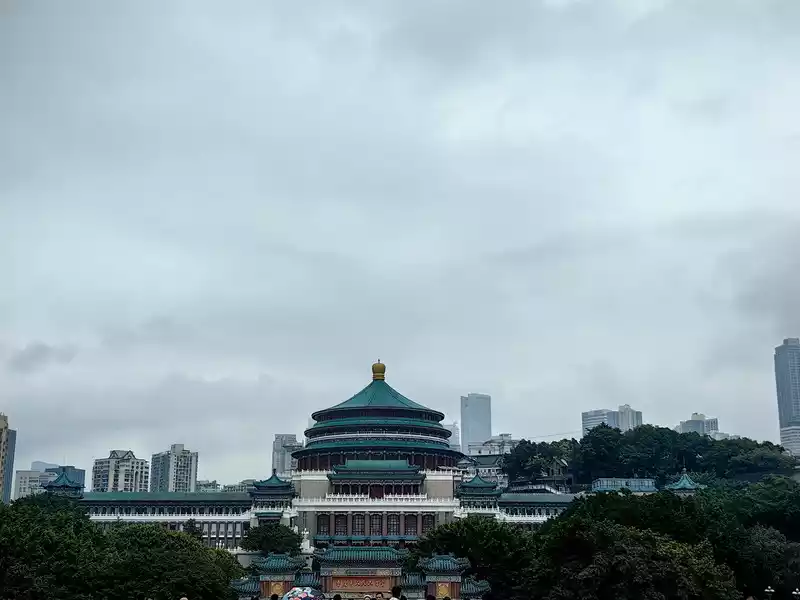 The Three Gorges Museum's design, as is customary, is meticulously crafted. It's modeled after the Three Gorges Dam, with the exterior glass symbolizing the river. Facing the grand entrance is the magnificent Chongqing People's Auditorium. This old building, supposedly modeled after ancient Chinese architecture, feels like the honeymoon period between China and the Soviet Union during the founding of the People's Republic of China.