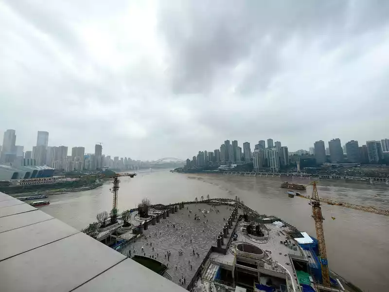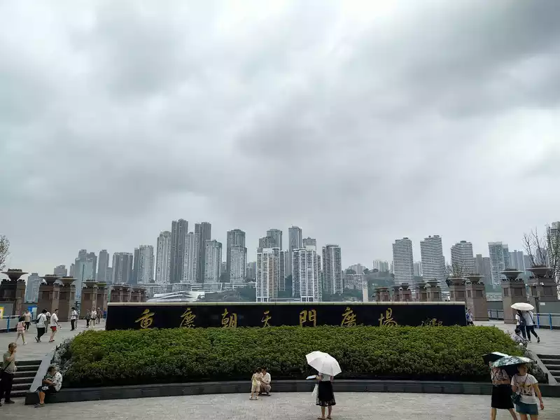 From the pointed corner of Chaotianmen Square, you can take in the magnificent view of the confluence of the Jialing and Yangtze Rivers. Across the river to the right is a vast residential complex in the Nan'an District, built along the river and the mountainside in a distinct and well-organized pattern. Across the river to the left are the office buildings and theater complex of the Jiangbei District, embodying the grandeur of a bustling metropolis. Take the elevator to the 5th-floor platform of Raffles City, where you can walk to the Sky Garden, which offers a panoramic view of Chaotianmen Square and a truly breathtaking view.