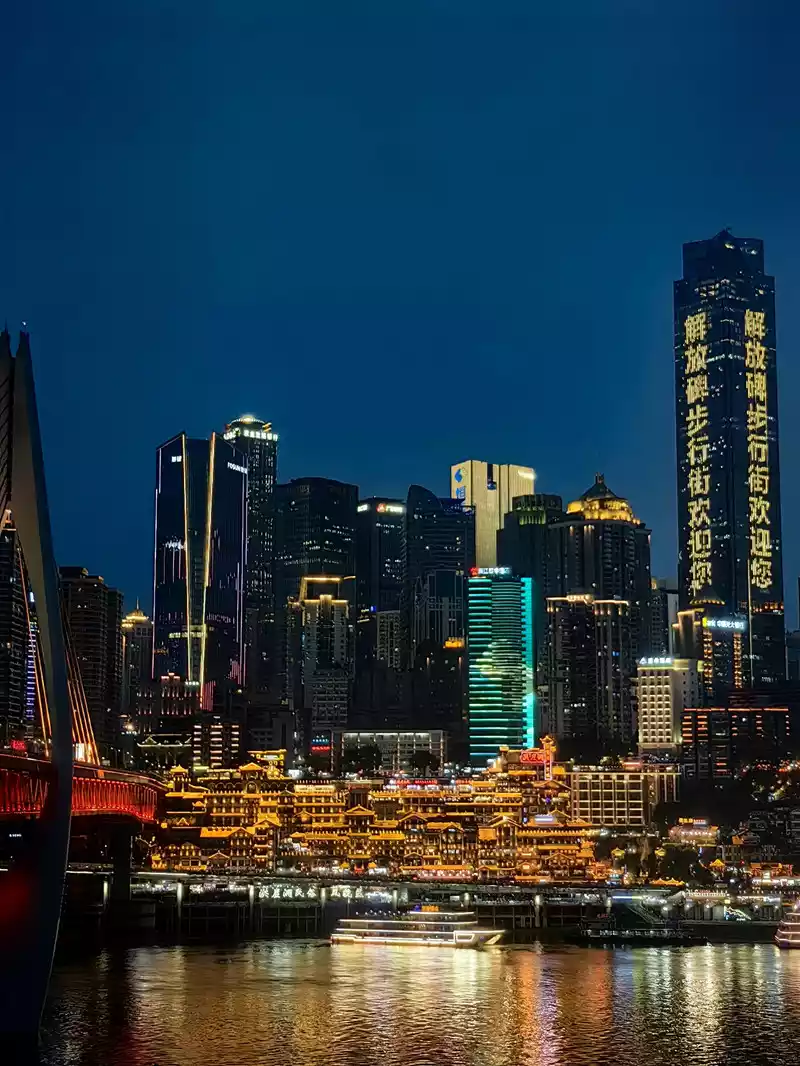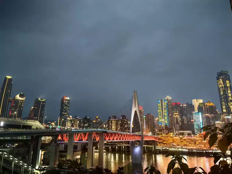 From Chaotianmen, take Line 1, one stop to Xiaoshizi Station, then transfer to Line 6 and one stop across the Jialing River Bridge at Qiansimen to the Grand Theater Station. From there, you can admire the magnificent Chaotianmen architectural complex across the river. I think it's no less stunning than Pudong, and even more visually stunning. It's stunning both during the day and at night when the lights are on. The Hongyadong Cave under the bridge turns on its lights at 8 p.m. sharp.