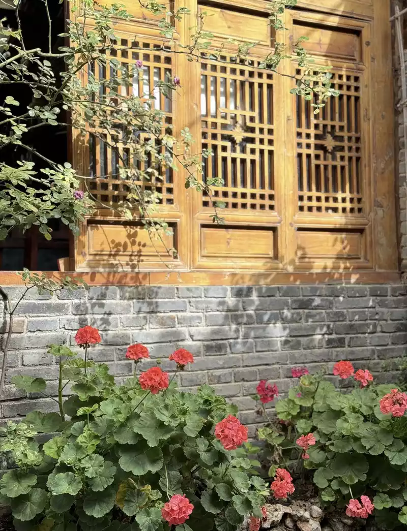 Environment: A small courtyard in the center of Shuhe Ancient Town, with flowers, plants, and fish swimming in the pond.