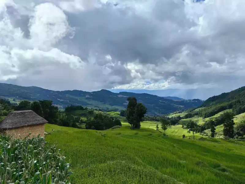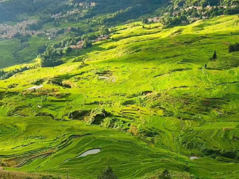 After walking for a long time, I don't know how many turns I made, and stopped at an observation deck, with green terraces in summer on one side and some relatively new mushroom houses on the other. Because I have seen the Longji Terraces and Tang'an Terraces before, the scenery of the terraces is not too amazing to us. But when I went home to sort out the photos, I was beautifully touched by the strong pastoral style in the picture below.