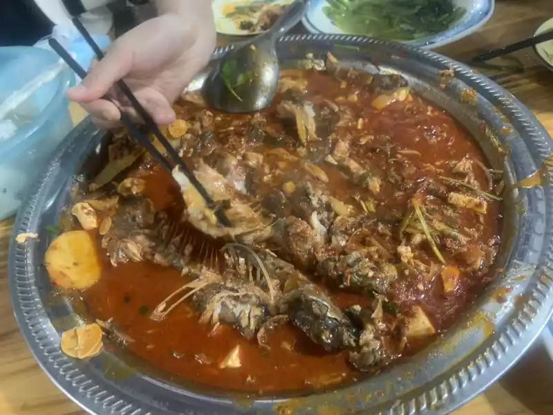 Then we set off for Shaba, a small village on the outskirts of Xiaguan in Dali, which is inconspicuous but famous for its hot and sour fish, and the ingredients are taken from local crucian carp. Locals say that the difference from Guizhou is the use of papaya to extract acid. The per capita consumption is more than 50 yuan.