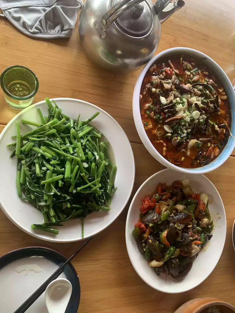 On the last day in Kunming, I slept in, had breakfast and lunch, and found a 15-year-old Sichuan restaurant, Dingfengyuan, next to the east gate of Cuihu Vegetable Market. The children were eating rice noodles downstairs, while the two adults ordered two dishes and a soup for 105 yuan. Yunnan has many varieties of chili peppers, and the stir-fried preserved egg with chili peppers is very appetizing. Sichuan cuisine is indeed the only cuisine that outsiders are not picky about.