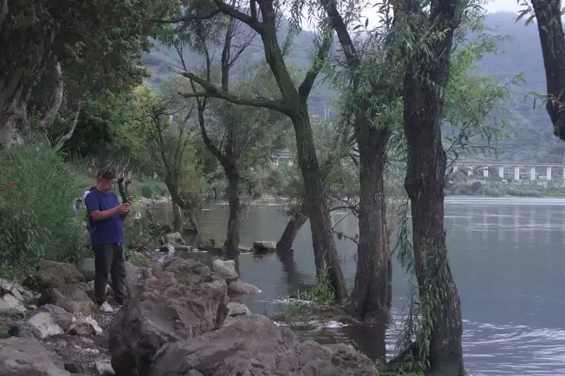 2. Visit Haihong Wetland Park: There was heavy traffic along the way from Longmen to Haihong Park. It was past 5 PM when we arrived at the wetland park entrance. We found a recommendation from netizens for a photo-perfect "boating in the forest" tour, 90 yuan per hour per boat (seats two), but tickets closed at 5 PM. The boating area was actually quite small, but you could still take photos from the shore, which was truly photogenic. 3. Dinner: A search on the website recommended "Qinfa Restaurant" in the city center, a typical, fly-in-the-wall restaurant. We arrived at 7:40 PM, and good food is always good, so we finally had our meal at 8:30 PM. It was delicious and affordable, and I couldn't wait to take photos. We had mint-fried pork ribs, pickled pepper beef, aged potatoes, and pea and tofu soup—three dishes and one soup for 76 yuan. The service wasn't as bad as some netizens had said. Dishes were served table-to-table. The owner said he was afraid of customers rushing to order, so he wouldn't accept them after 9 PM if they didn't take the order. He's a one-man shop with four woks, and he's been running the restaurant for years, earning a good reputation. The hard work pays off.