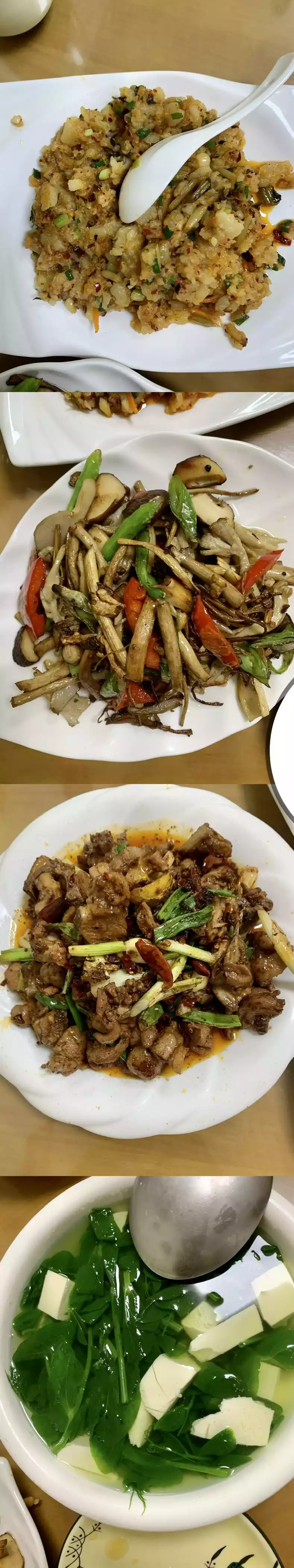 Mushroom Picking in Xiaguan (Downtown). Copper Porridge Beef and Wild Mushroom Hotpot: On the last night in Dali, I went to Xiaguan and rented a car. I booked a 168 yuan set meal for three people nearby. I didn’t recognize any of the 9 kinds of mushrooms, but it was enough for me. The mushrooms and chicken were boiled together for 20 minutes. I drank the soup first and then ate the vegetables. The mushrooms were fresh and the soup was delicious.