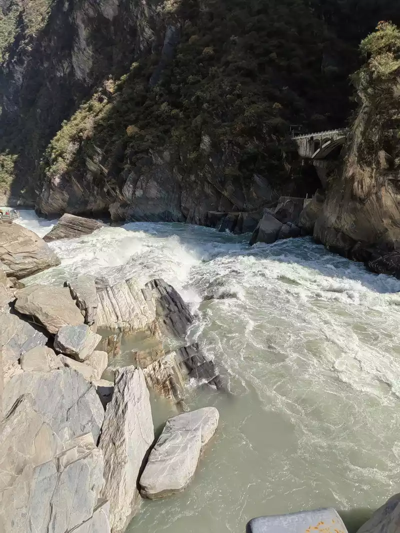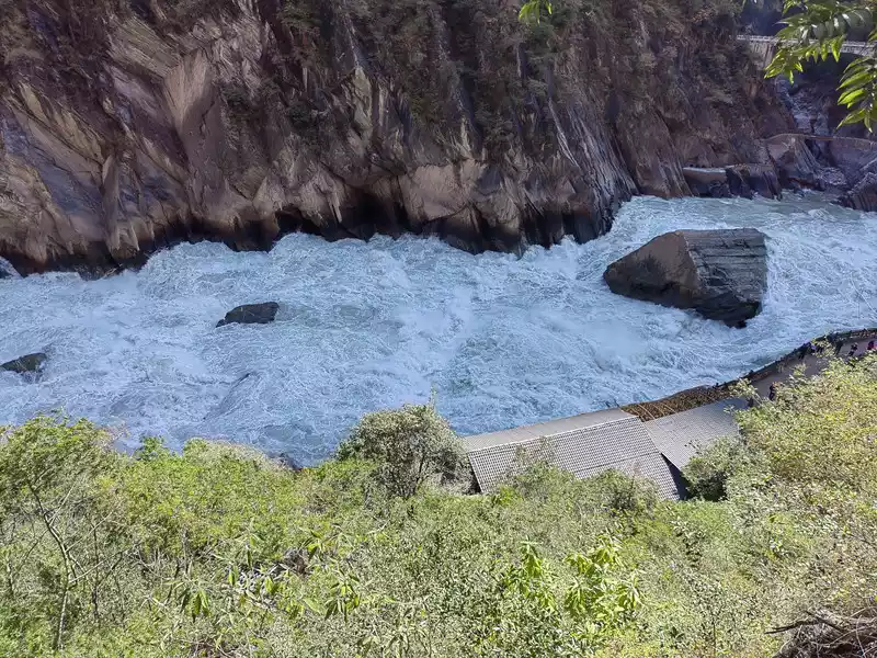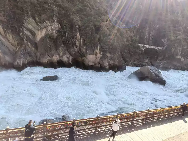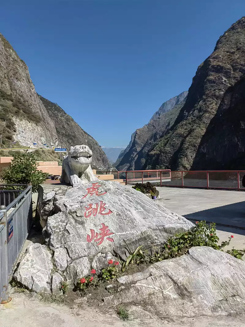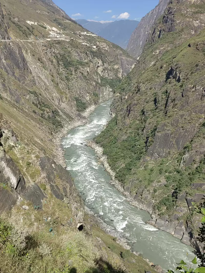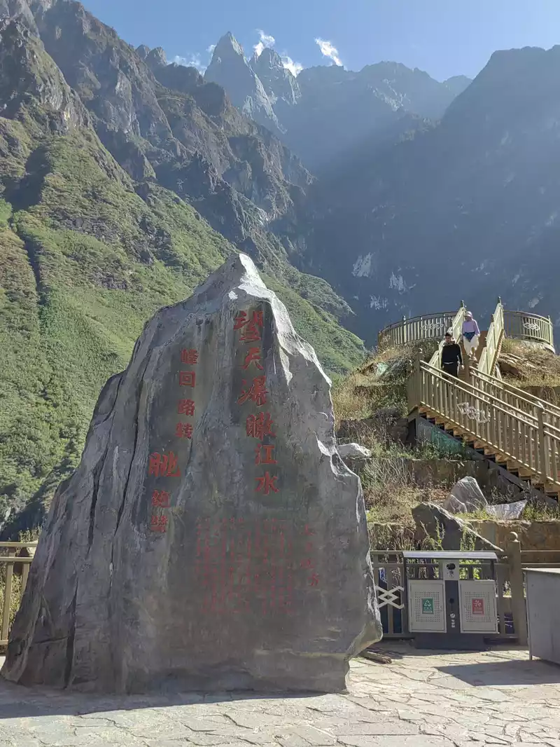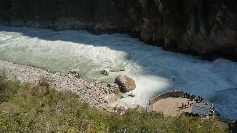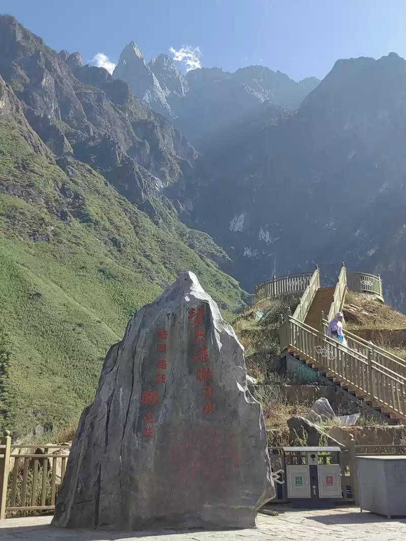 Arrived at the Upper Tiger Leaping Gorge scenic spot in the Tiger Leaping Gorge Scenic Area. From the entrance, you can choose to walk down to the riverbank or take the elevator. Most tourists usually hike down and then take the elevator back up after the tour, saving energy and money while also enjoying the scenic views. Overlooking Tiger Leaping Gorge from the pedestrian stairs