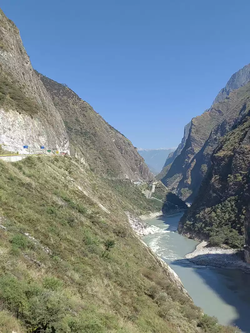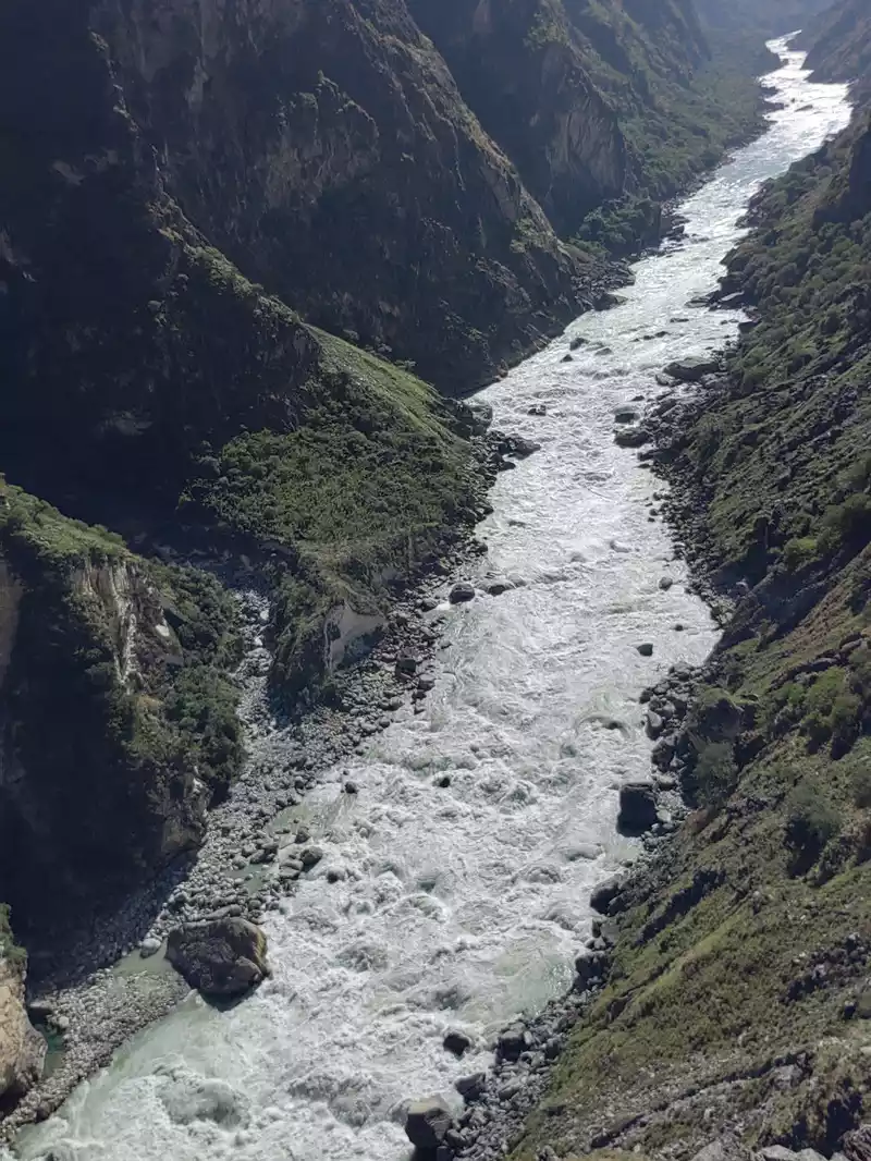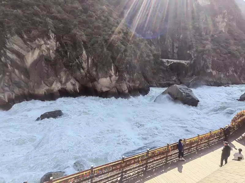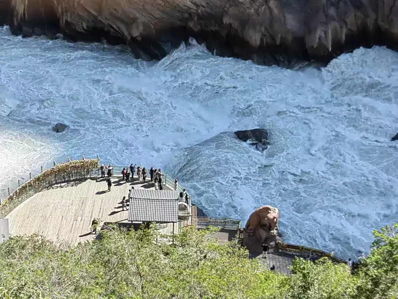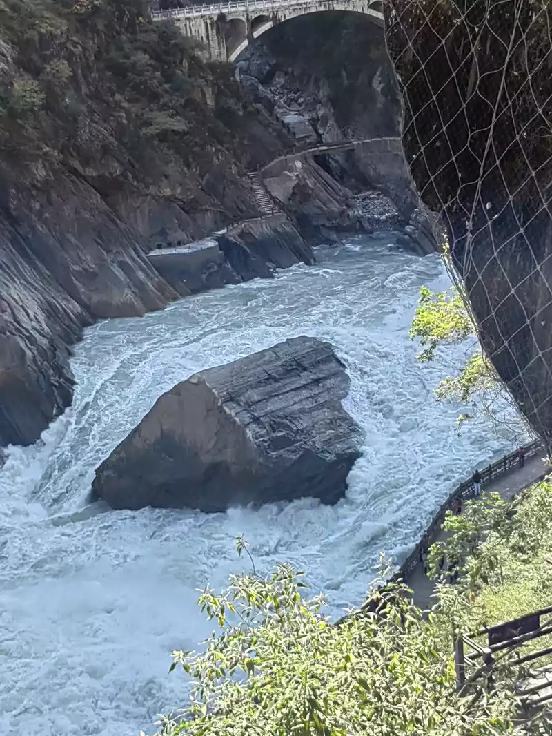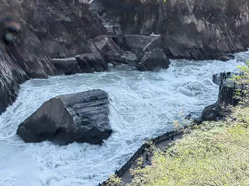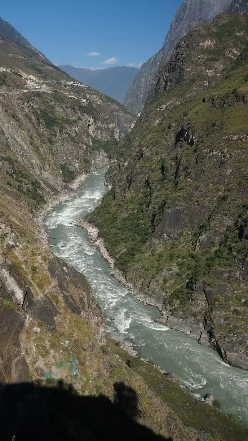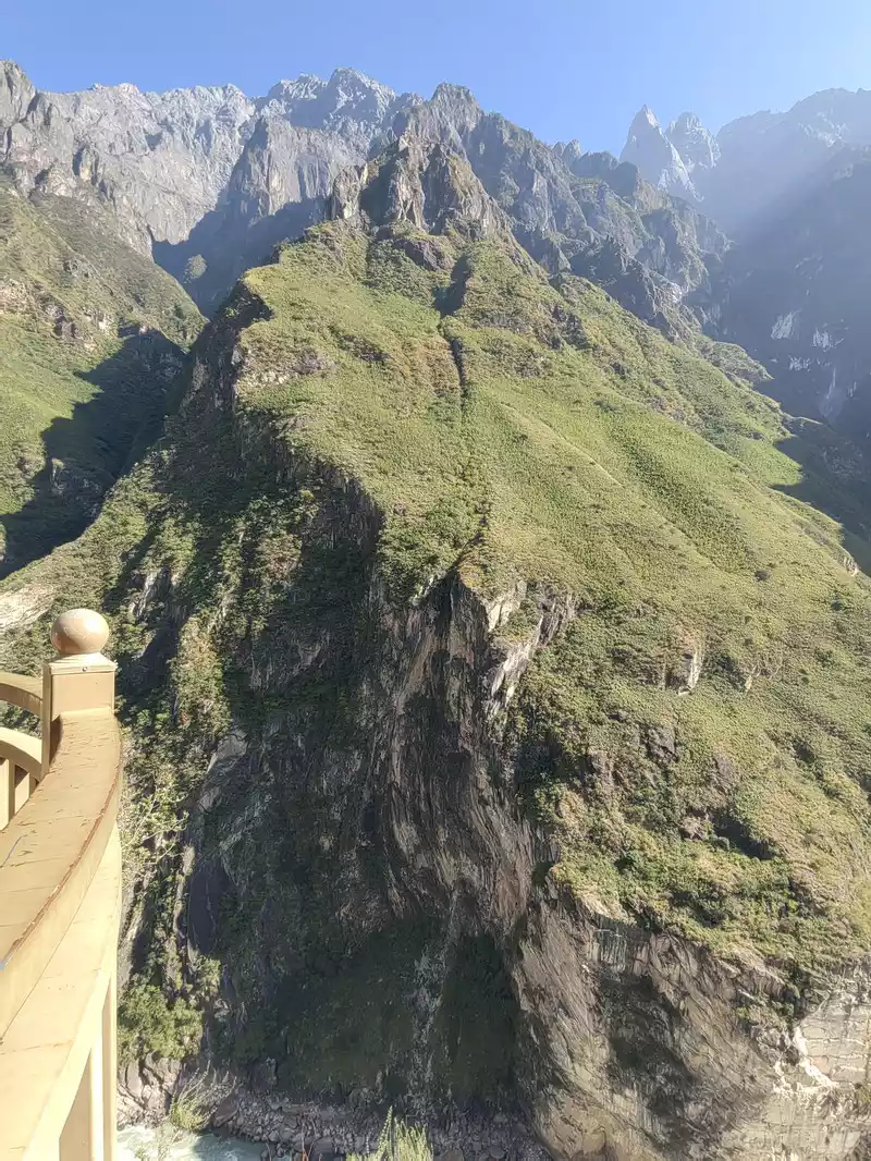 Arrived at the Upper Tiger Leaping Gorge scenic spot in the Tiger Leaping Gorge Scenic Area. From the entrance, you can choose to walk down to the riverbank or take the elevator. Most tourists usually hike down and then take the elevator back up after the tour, saving energy and money while also enjoying the scenic views. Overlooking Tiger Leaping Gorge from the pedestrian stairs