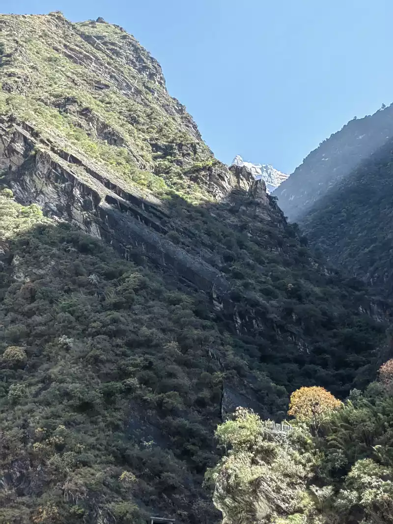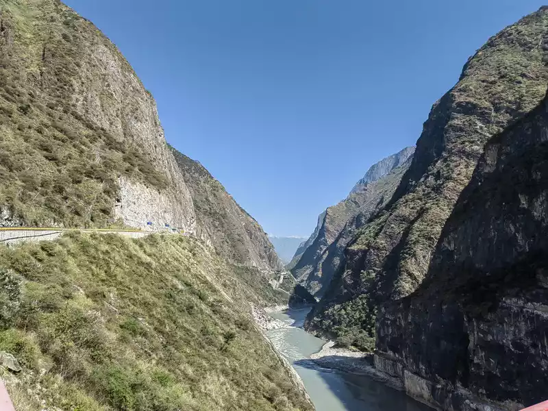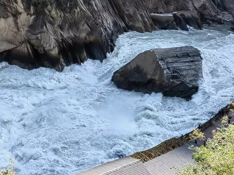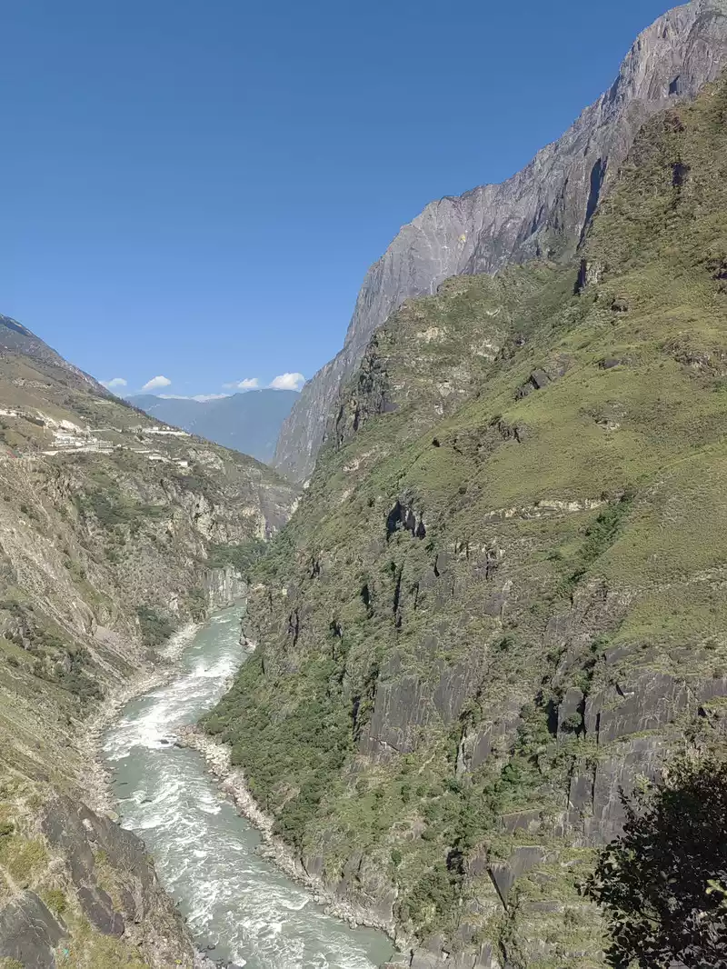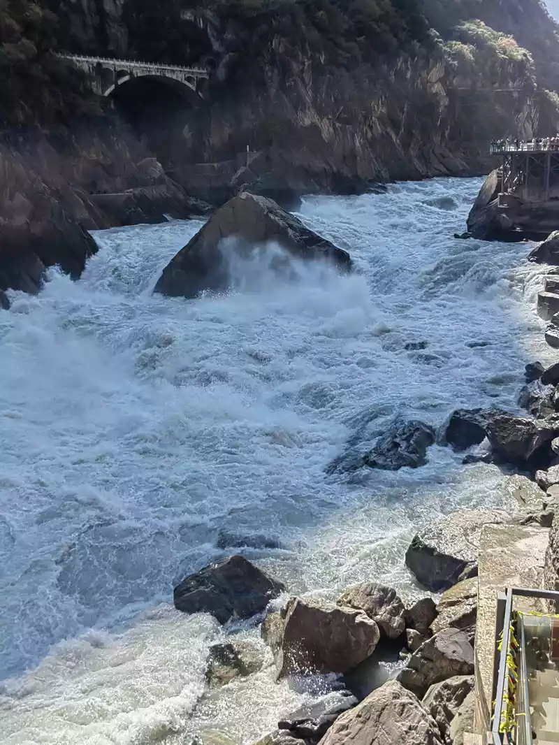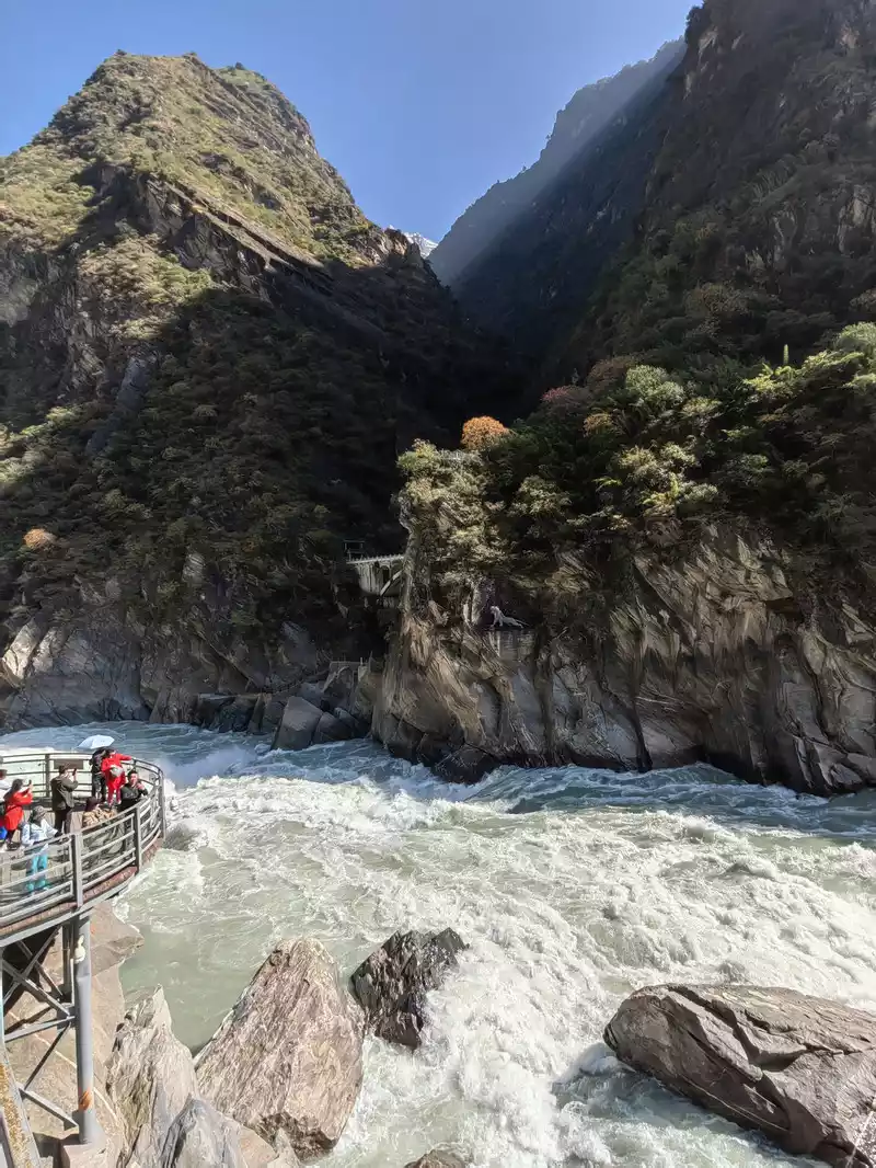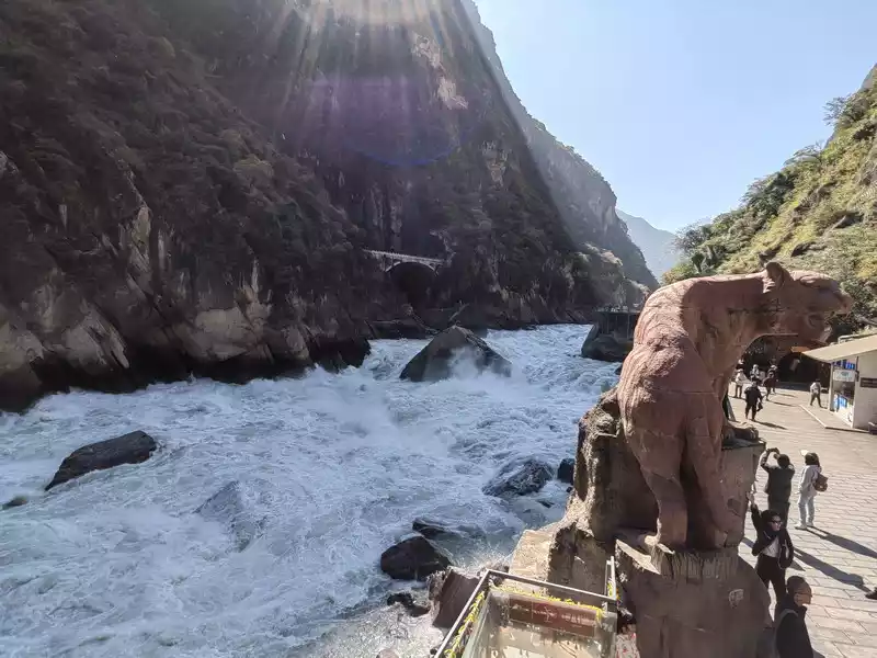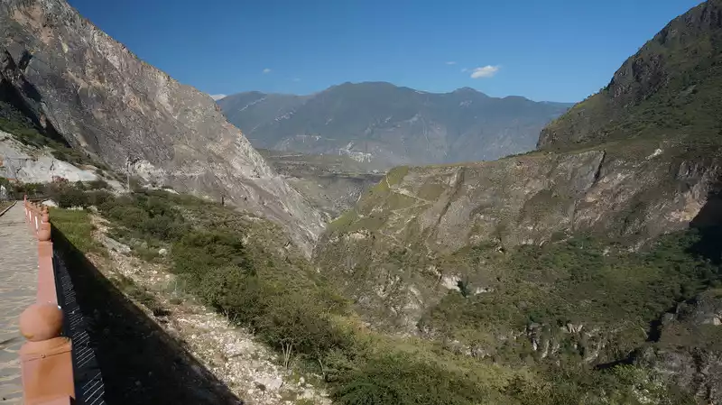 Arrived at the Upper Tiger Leaping Gorge scenic spot in the Tiger Leaping Gorge Scenic Area. From the entrance, you can choose to walk down to the riverbank or take the elevator. Most tourists usually hike down and then take the elevator back up after the tour, saving energy and money while also enjoying the scenic views. Overlooking Tiger Leaping Gorge from the pedestrian stairs