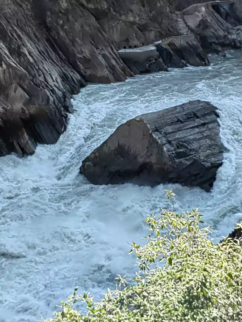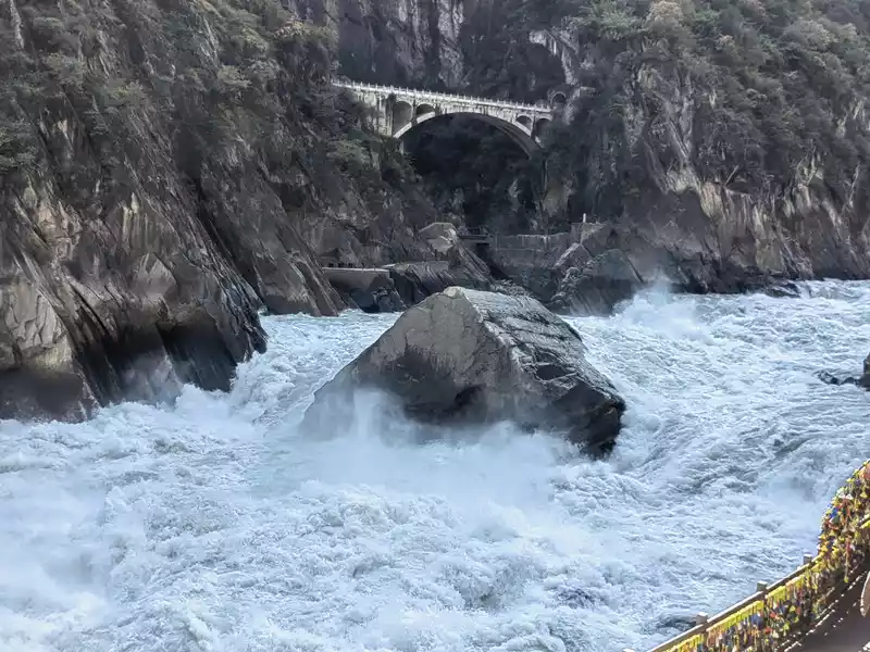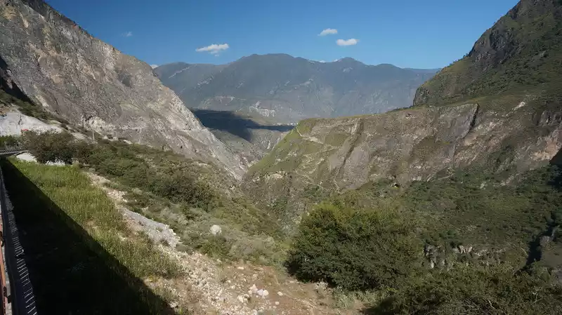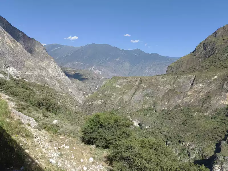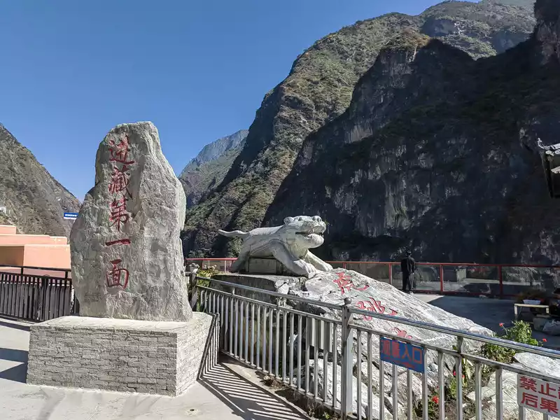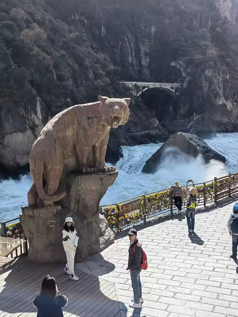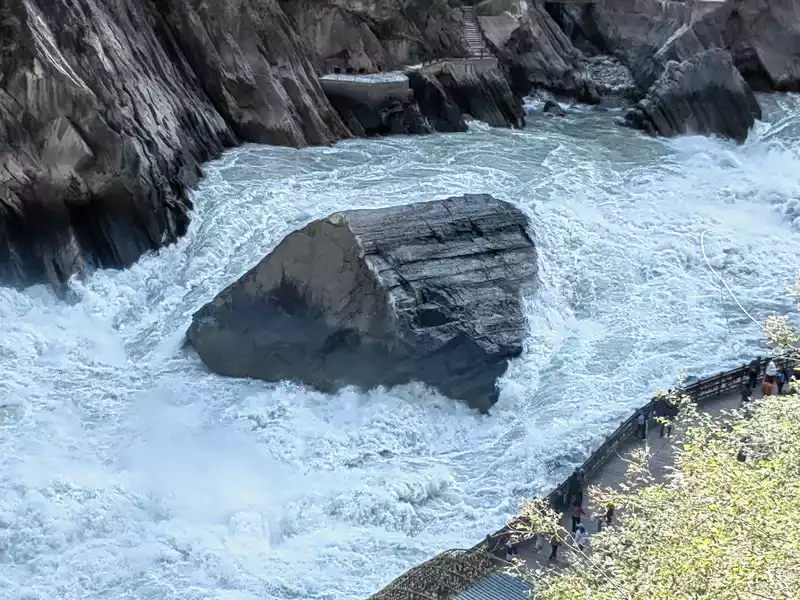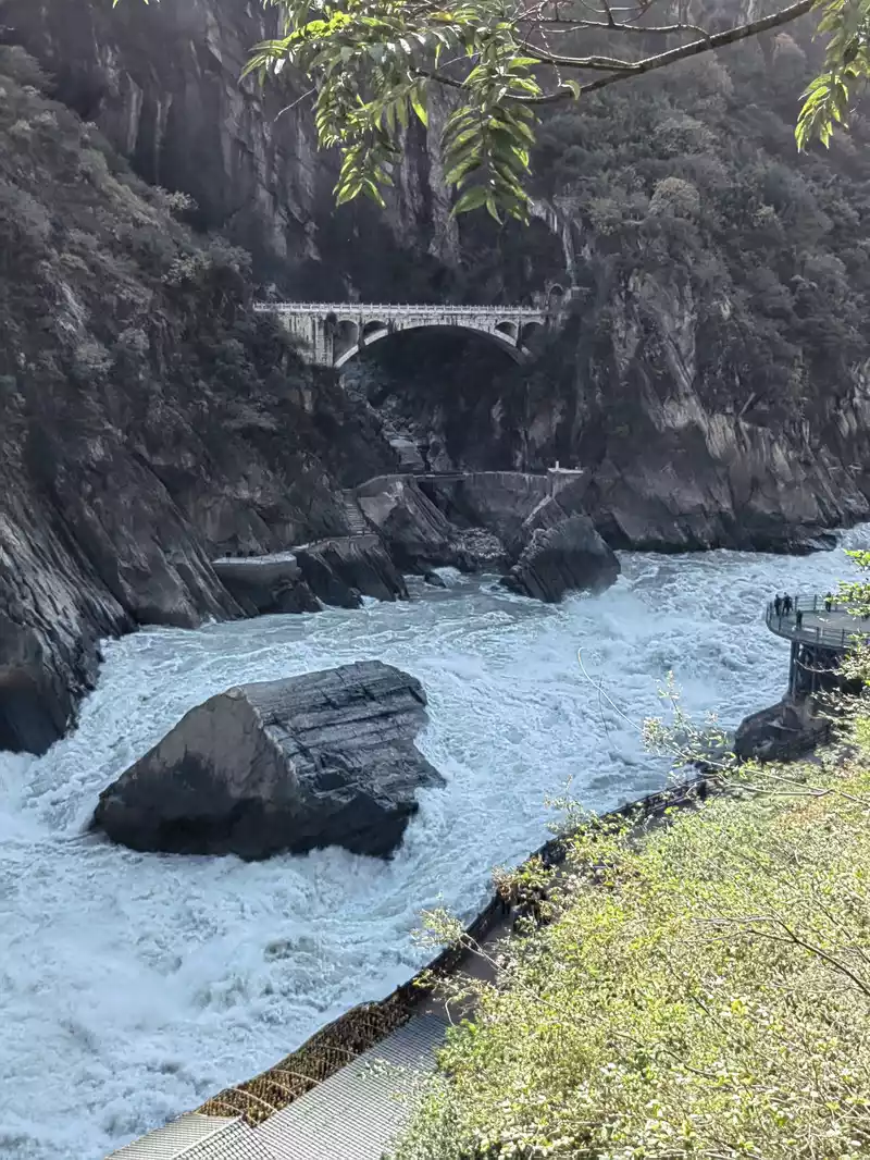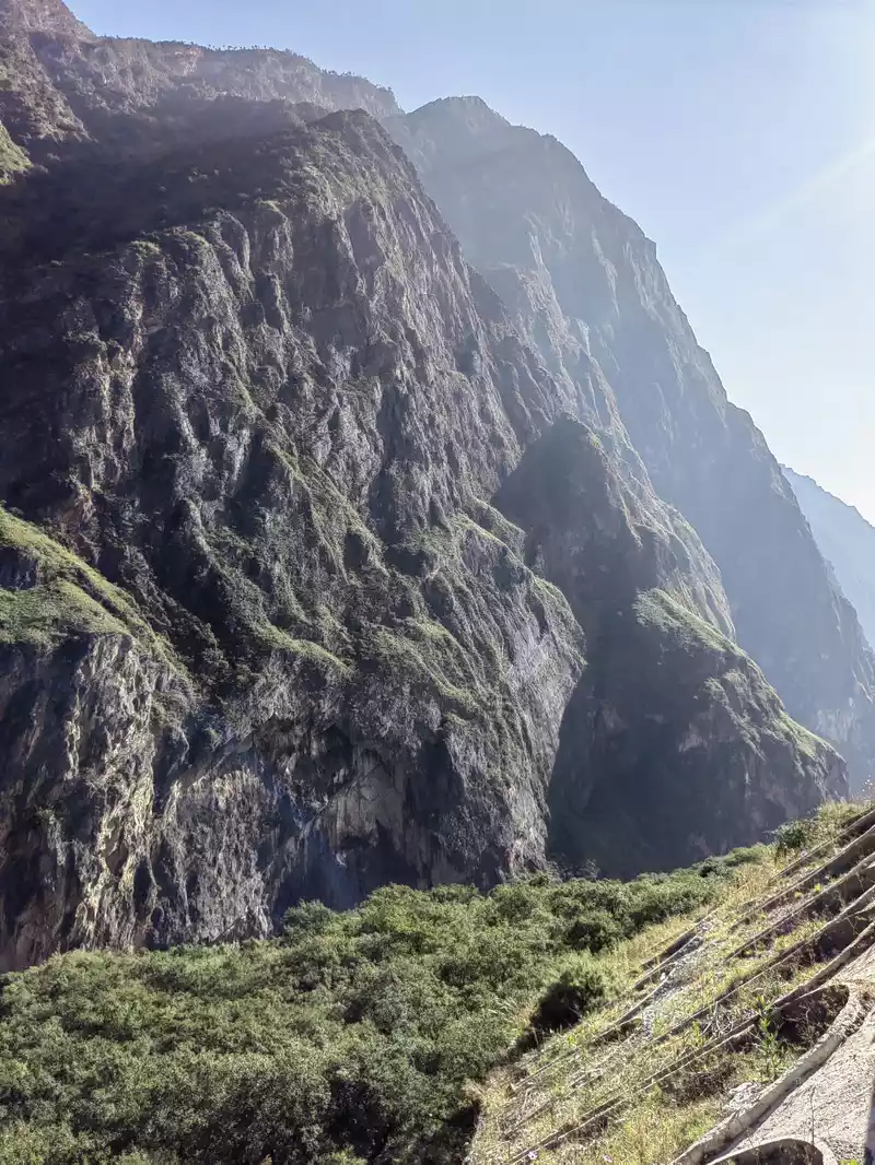 Arrived at the Upper Tiger Leaping Gorge scenic spot in the Tiger Leaping Gorge Scenic Area. From the entrance, you can choose to walk down to the riverbank or take the elevator. Most tourists usually hike down and then take the elevator back up after the tour, saving energy and money while also enjoying the scenic views. Overlooking Tiger Leaping Gorge from the pedestrian stairs