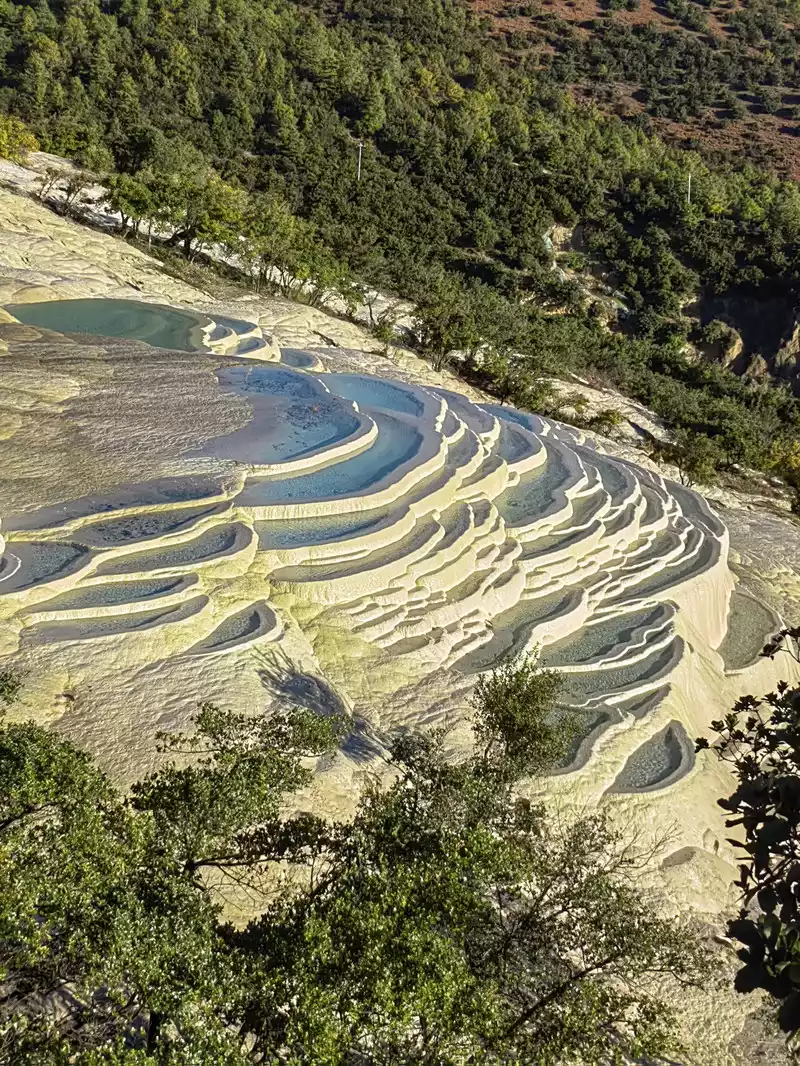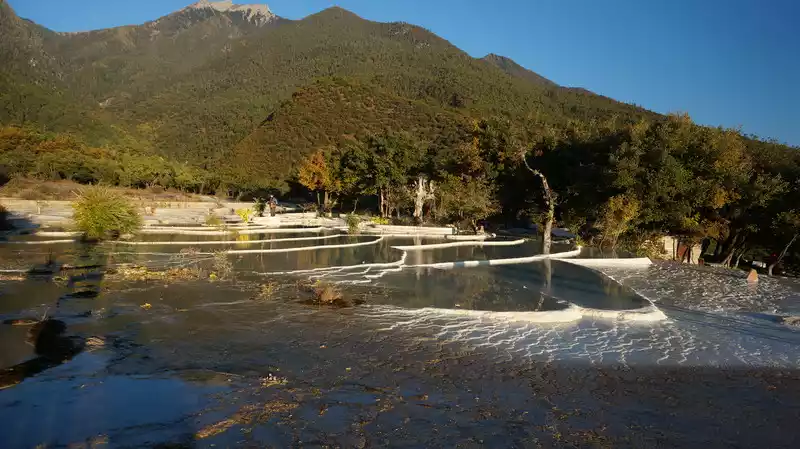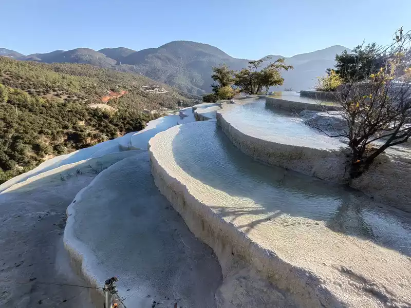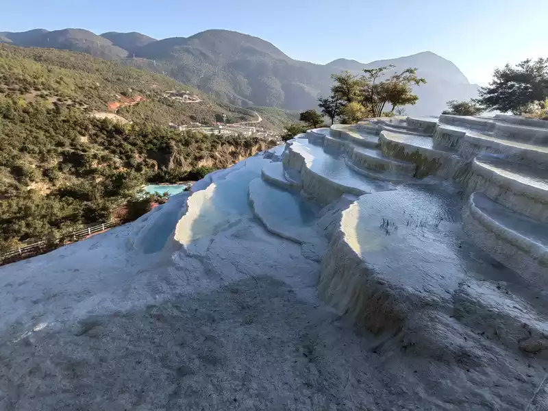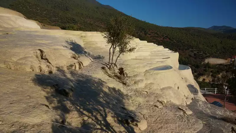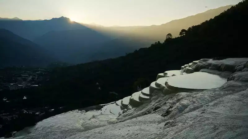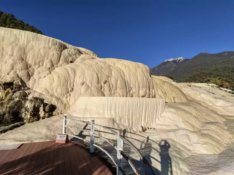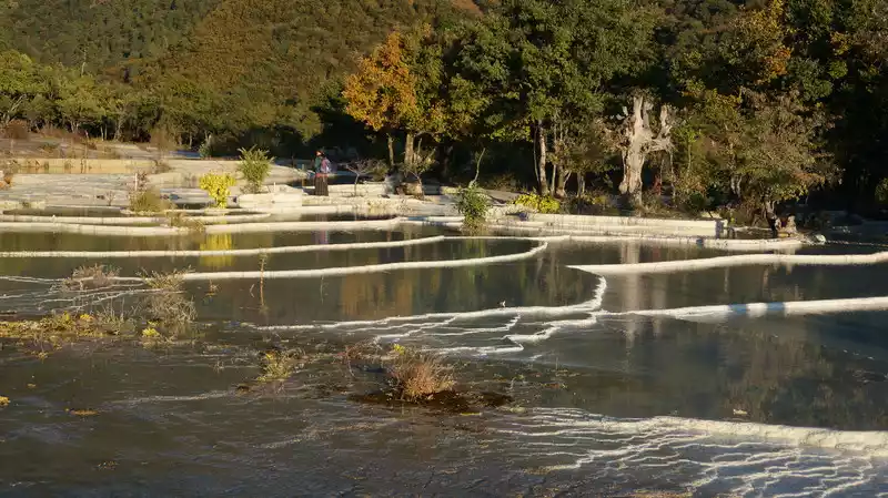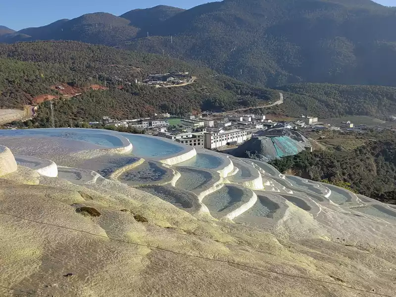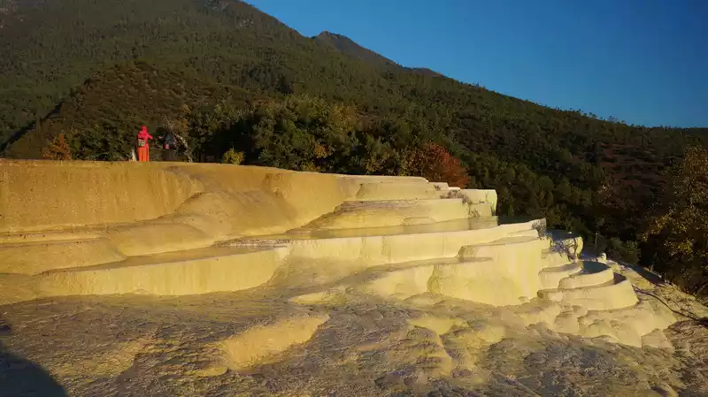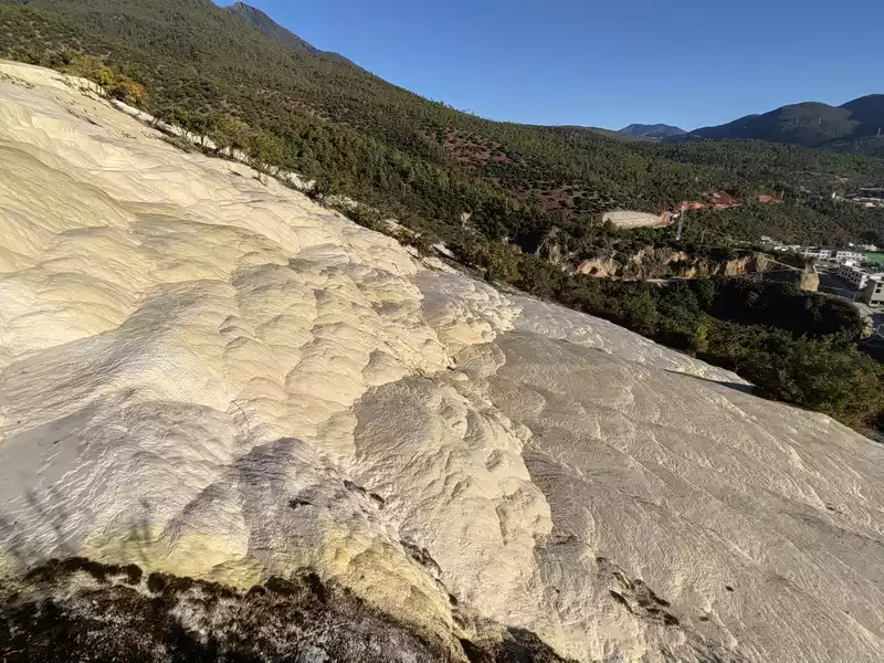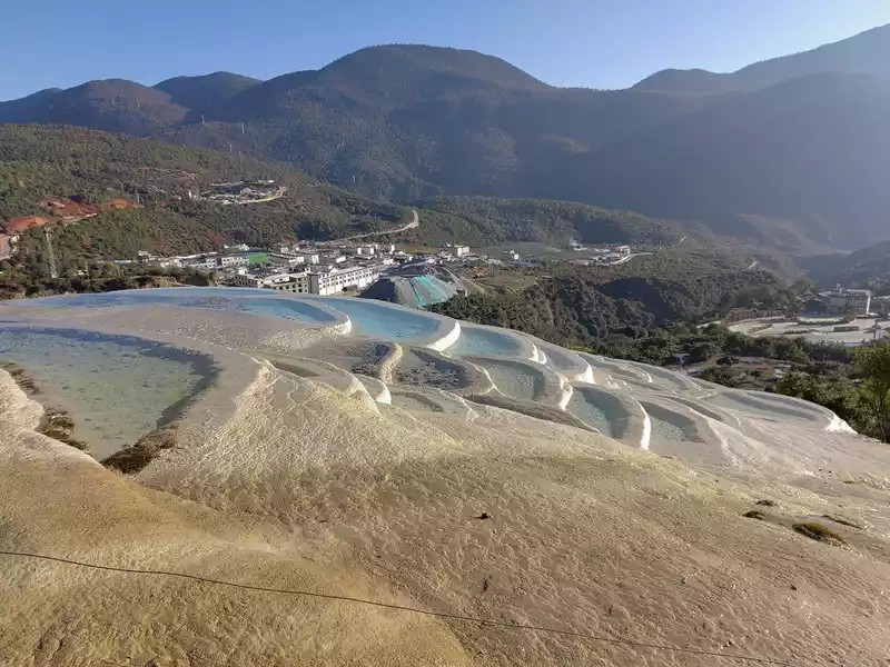 Baishuitai is a unique natural wonder, formed by calcium carbonate dissolving in spring water. As the spring water, rich in calcium carbonate, slowly flows down, the water evaporates and the calcium carbonate salts gradually precipitate, forming a white sediment called "quanhua," which covers the ground. Over the years, this accumulation forms a terraced surface, layered like terraced fields, earning it the nickname "the fields left behind by immortals." Baishuitai is the largest quanhua terrace in my country, covering approximately 3 square kilometers.