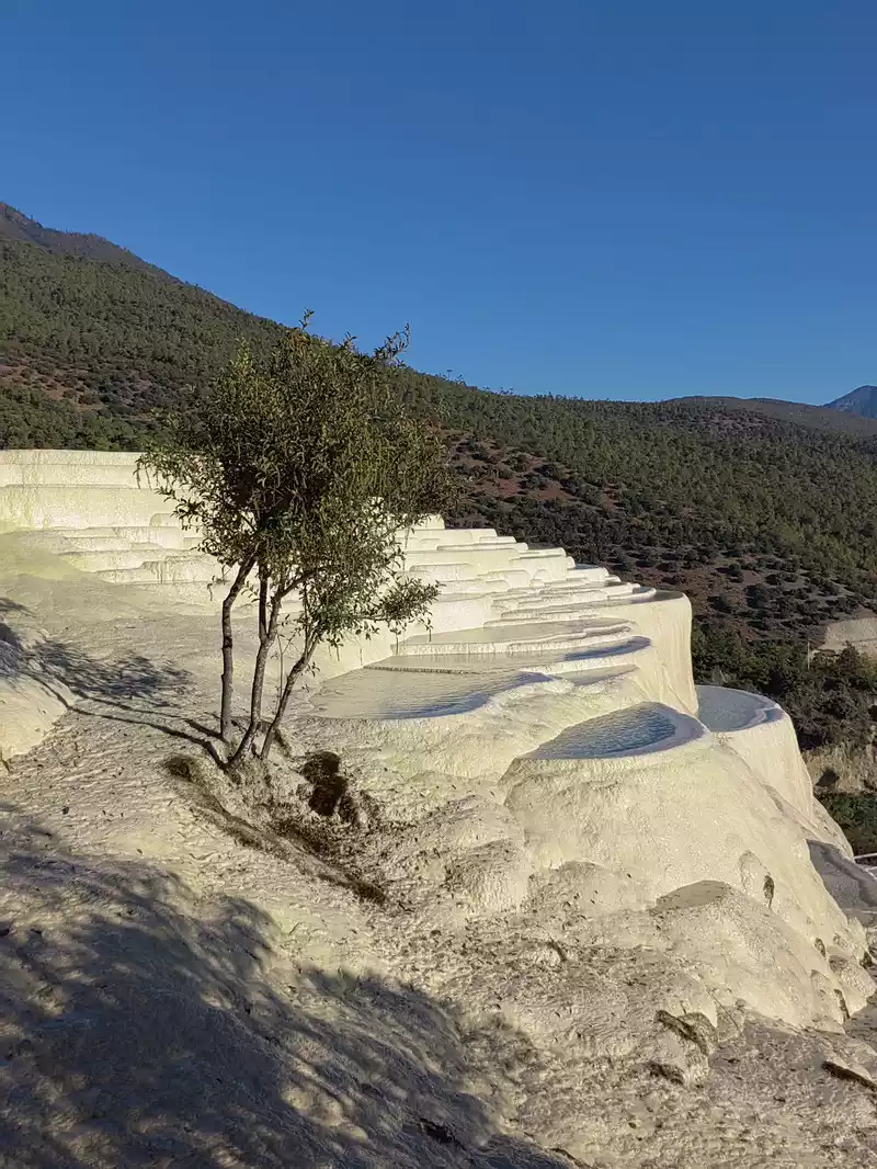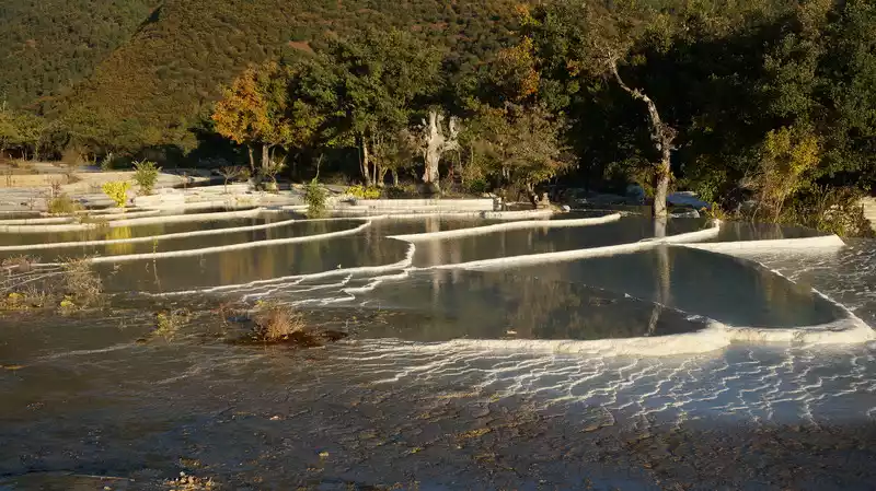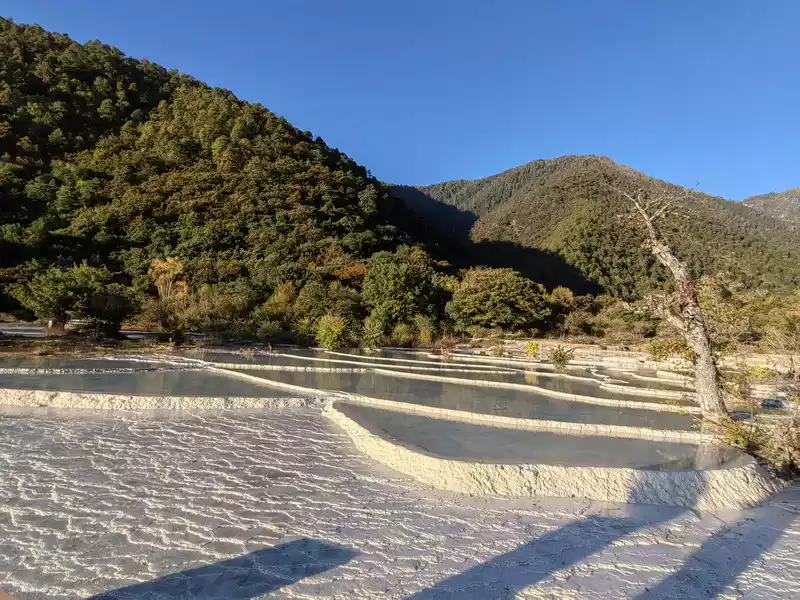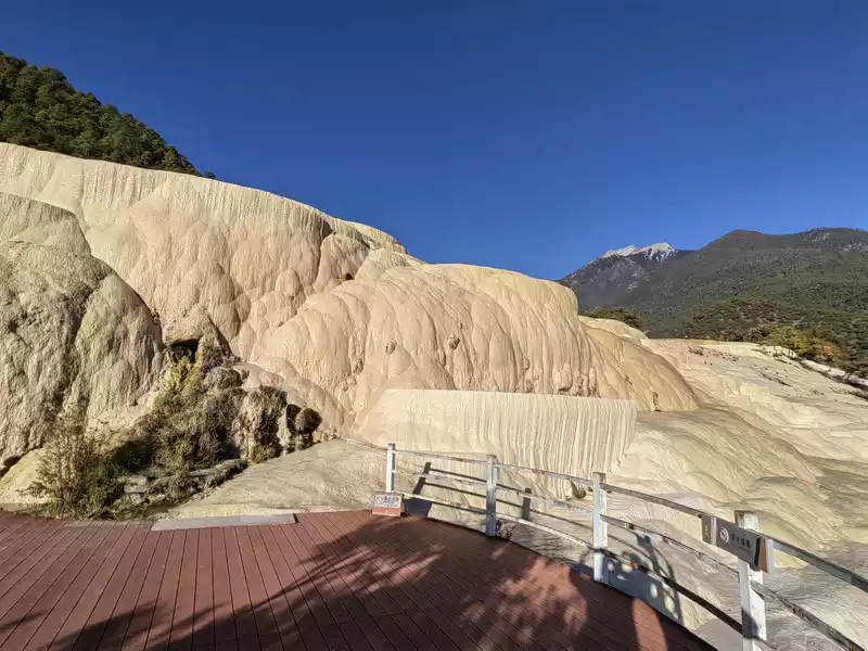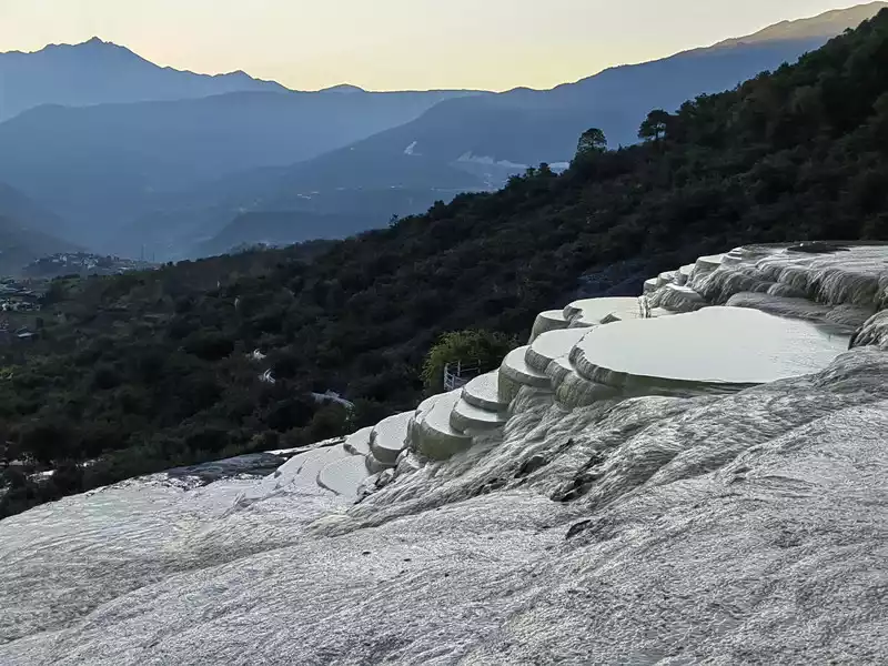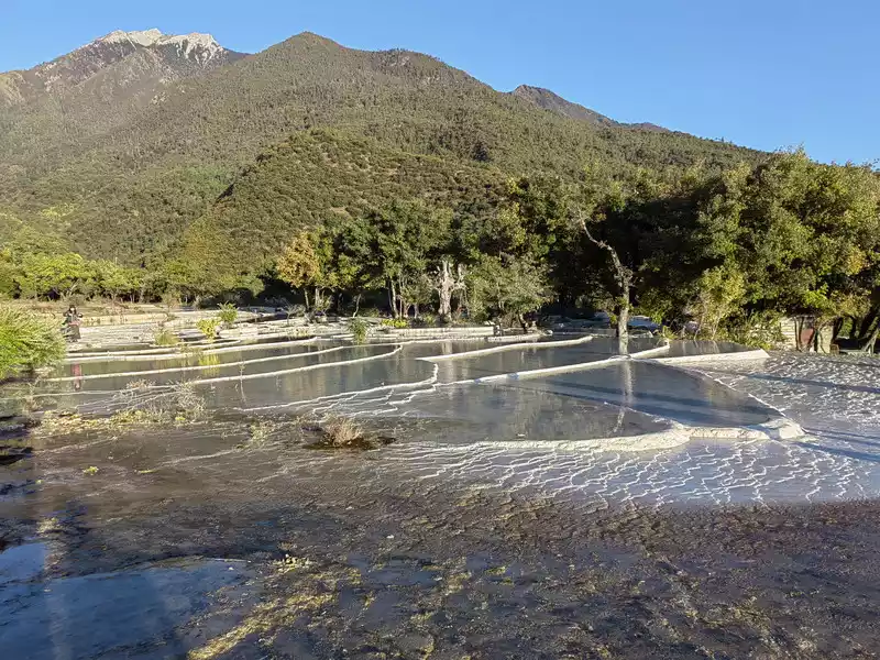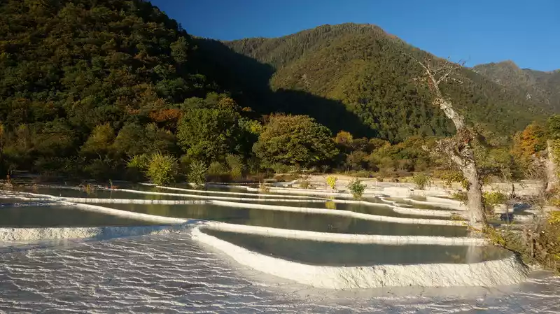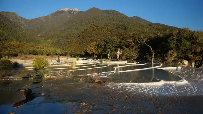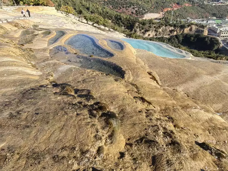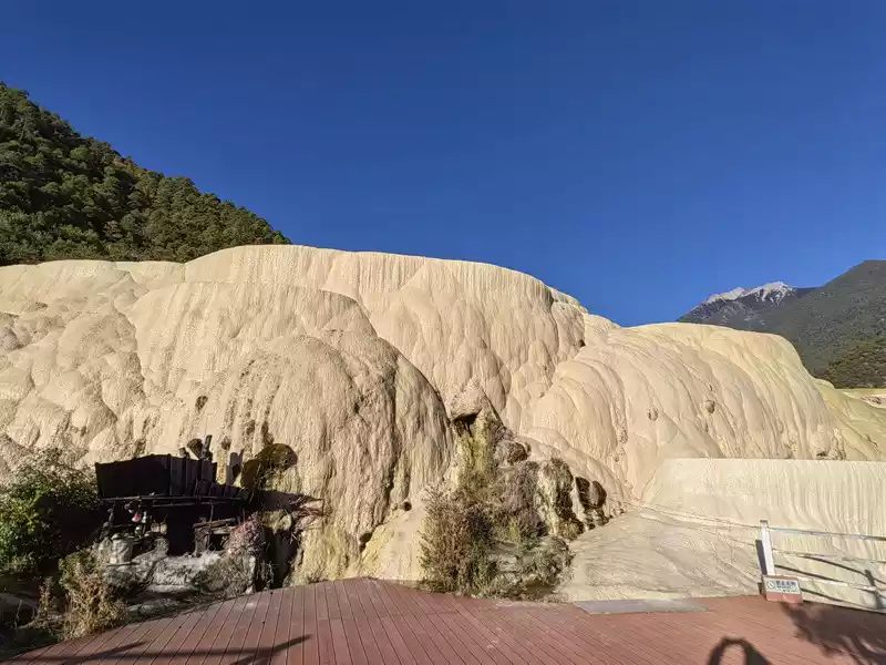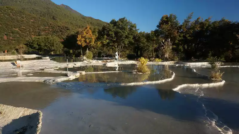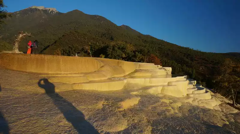Baishuitai is a unique natural wonder, formed by calcium carbonate dissolving in spring water. As the spring water, rich in calcium carbonate, slowly flows down, the water evaporates and the calcium carbonate salts gradually precipitate, forming a white sediment called "quanhua," which covers the ground. Over the years, this accumulation forms a terraced surface, layered like terraced fields, earning it the nickname "the fields left behind by immortals." Baishuitai is the largest quanhua terrace in my country, covering approximately 3 square kilometers.