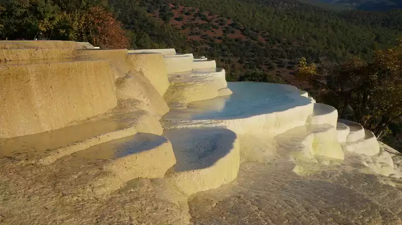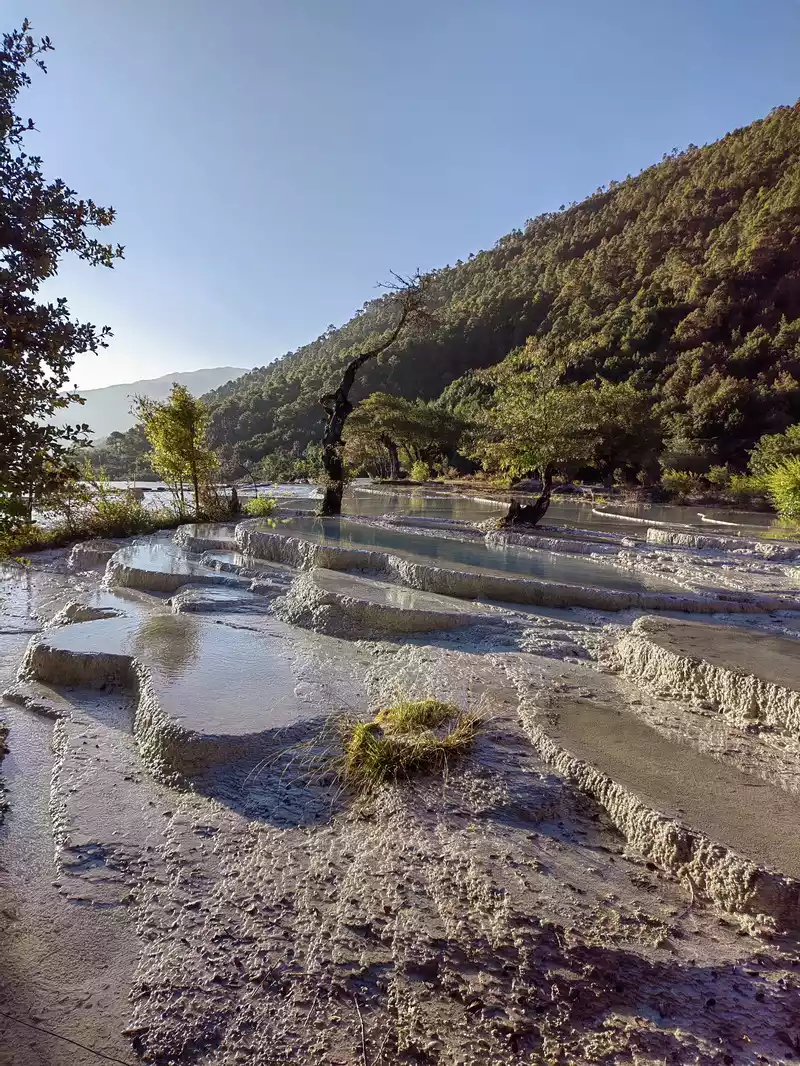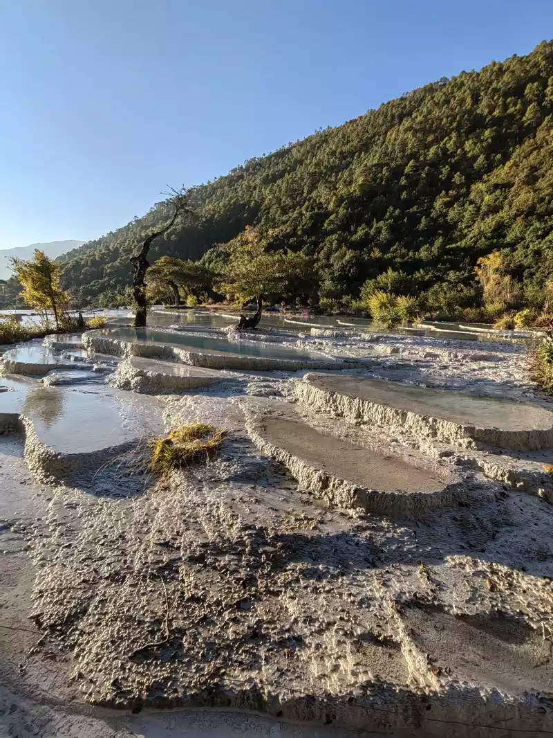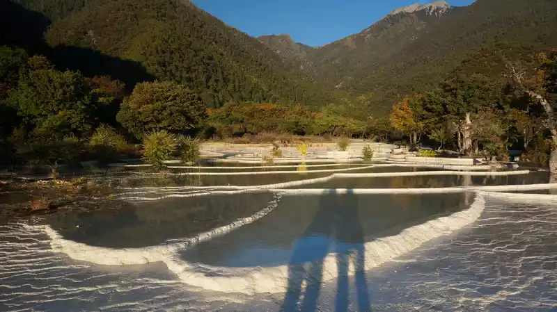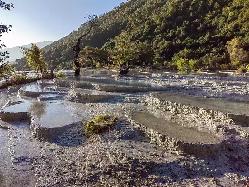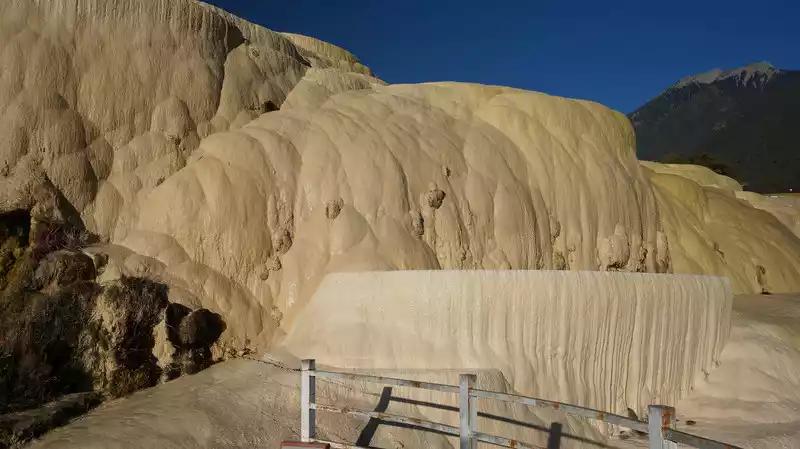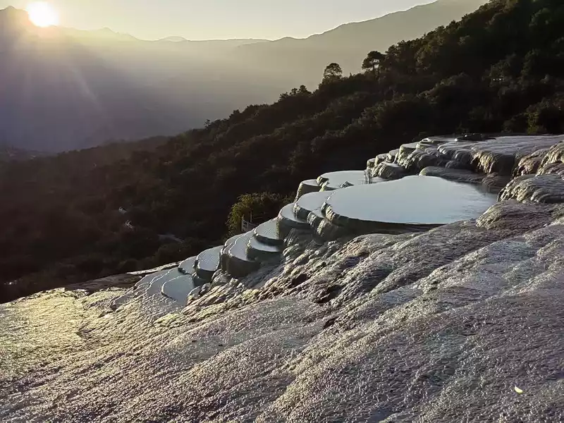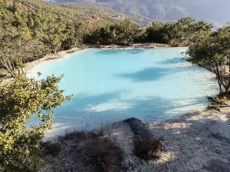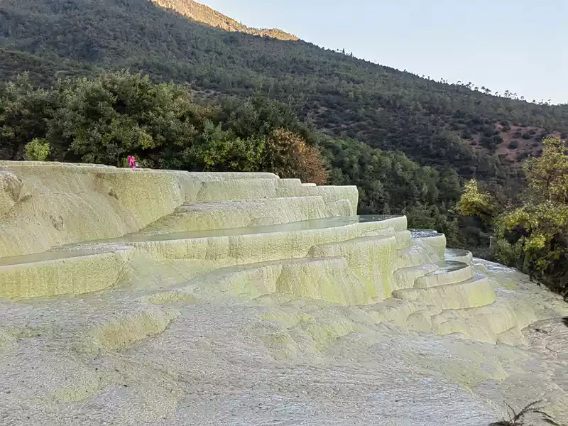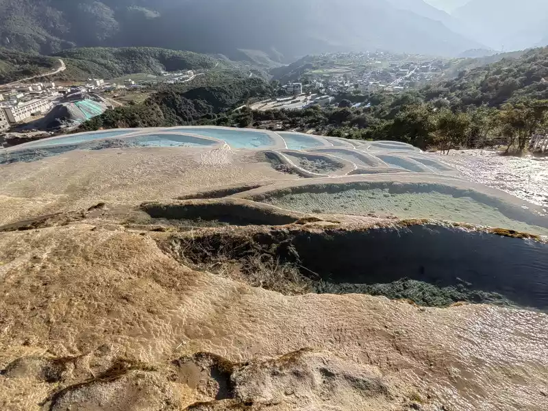 Baishuitai is a unique natural wonder, formed by calcium carbonate dissolving in spring water. As the spring water, rich in calcium carbonate, slowly flows down, the water evaporates and the calcium carbonate salts gradually precipitate, forming a white sediment called "quanhua," which covers the ground. Over the years, this accumulation forms a terraced surface, layered like terraced fields, earning it the nickname "the fields left behind by immortals." Baishuitai is the largest quanhua terrace in my country, covering approximately 3 square kilometers.