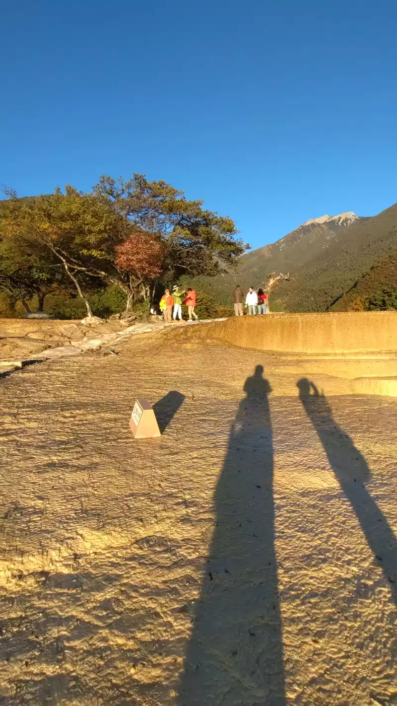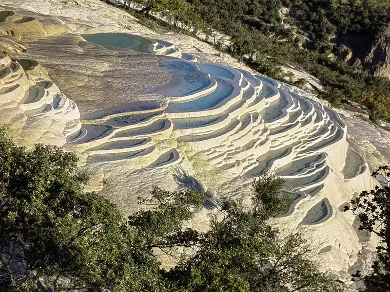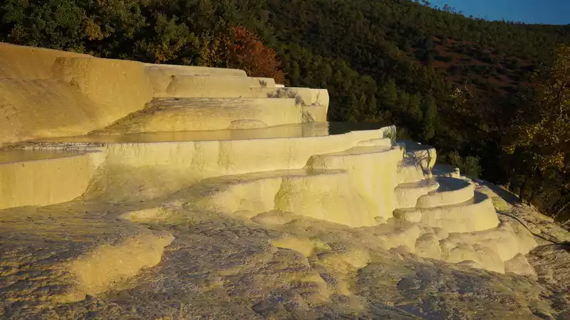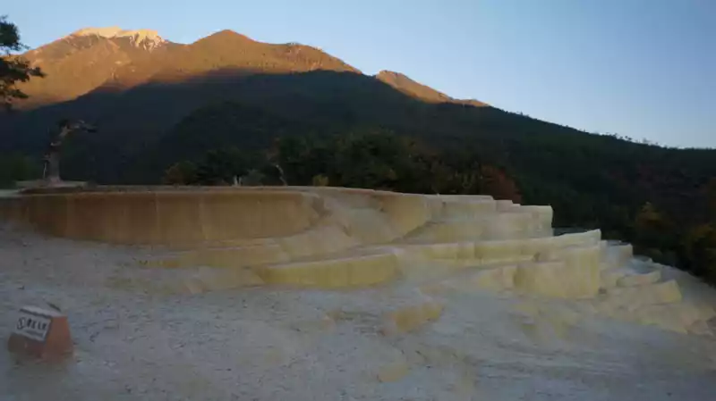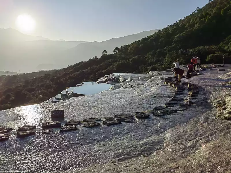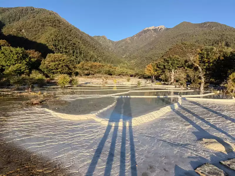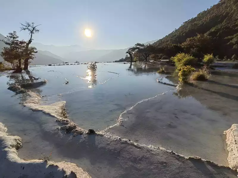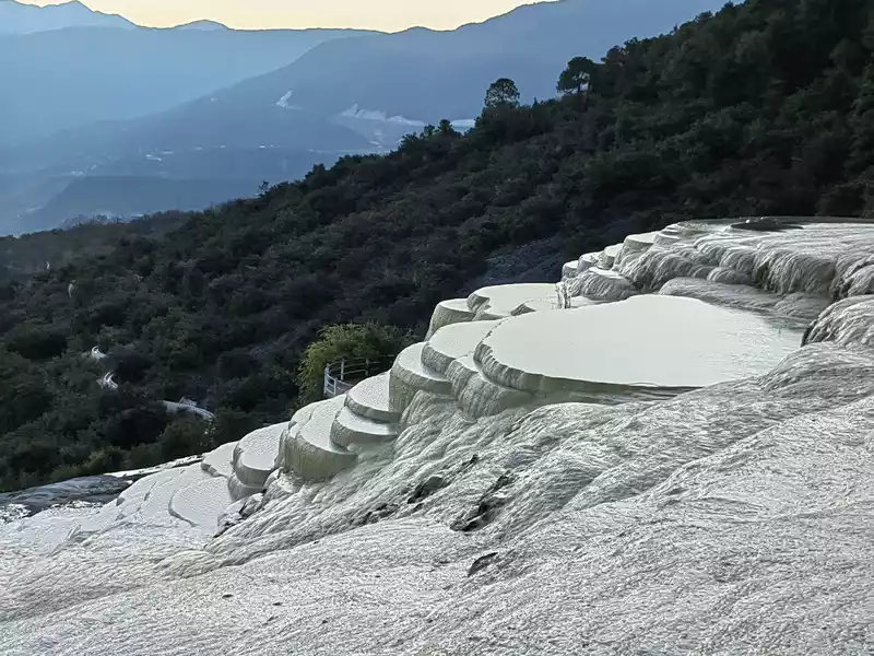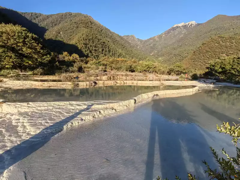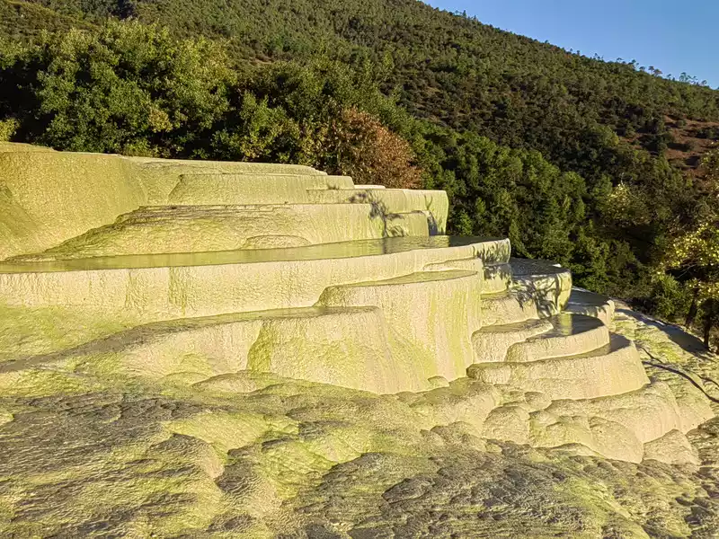 Baishuitai is a unique natural wonder, formed by calcium carbonate dissolving in spring water. As the spring water, rich in calcium carbonate, slowly flows down, the water evaporates and the calcium carbonate salts gradually precipitate, forming a white sediment called "quanhua," which covers the ground. Over the years, this accumulation forms a terraced surface, layered like terraced fields, earning it the nickname "the fields left behind by immortals." Baishuitai is the largest quanhua terrace in my country, covering approximately 3 square kilometers.