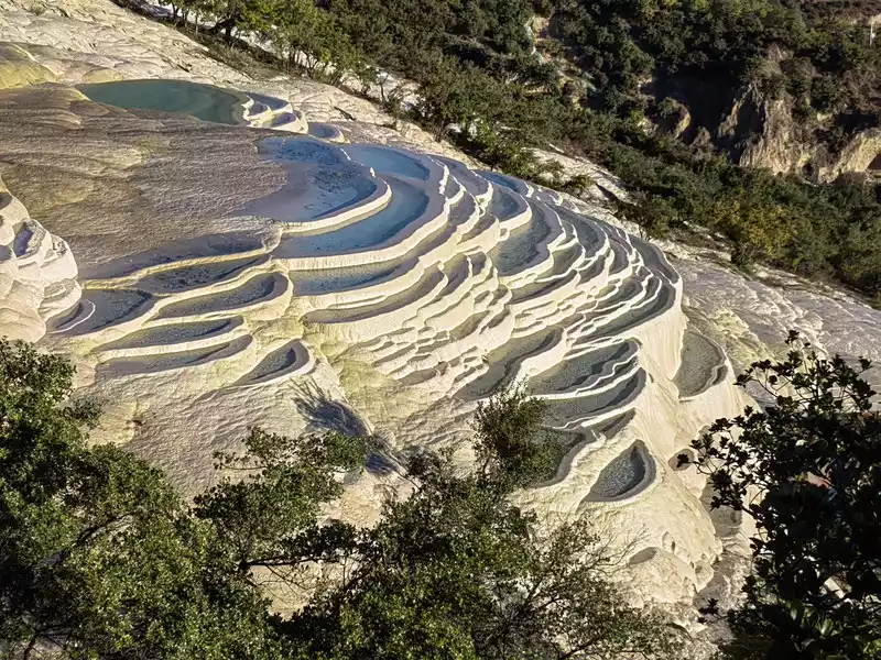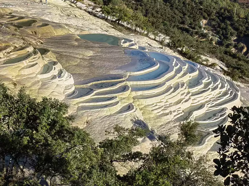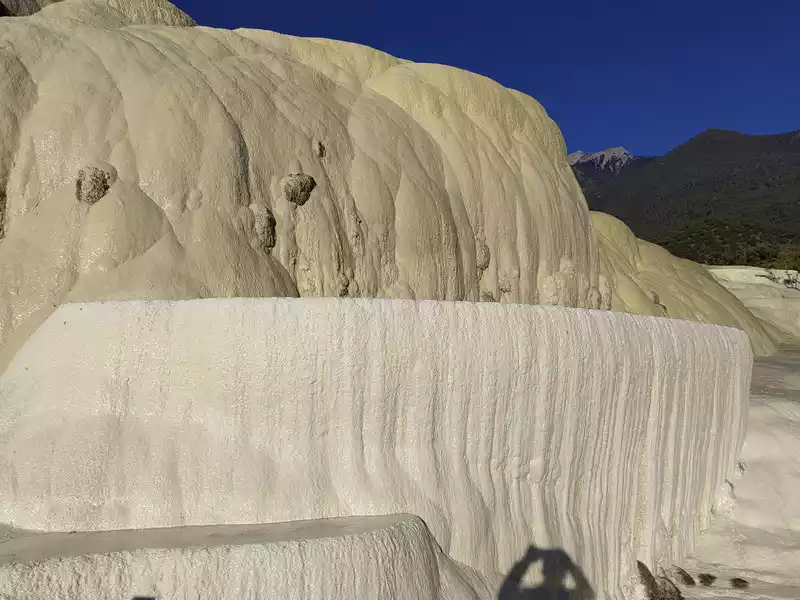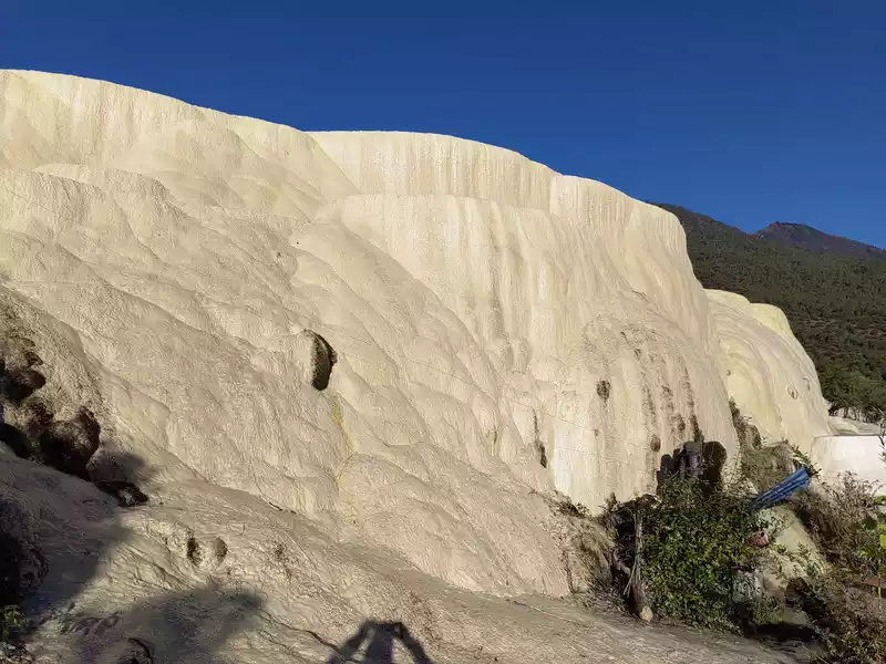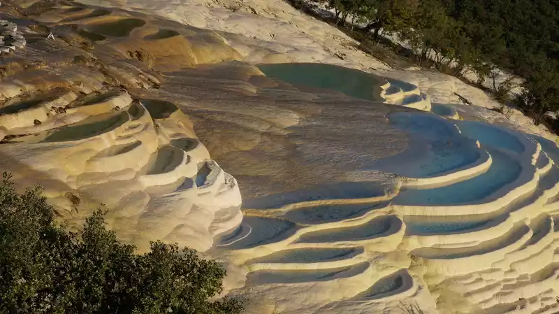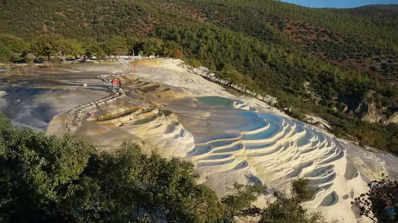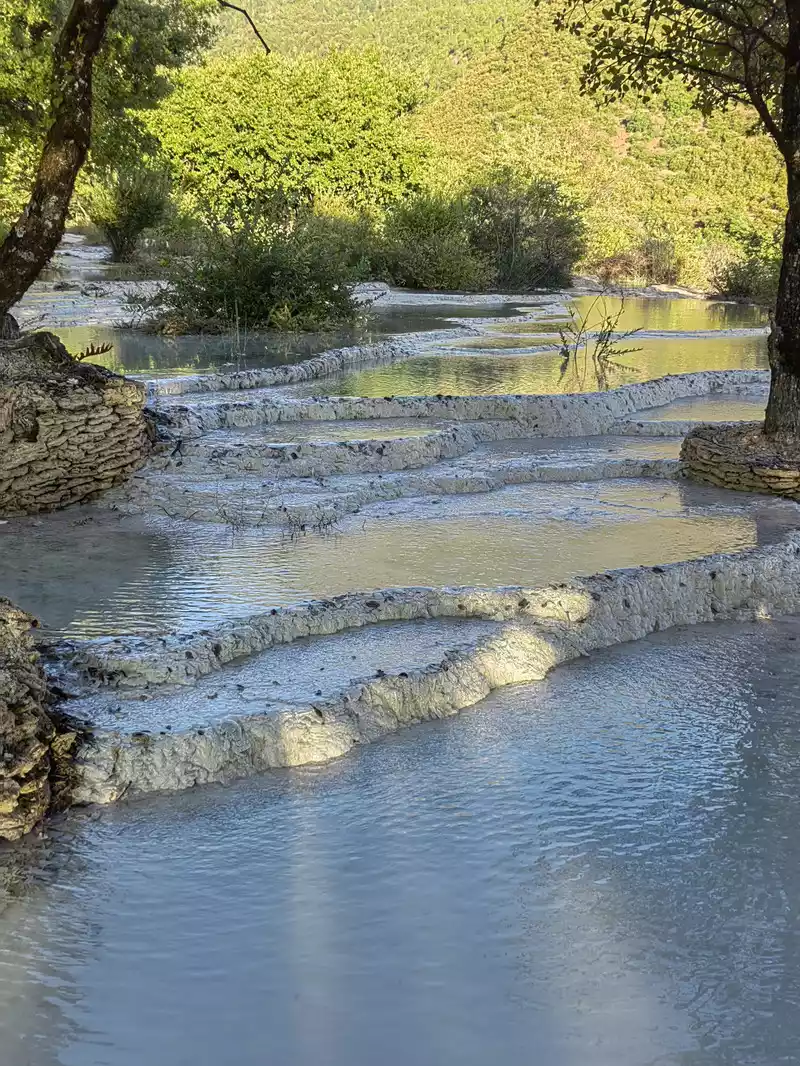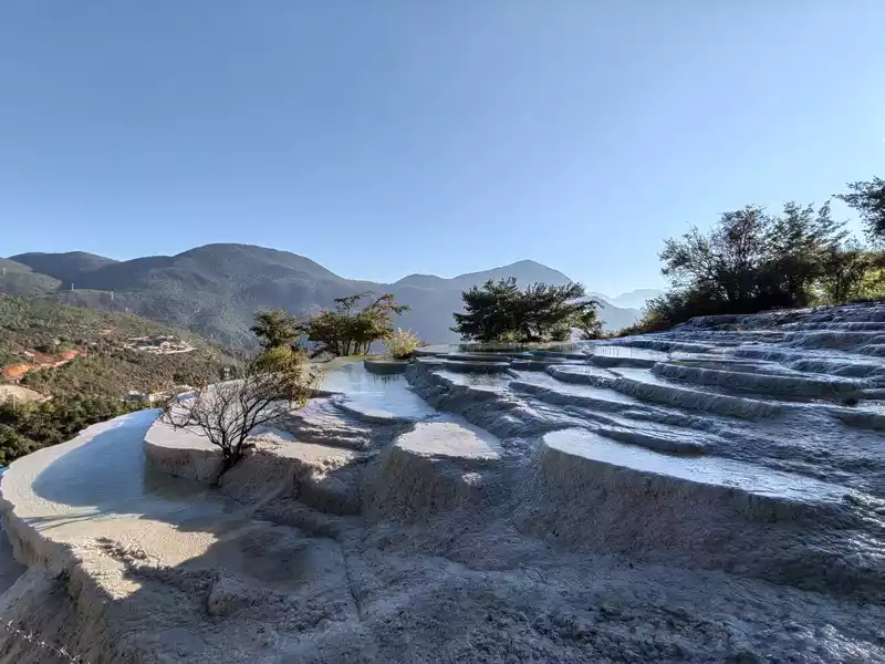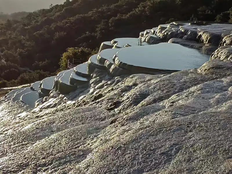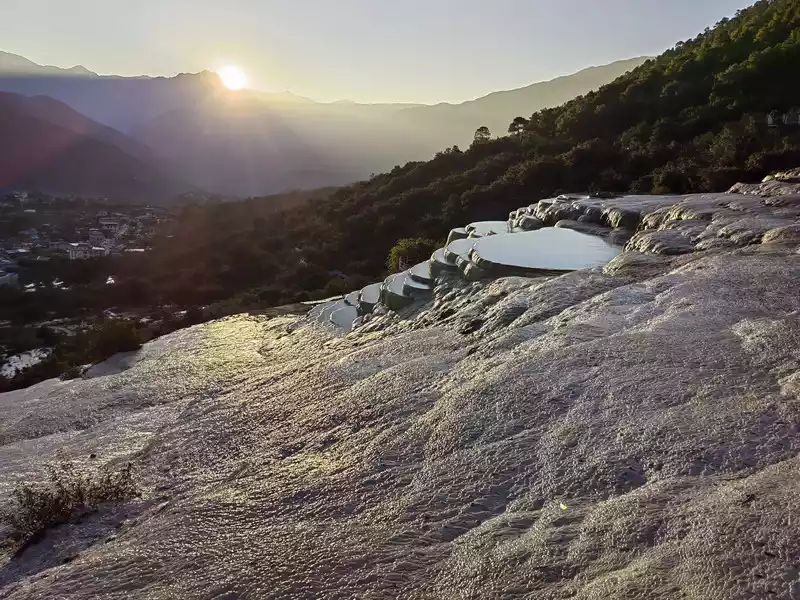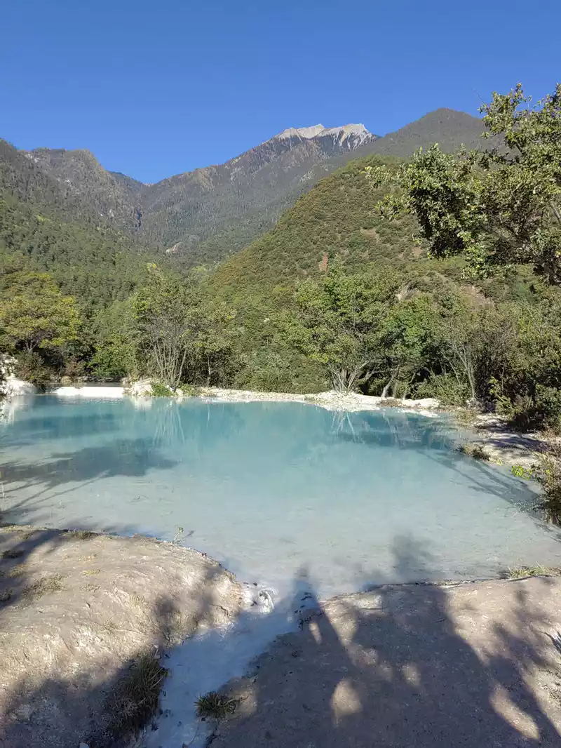 Baishuitai is a unique natural wonder, formed by calcium carbonate dissolving in spring water. As the spring water, rich in calcium carbonate, slowly flows down, the water evaporates and the calcium carbonate salts gradually precipitate, forming a white sediment called "quanhua," which covers the ground. Over the years, this accumulation forms a terraced surface, layered like terraced fields, earning it the nickname "the fields left behind by immortals." Baishuitai is the largest quanhua terrace in my country, covering approximately 3 square kilometers.