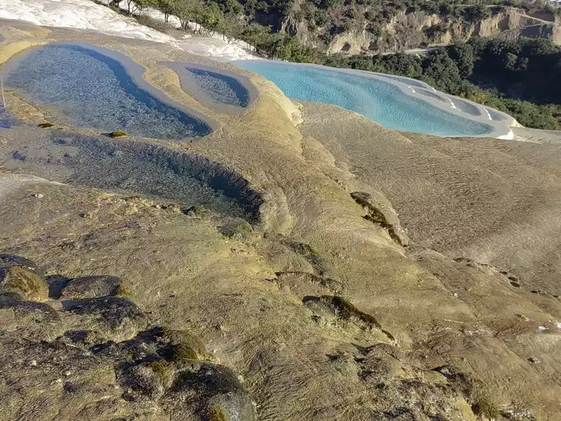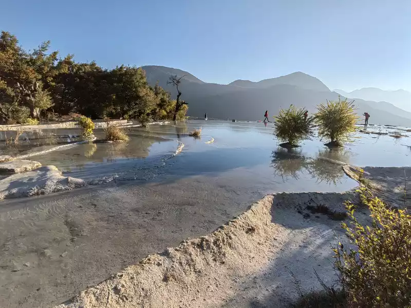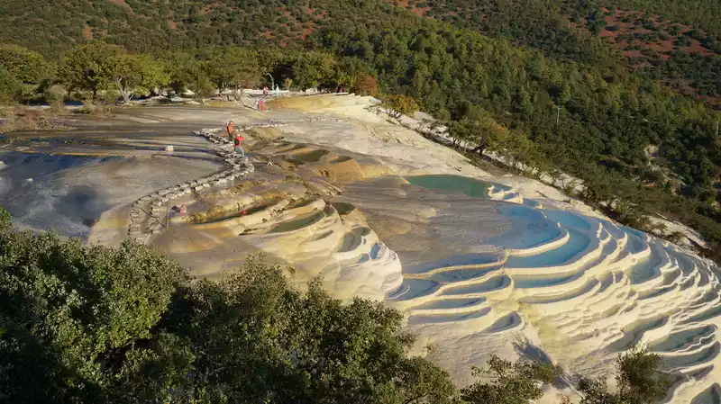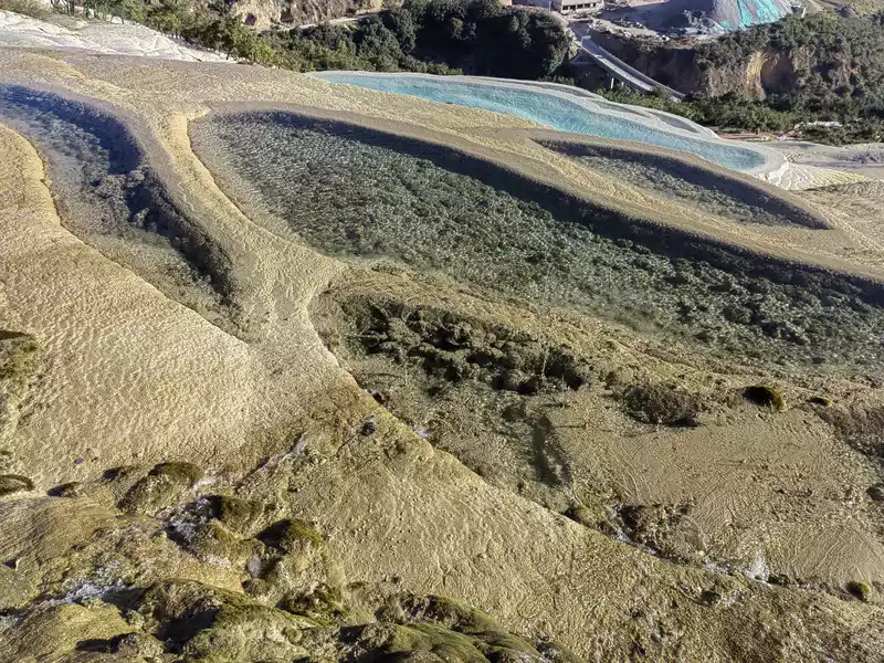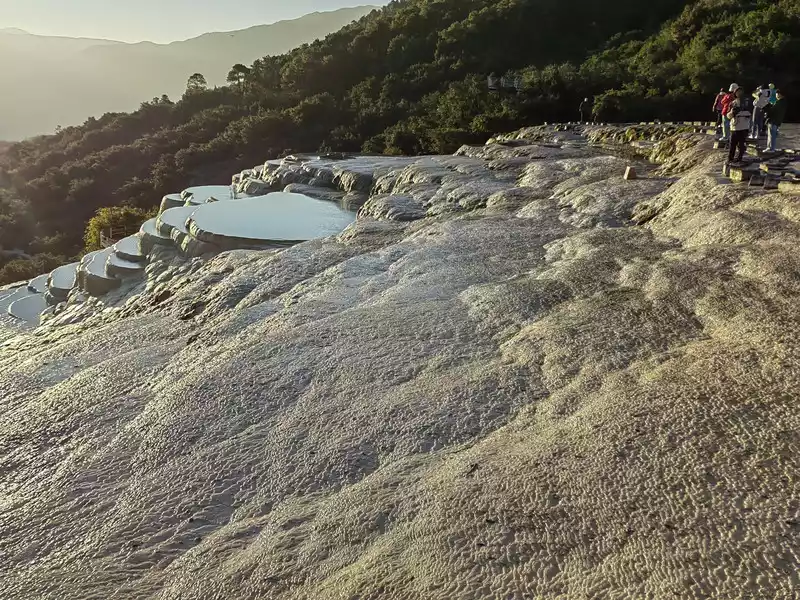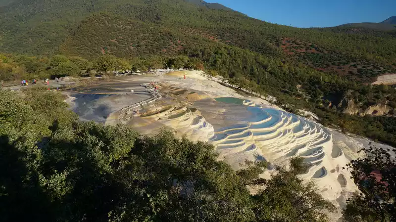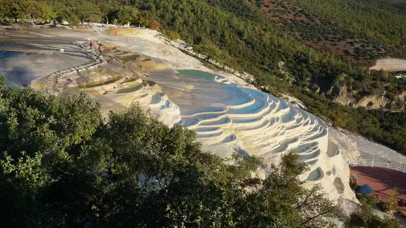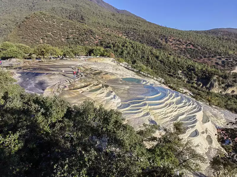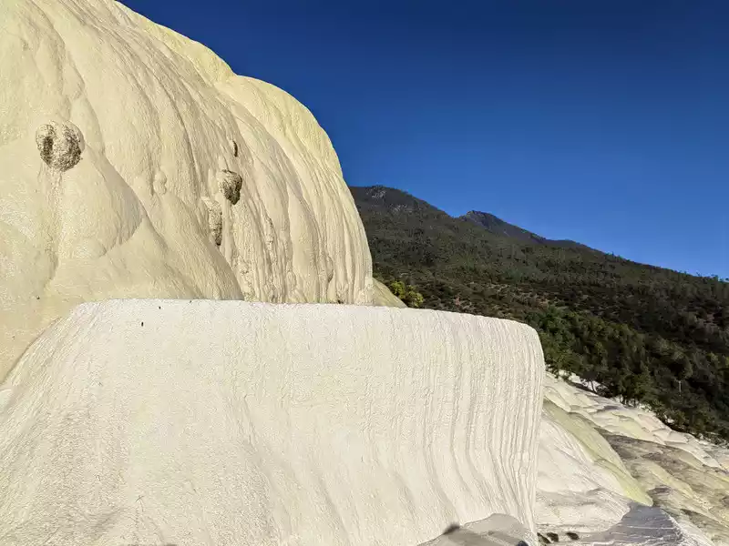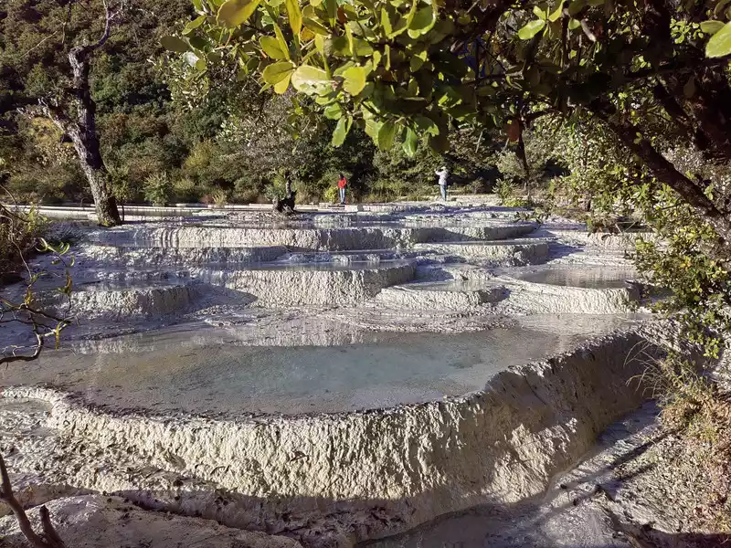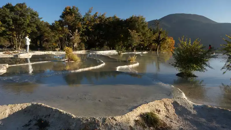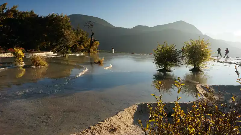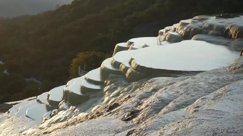 Baishuitai is a unique natural wonder, formed by calcium carbonate dissolving in spring water. As the spring water, rich in calcium carbonate, slowly flows down, the water evaporates and the calcium carbonate salts gradually precipitate, forming a white sediment called "quanhua," which covers the ground. Over the years, this accumulation forms a terraced surface, layered like terraced fields, earning it the nickname "the fields left behind by immortals." Baishuitai is the largest quanhua terrace in my country, covering approximately 3 square kilometers.