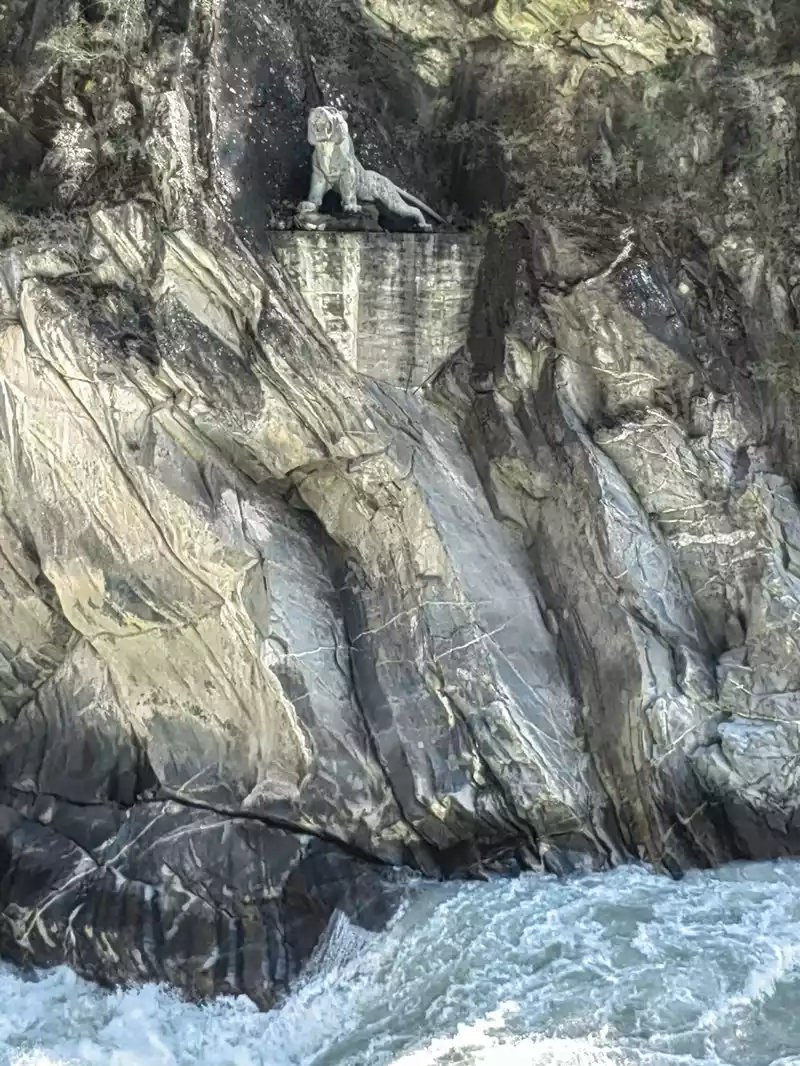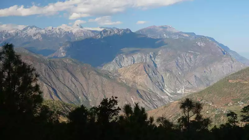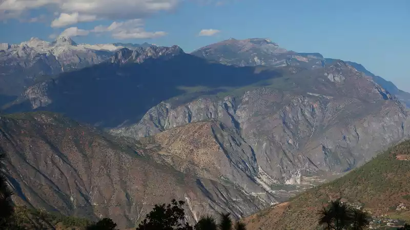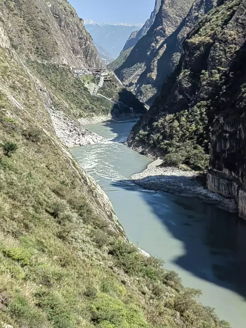 There is another Guanyin Temple on the way, but its gate is closed. From the observation deck, you can admire Haba Snow Mountain, Jade Dragon Snow Mountain, and the Jinsha River Gorge. To the left and front is Haba Snow Mountain, to the right is Jade Dragon Snow Mountain, and below is the Jinsha River. The Jinsha River flows through here, rushing towards the canyon between Haba Snow Mountain and Jade Dragon Snow Mountain. Tiger Leaping Gorge is the most dangerous section of the river.