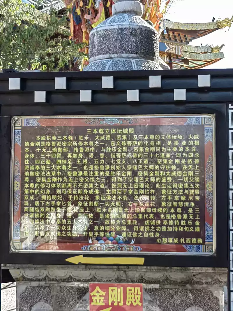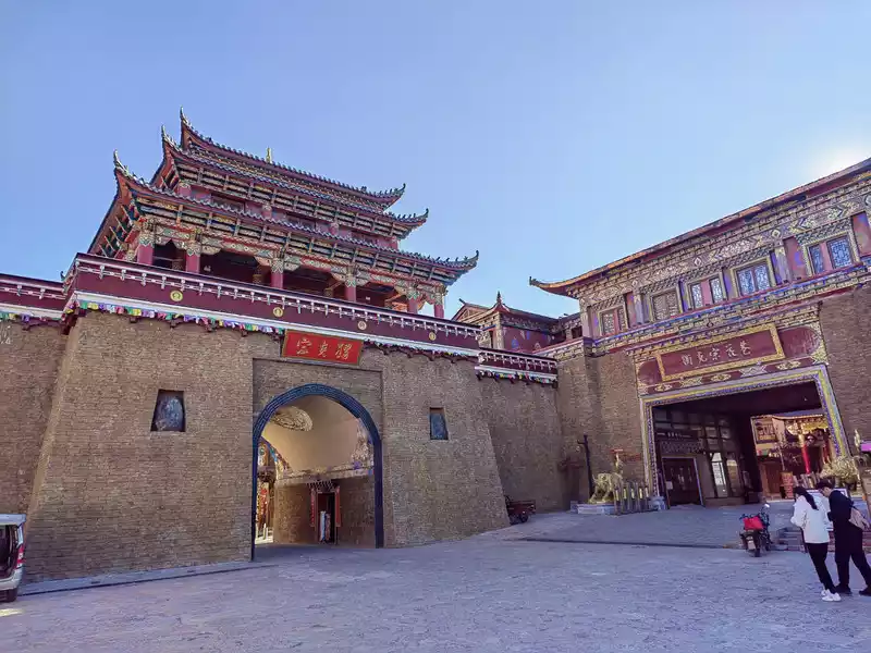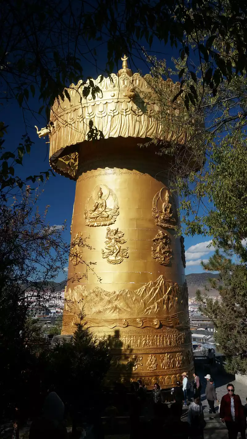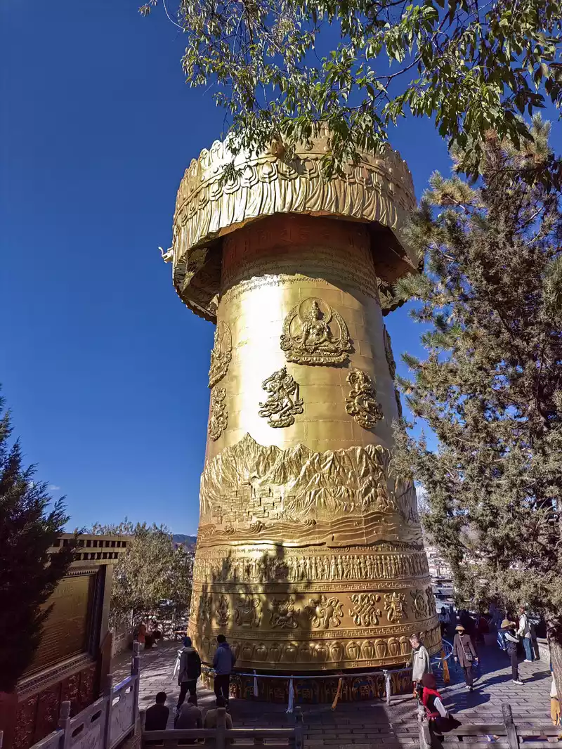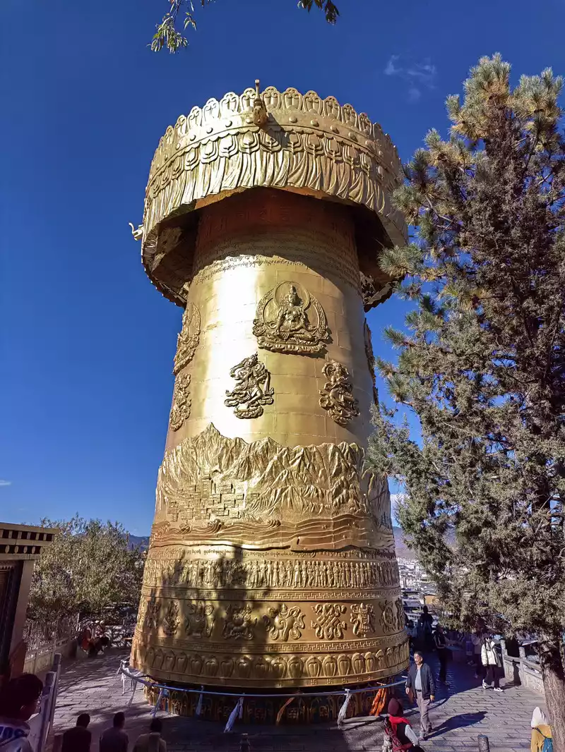 The most eye-catching thing in the temple is the world's largest prayer wheel recorded in the Guinness Book of World Records. It is 21 meters high and weighs 60 tons. It is made entirely of pure copper and is plated with real gold. The four Bodhisattvas Manjusri, Samantabhadra, Avalokitesvara and Ksitigarbha are engraved in relief on the upper end of the cylinder. The eight treasures of Buddhism are engraved on the lower end. There are also 1.24 million sutras, mantras, wordless mantras and various Buddhist treasures hidden inside the cylinder, with a total weight of about 16 tons. To turn such a huge prayer tube requires the efforts of more than ten people at the same time. Each round of rotation is equivalent to silently chanting the Buddha's name 1.24 million times. After three weeks of turning, it can eliminate disasters and pray for good luck.