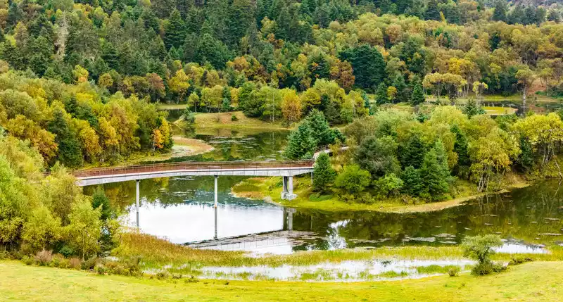 The park boasts a poetic, refreshing, and dreamy landscape encompassing forests, alpine meadows, wetland lakes, geological relics, fault cliffs, forest streams, and deep canyons. Its beauty changes with each season and weather.