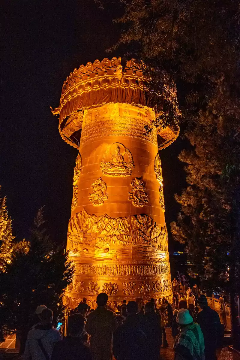 The Auspicious Ruyi Tower, located on the north side of Big Turtle Mountain, is one of Shangri-La's iconic attractions. With a base 10 meters in diameter and 21 meters high, it weighs 60 tons and is copper-plated with exquisite relief carvings.