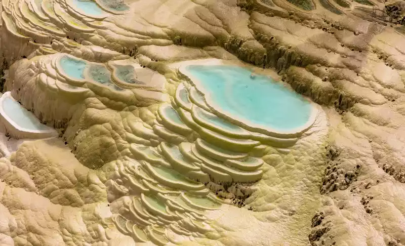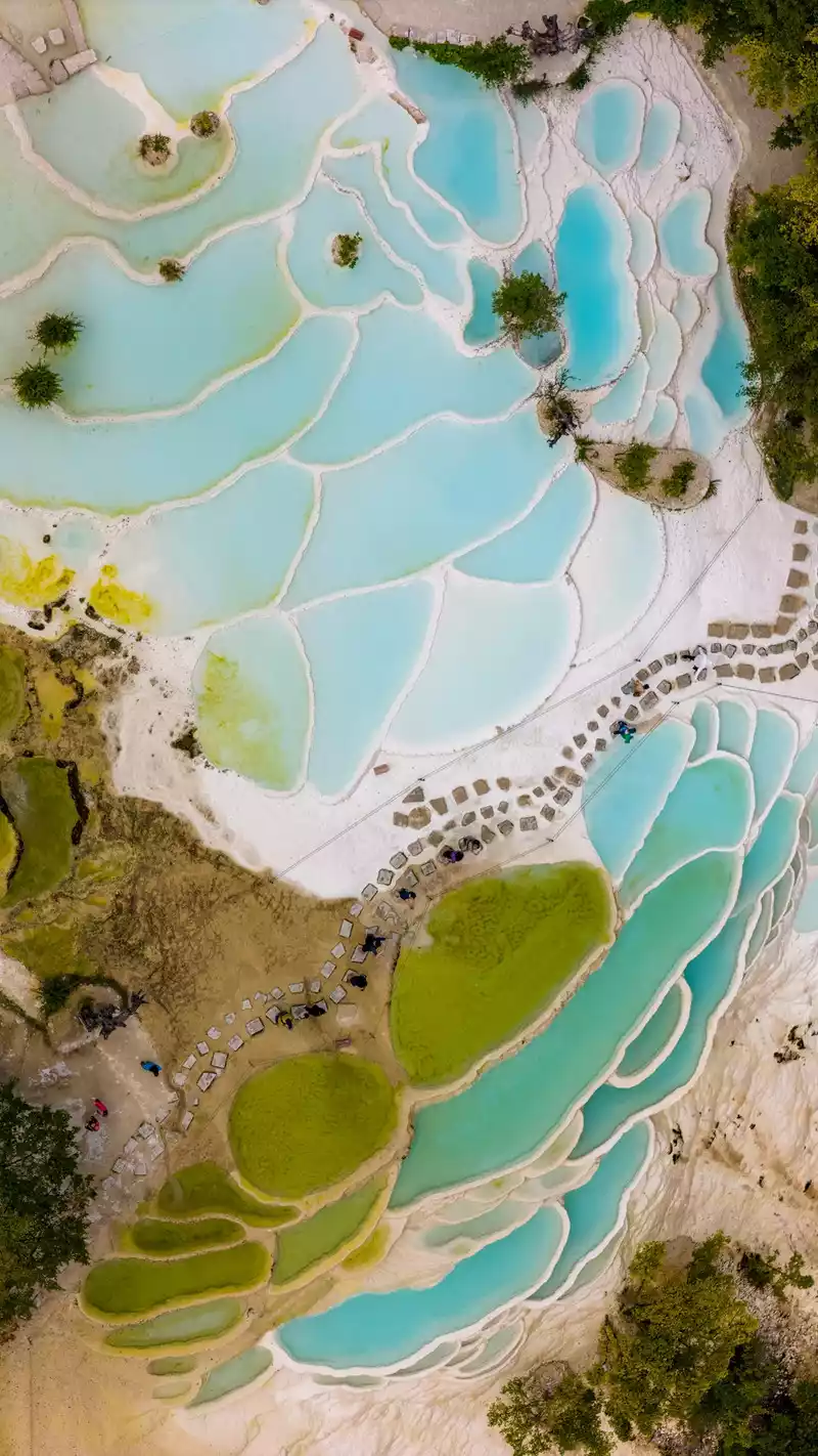 The travertine pools cascade layer upon layer, with water cascading down from the heights, like sweet spring water flowing from the Milky Way to the human world.