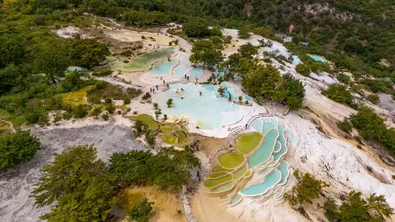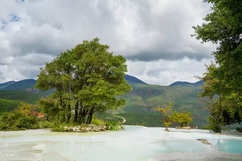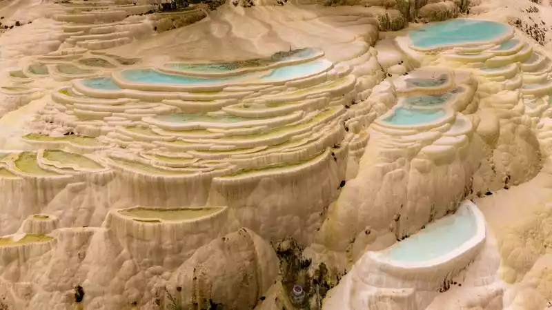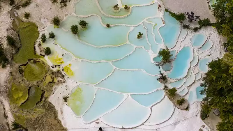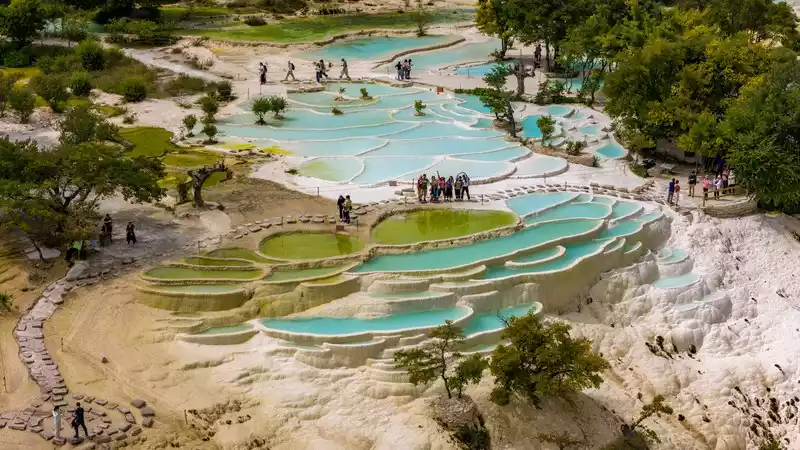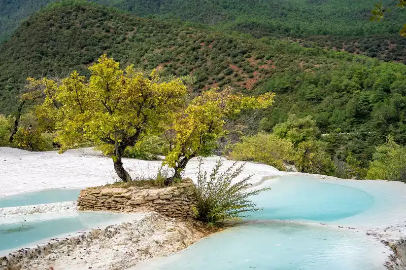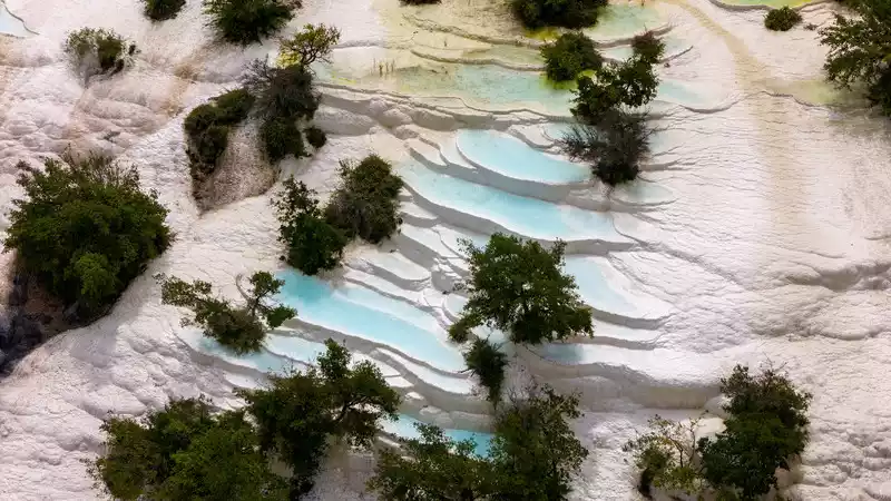 Travertine pools of varying sizes and shapes are like priceless jade inlaid on the hilltop.
